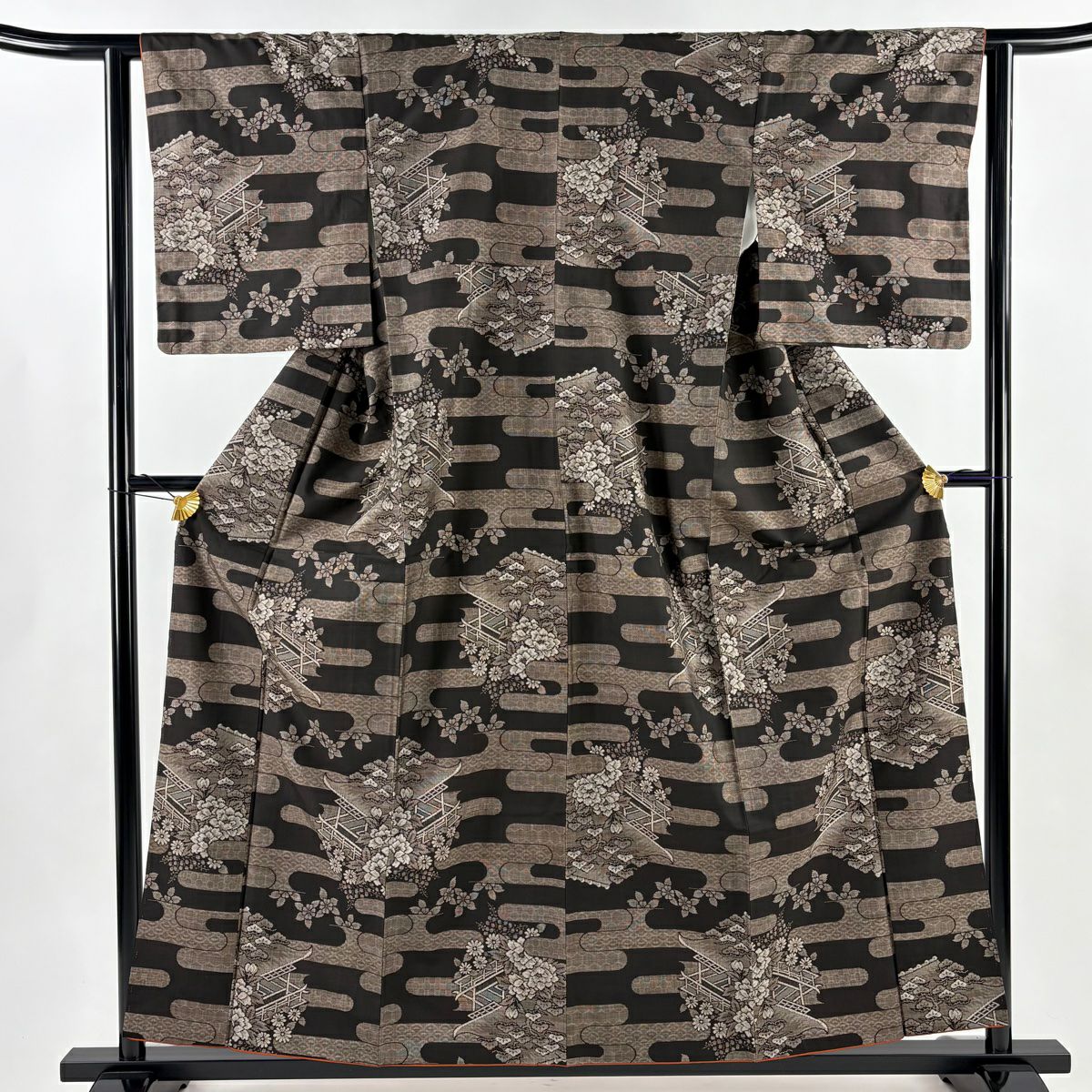 【在庫一掃】 【美品】 紬 身丈153.5cm 裄丈62cm S 袷 バチ衿 家屋 水車 焦茶色 正絹 秀品