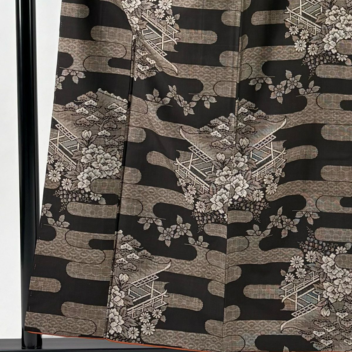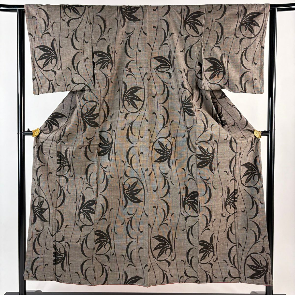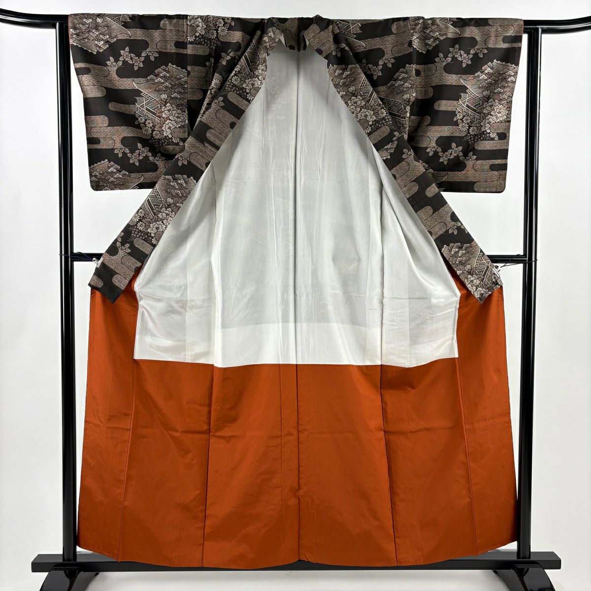 【在庫一掃】 【美品】 紬 身丈161cm 裄丈64cm M 袷 やまと 草花 シルエット 焦茶色 正絹 秀品
