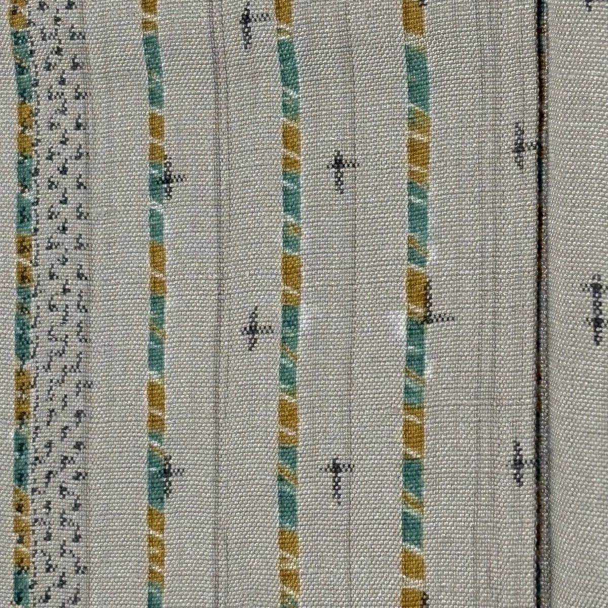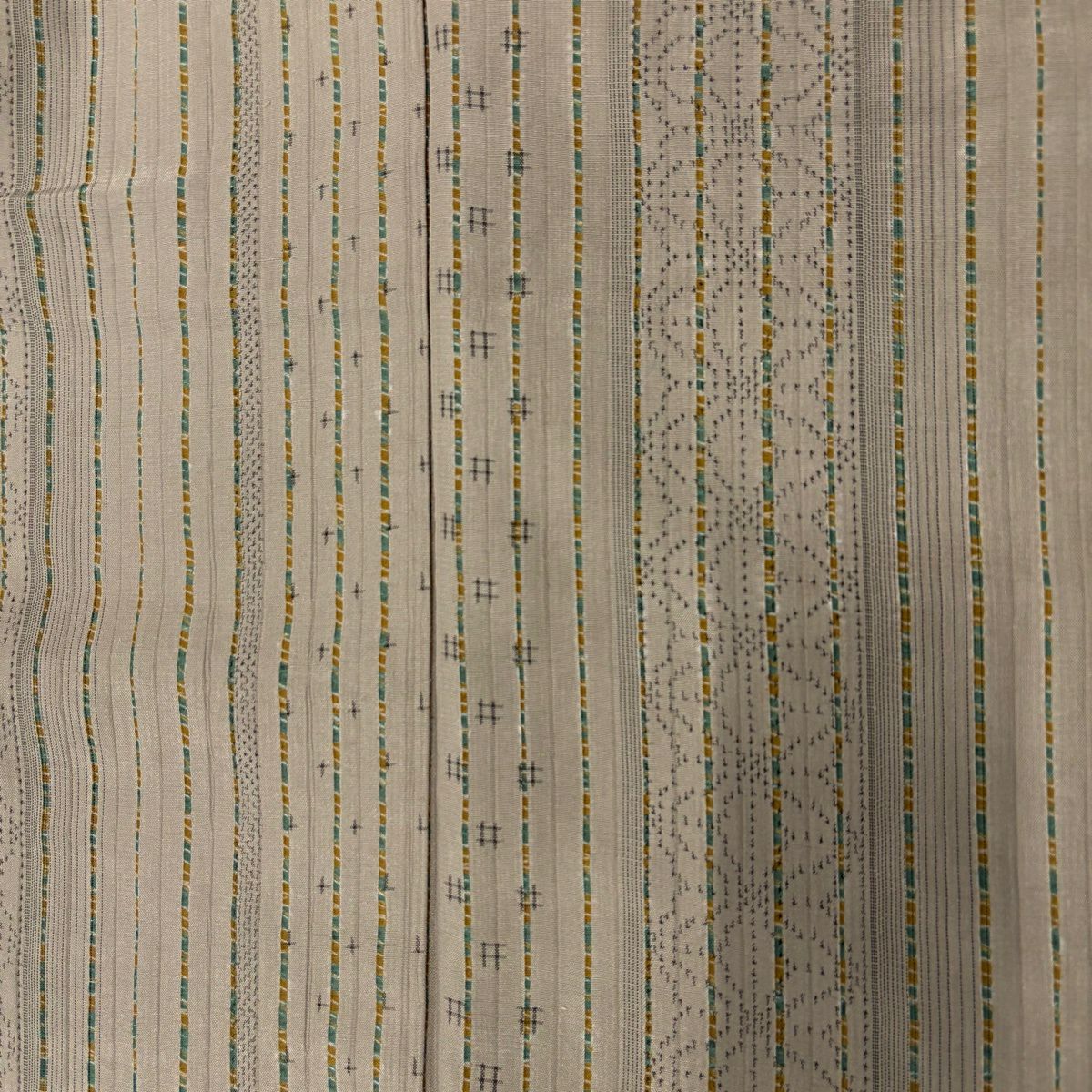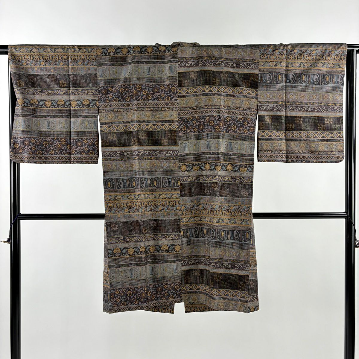 【最終値引き】 77%OFF 【美品】 袋帯 秀品 段縞 幾何学模様 金糸 綴れ 金茶 お太鼓柄 正絹 K70