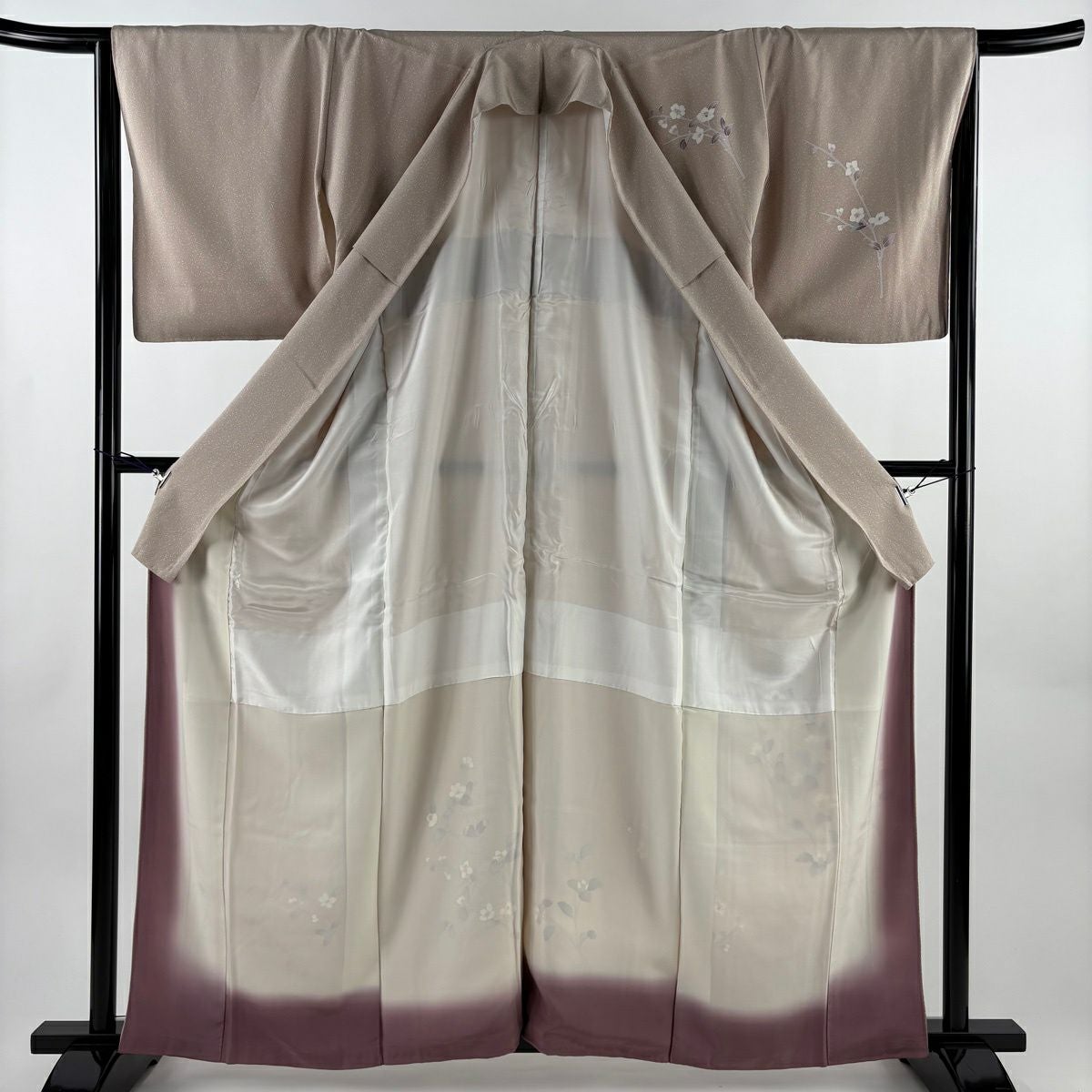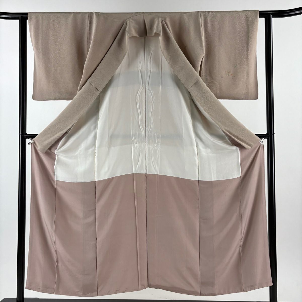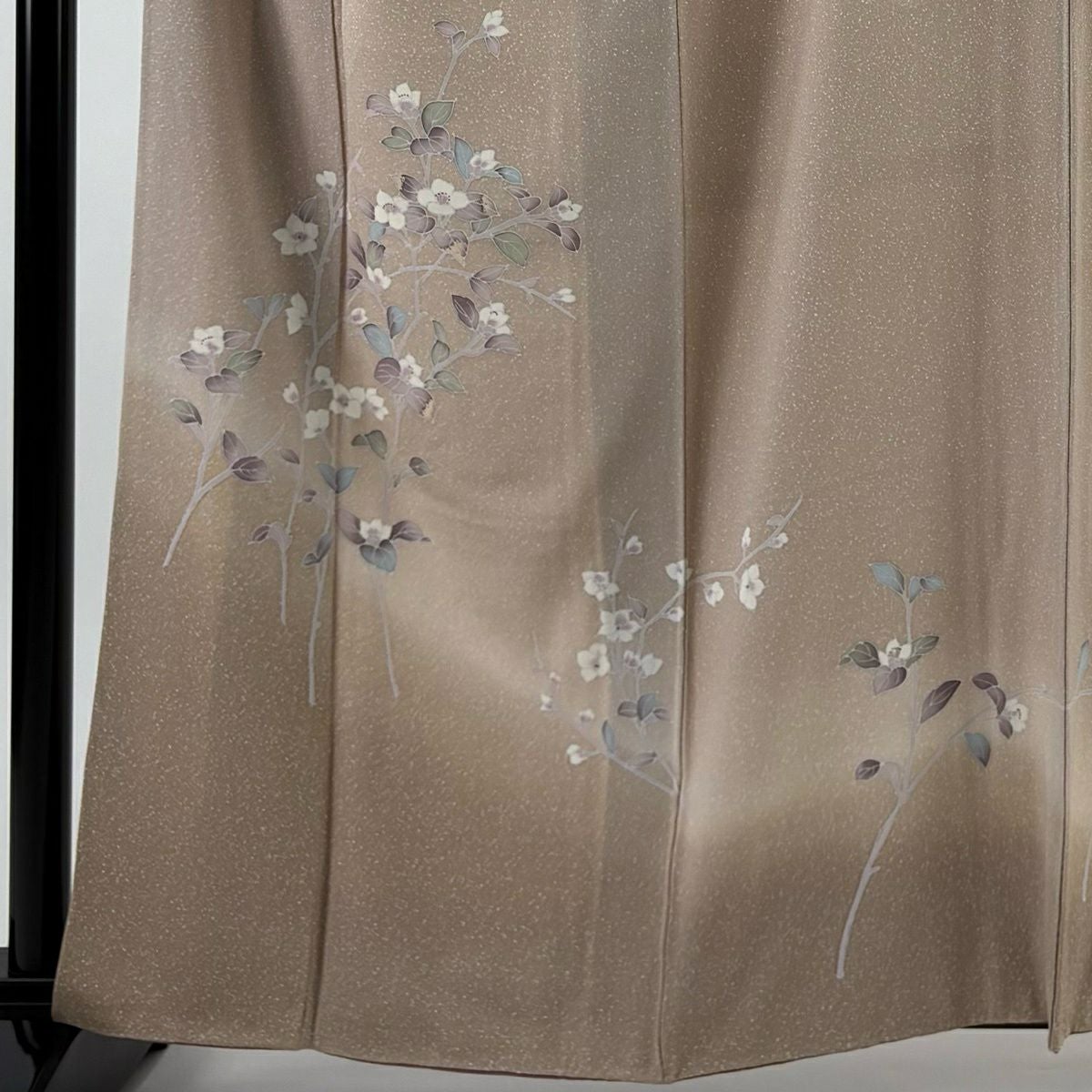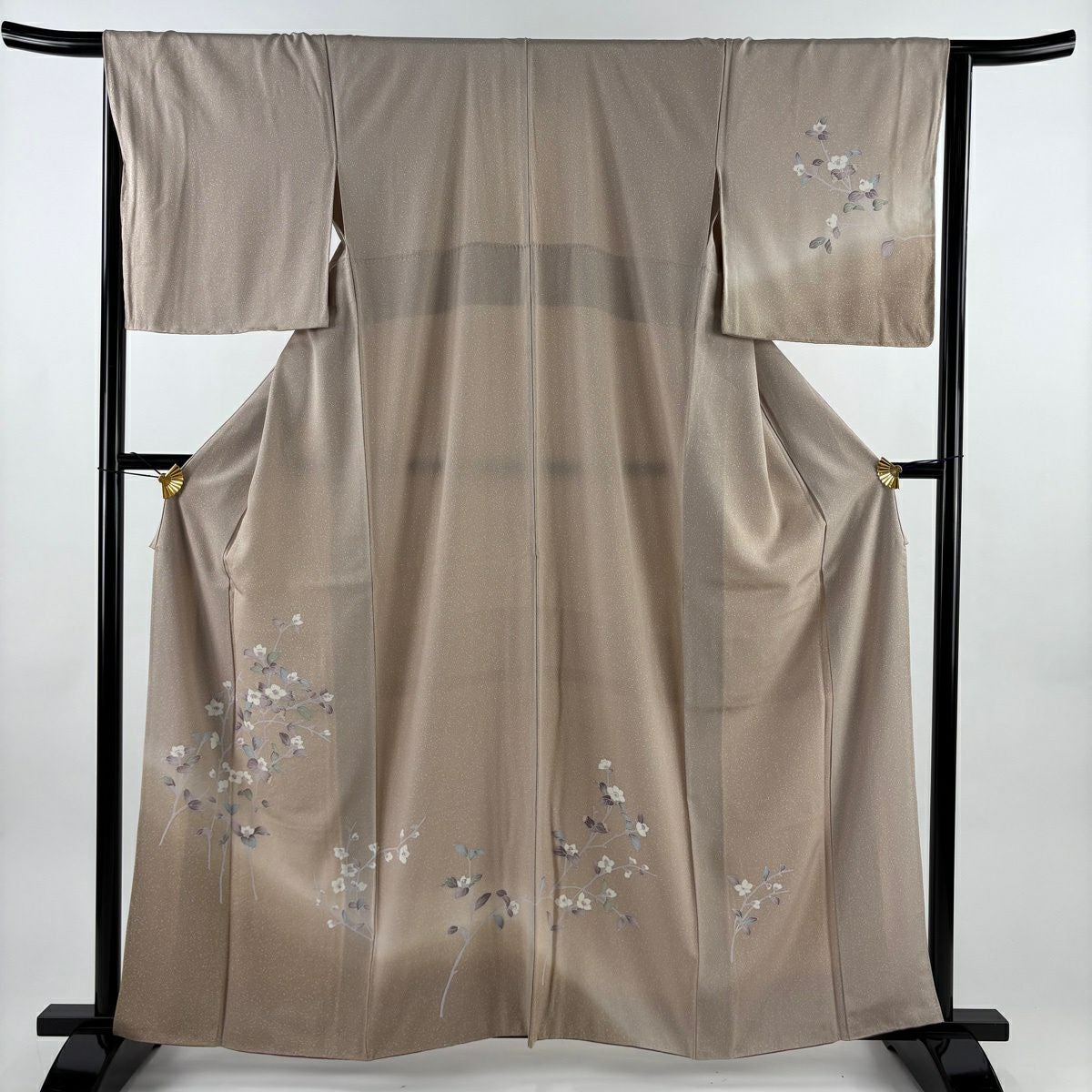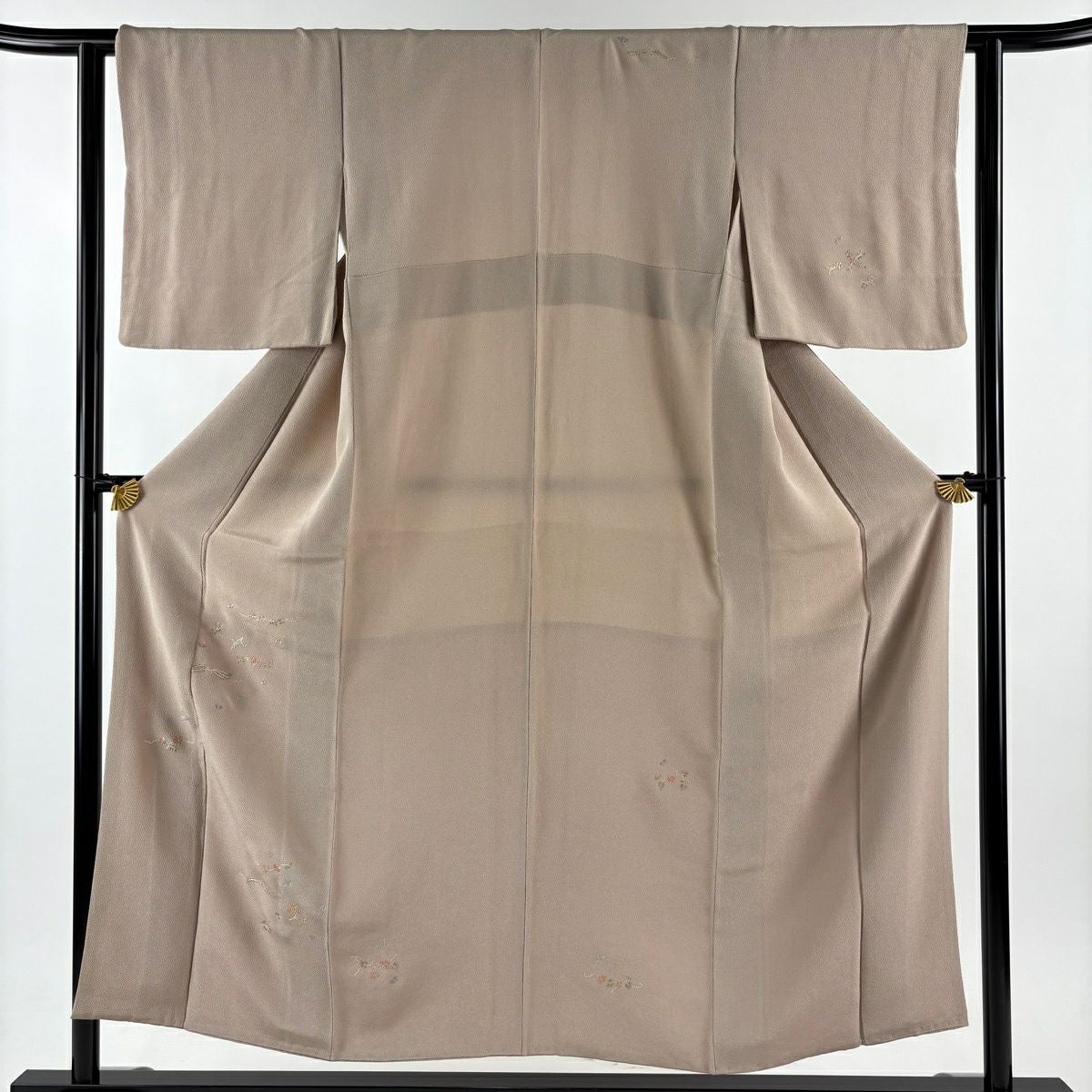 【在庫一掃】 付下げ 身丈152cm 裄丈63cm S 袷 扇 草花 刺繍 絞り 薄茶色 正絹 秀品 一つ紋