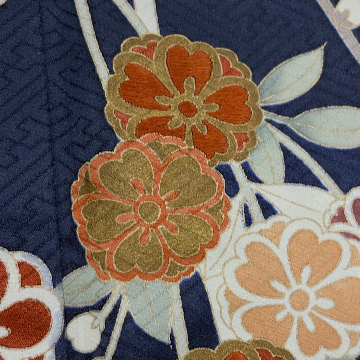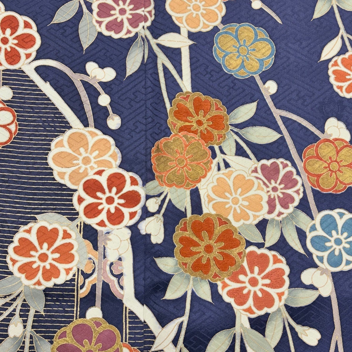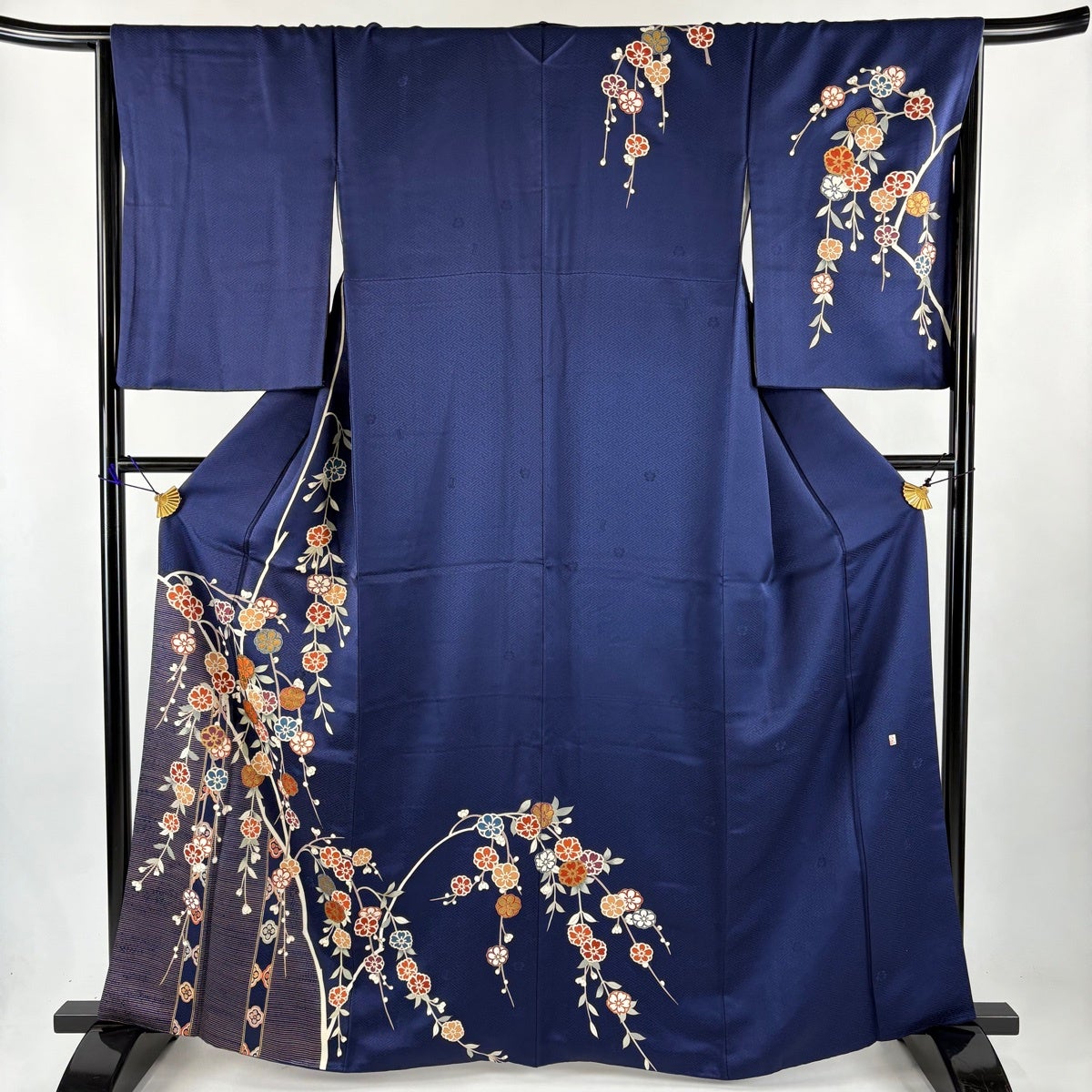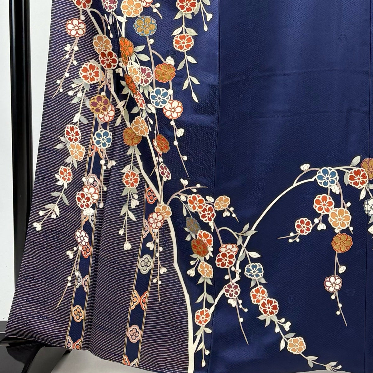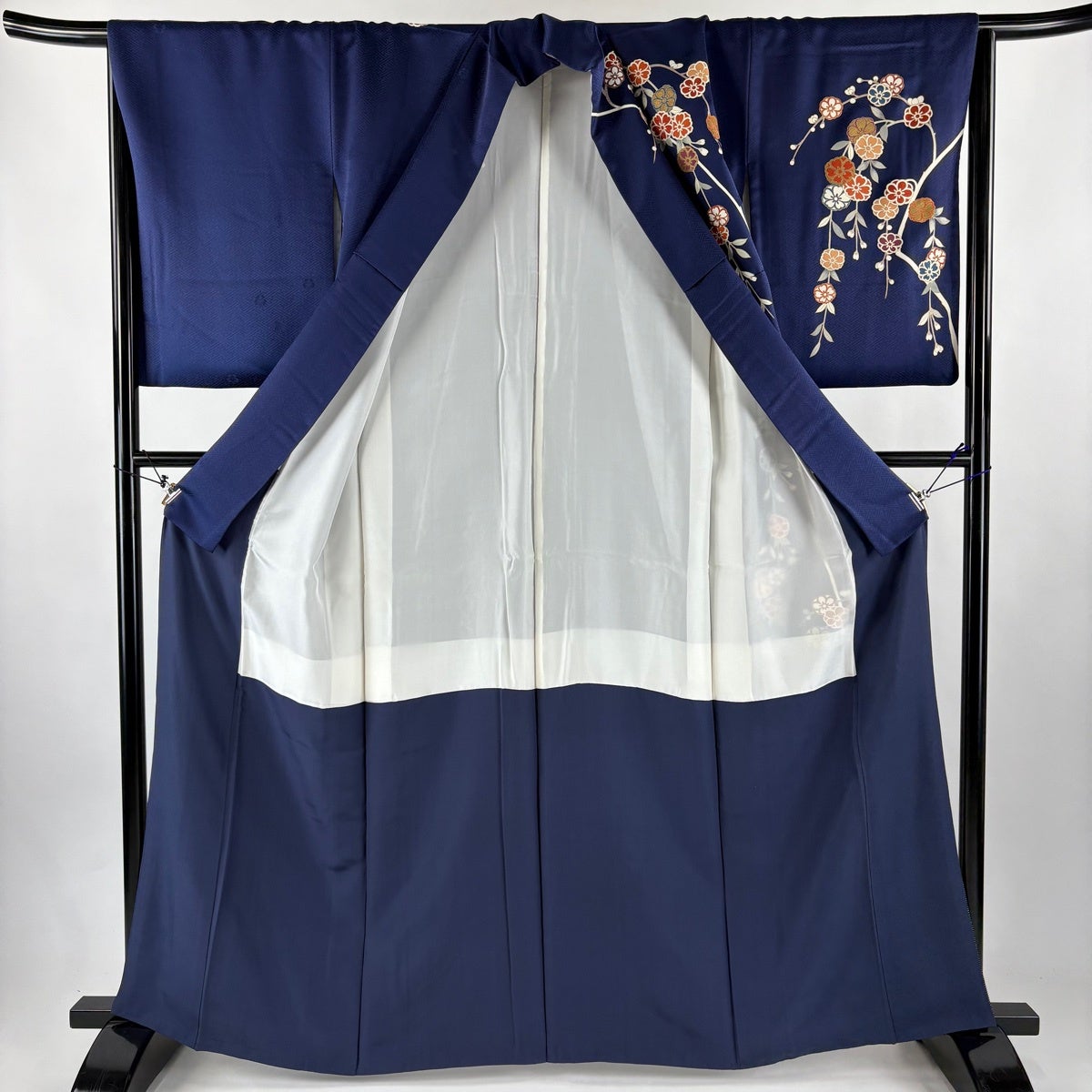 訪問着 身丈164.5cm 裄丈66cm M 袷 吾妻徳穂 落款あり 枝梅 枝垂桜 金彩 刺繍 紺色 正絹 秀品