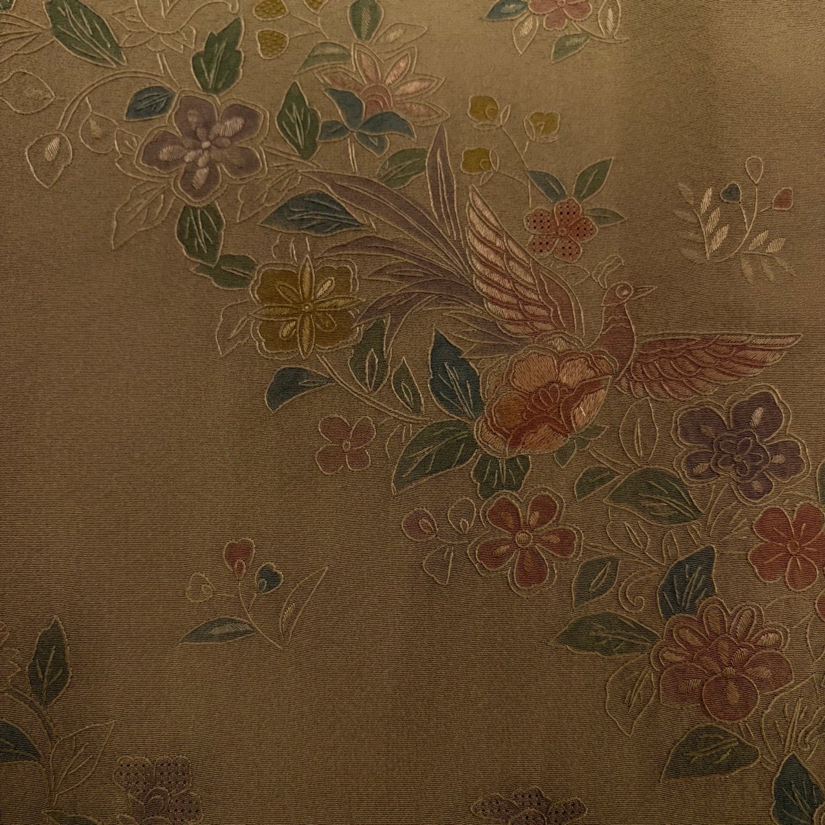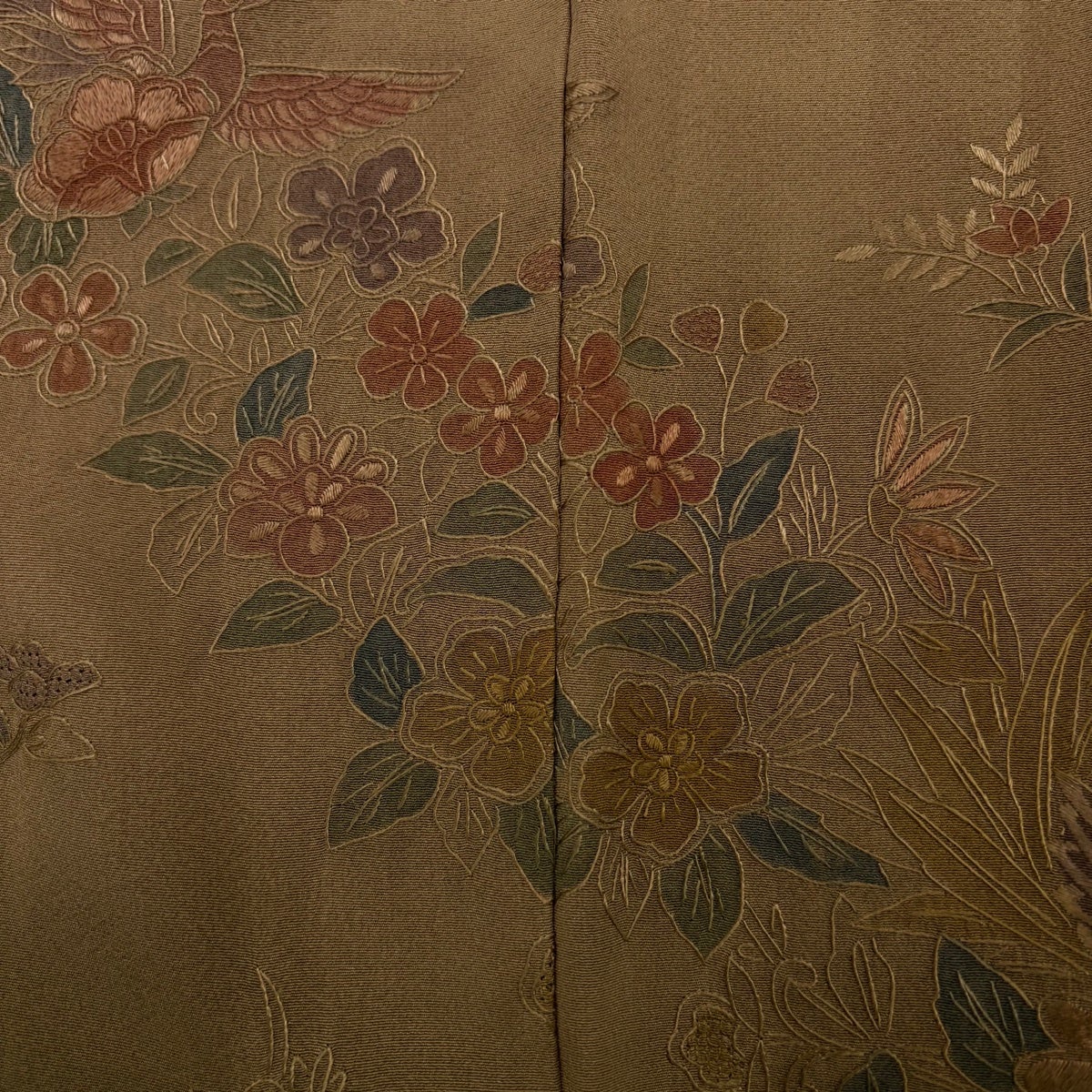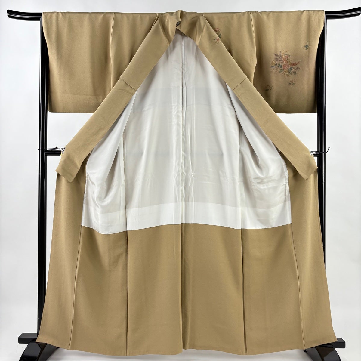 【美品】 訪問着 身丈161.5cm 裄丈66cm M 袷 草花 鳥 刺繍 ぼかし 薄茶色 正絹 秀品 一つ紋