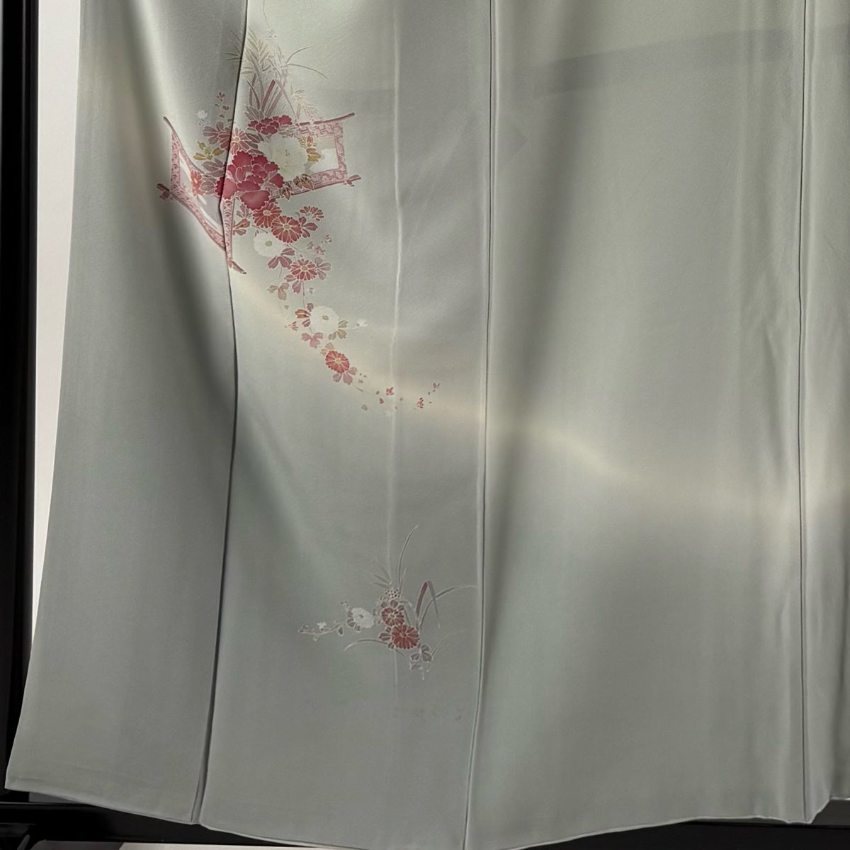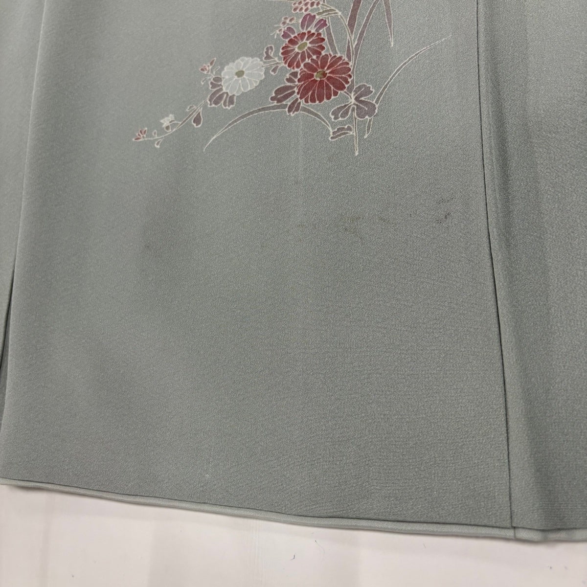訪問着 身丈159cm 裄丈65.5cm M 袷 落款あり 草花 萩 金銀彩 ぼかし 薄緑 正絹 秀品 一つ紋