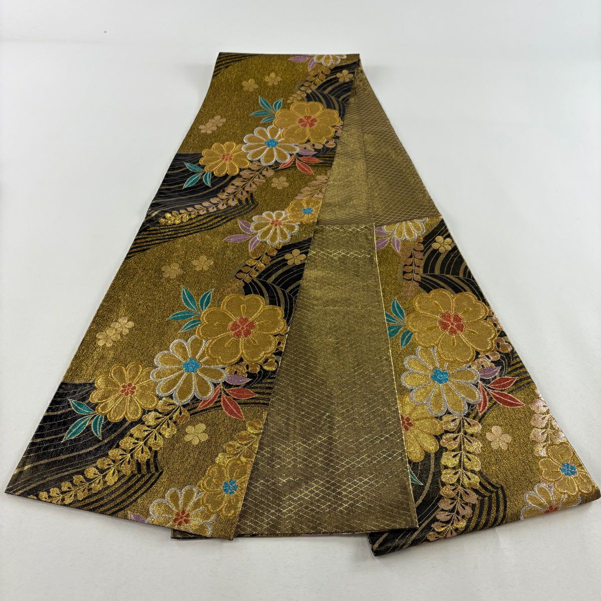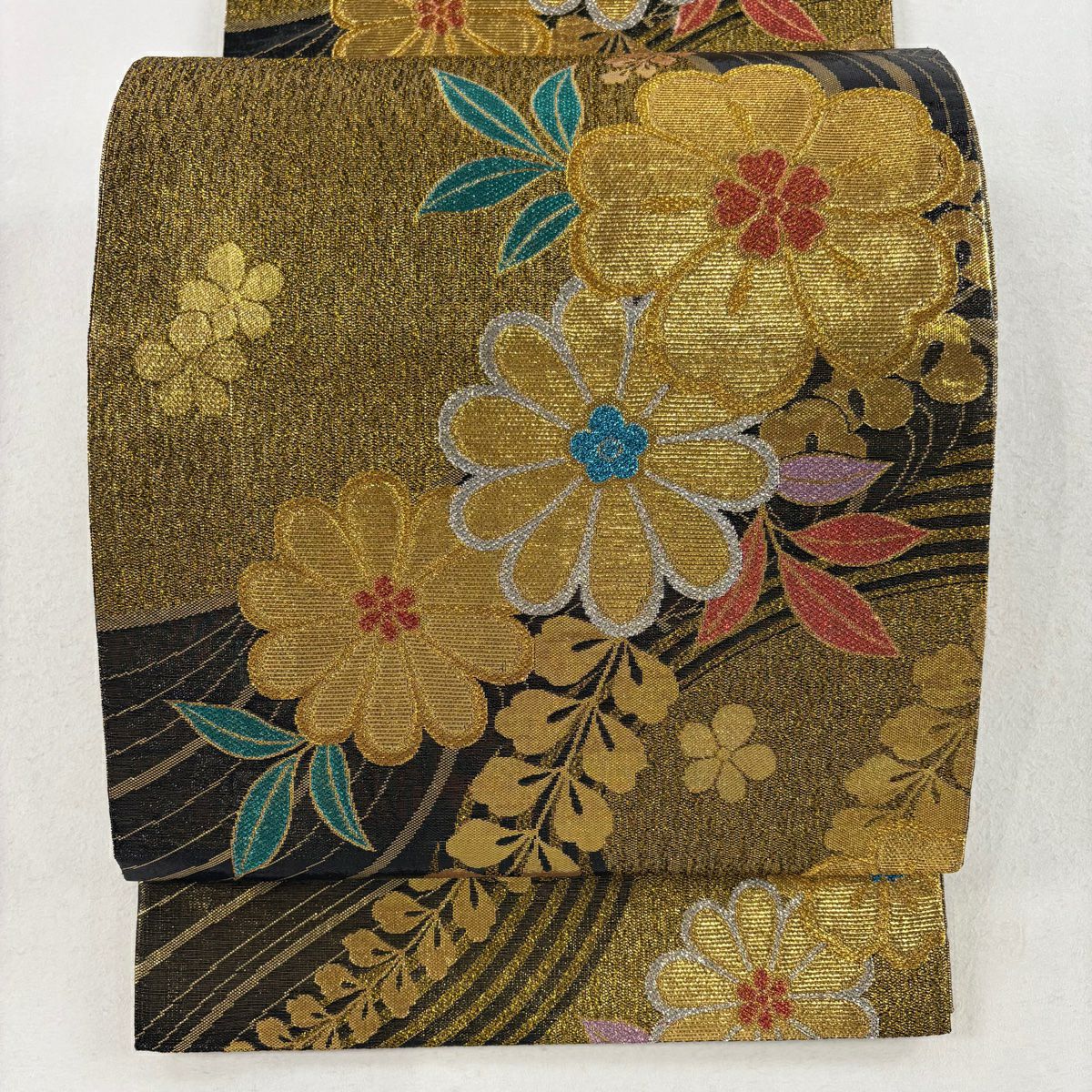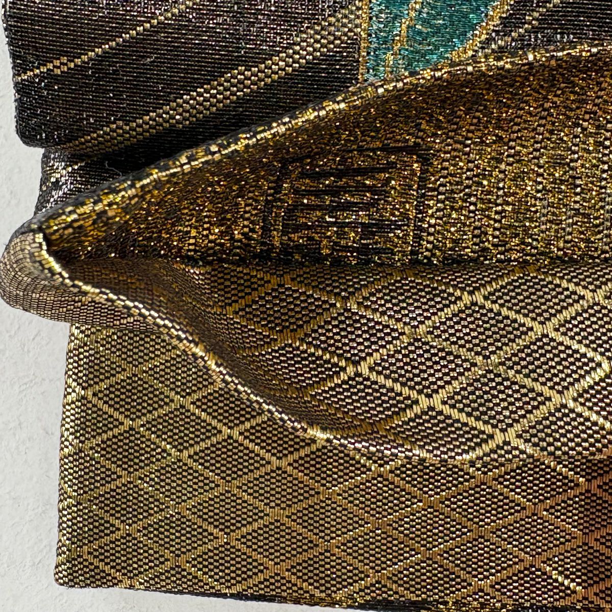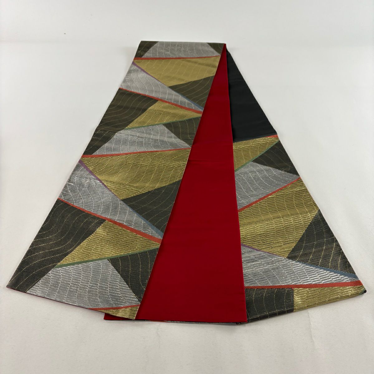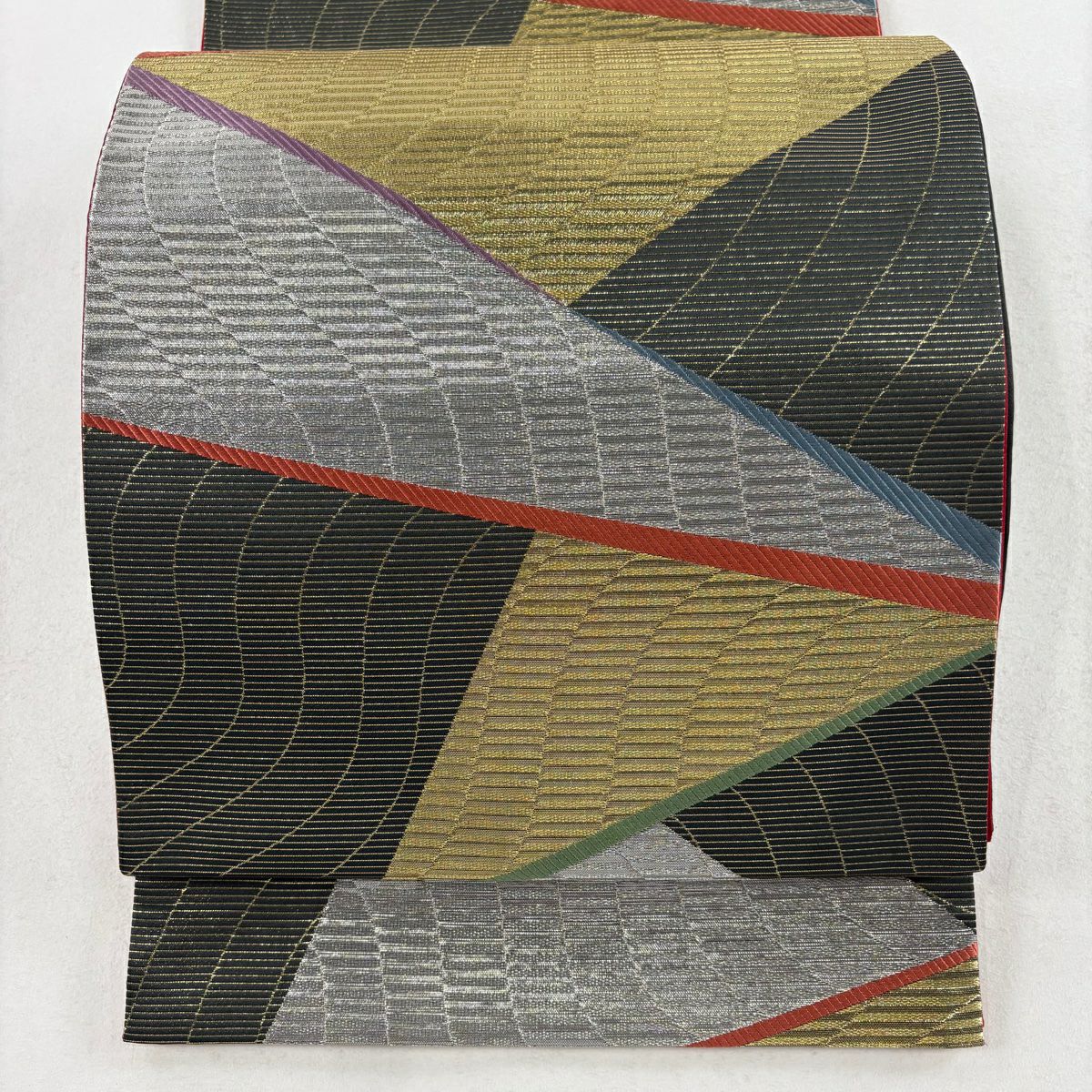 【最終値引き】 76%OFF 袋帯 美品 秀品 よろけ縞 幾何学模様 金銀糸 箔 墨色 六通 正絹 K70