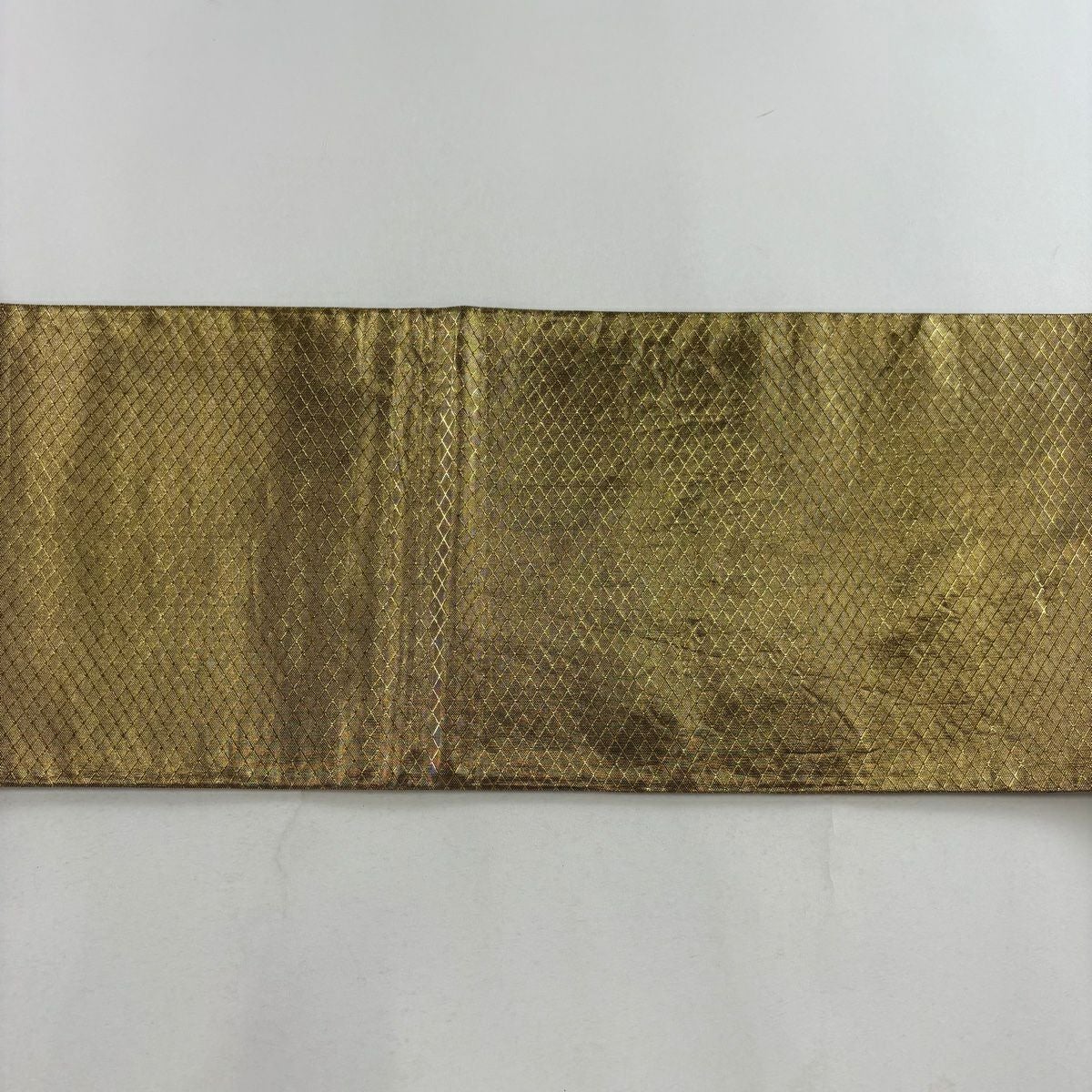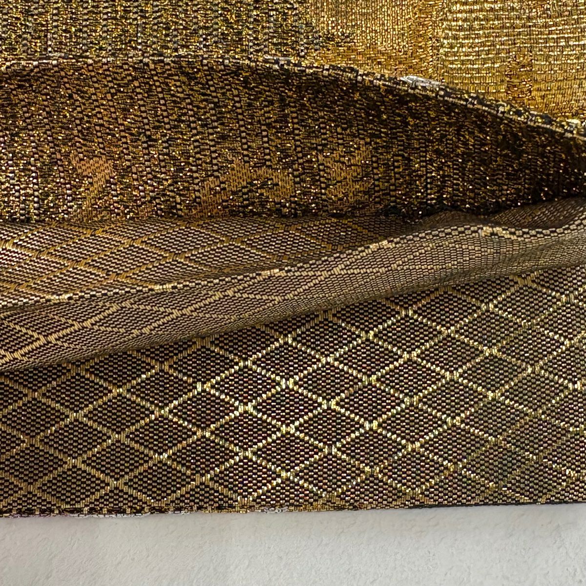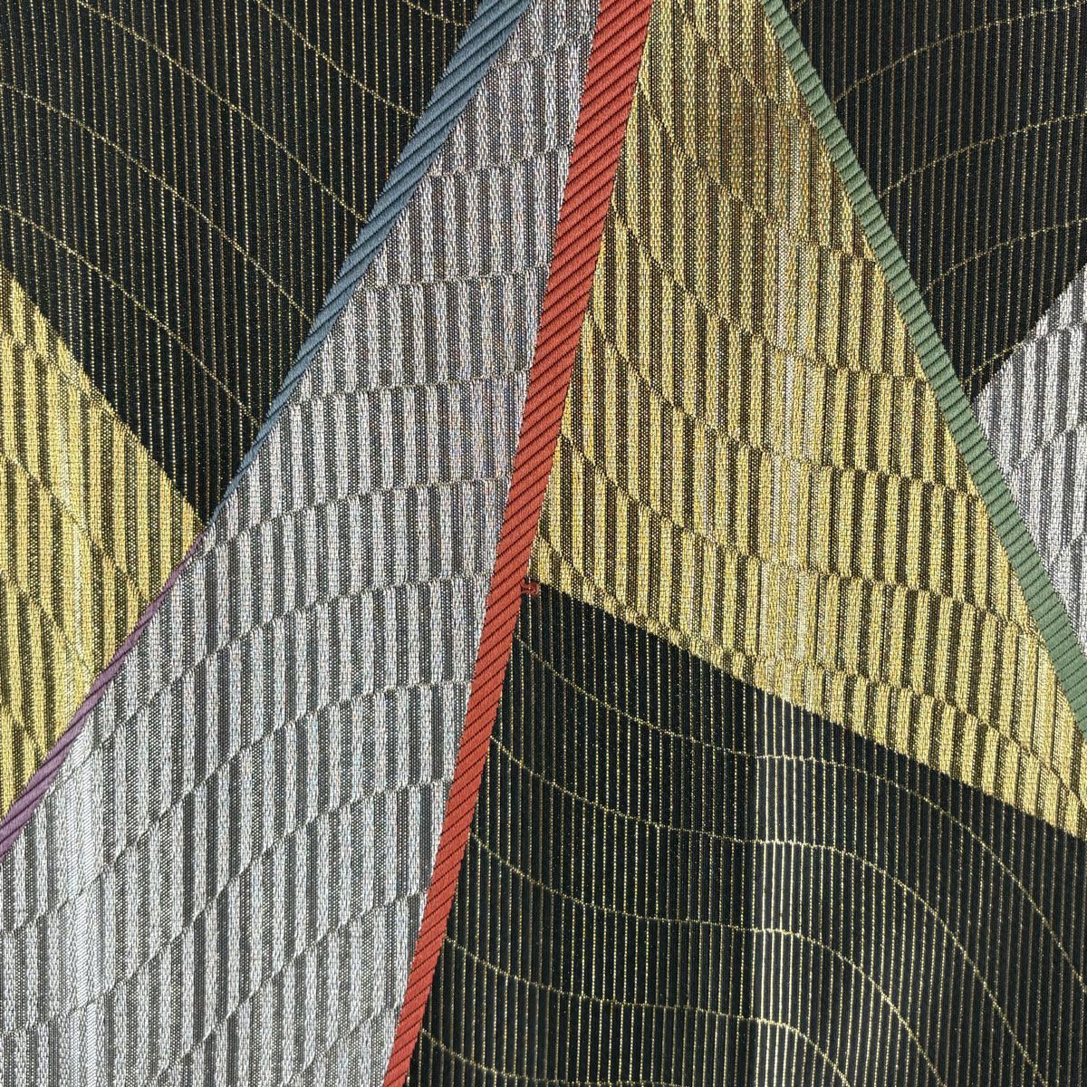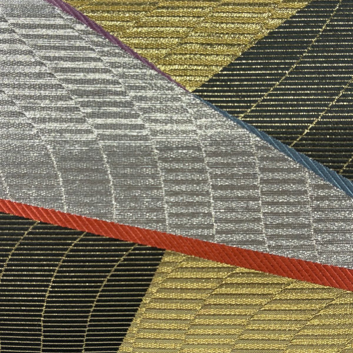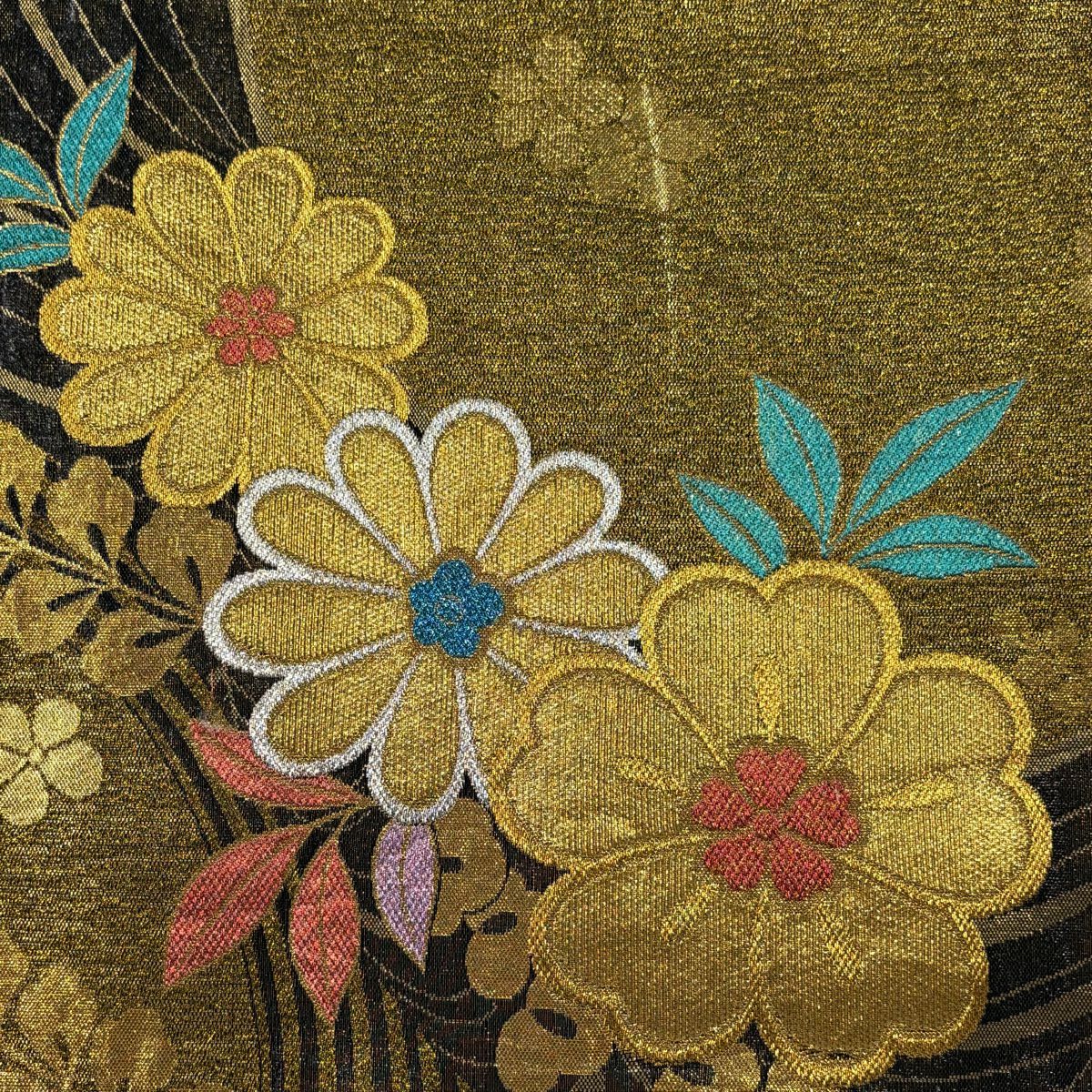 【最終値引き】 76%OFF 袋帯 美品 秀品 よろけ縞 幾何学模様 金銀糸 箔 墨色 六通 正絹 K70