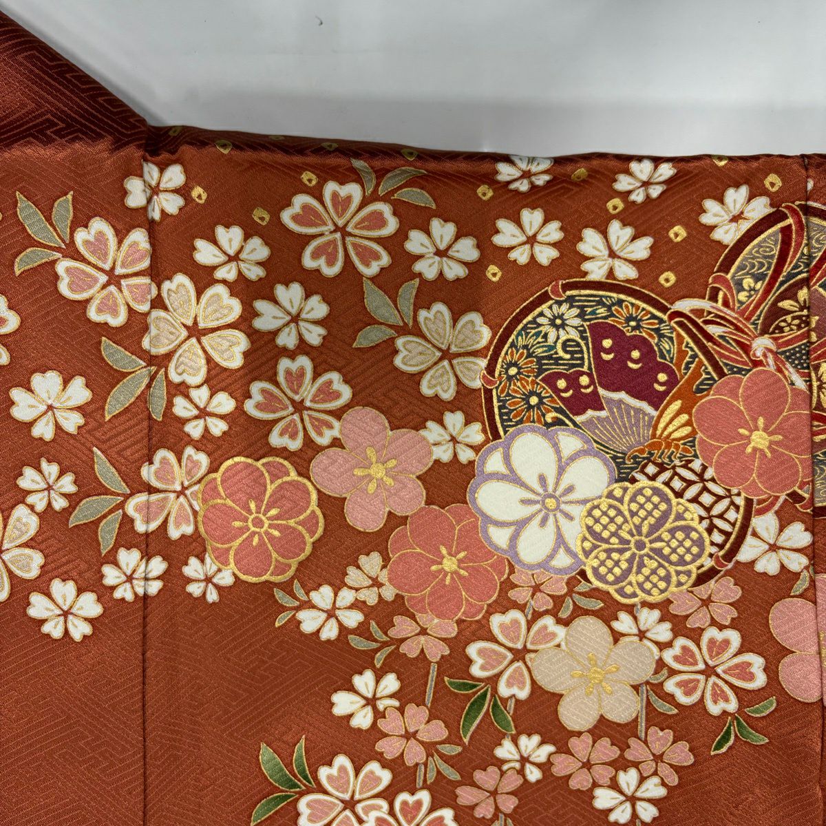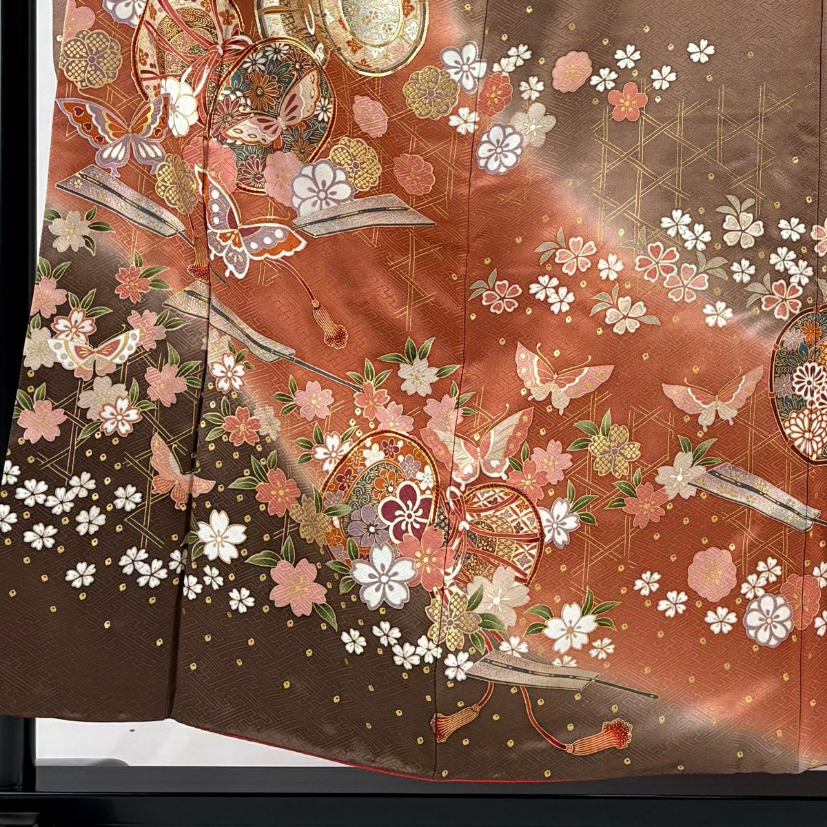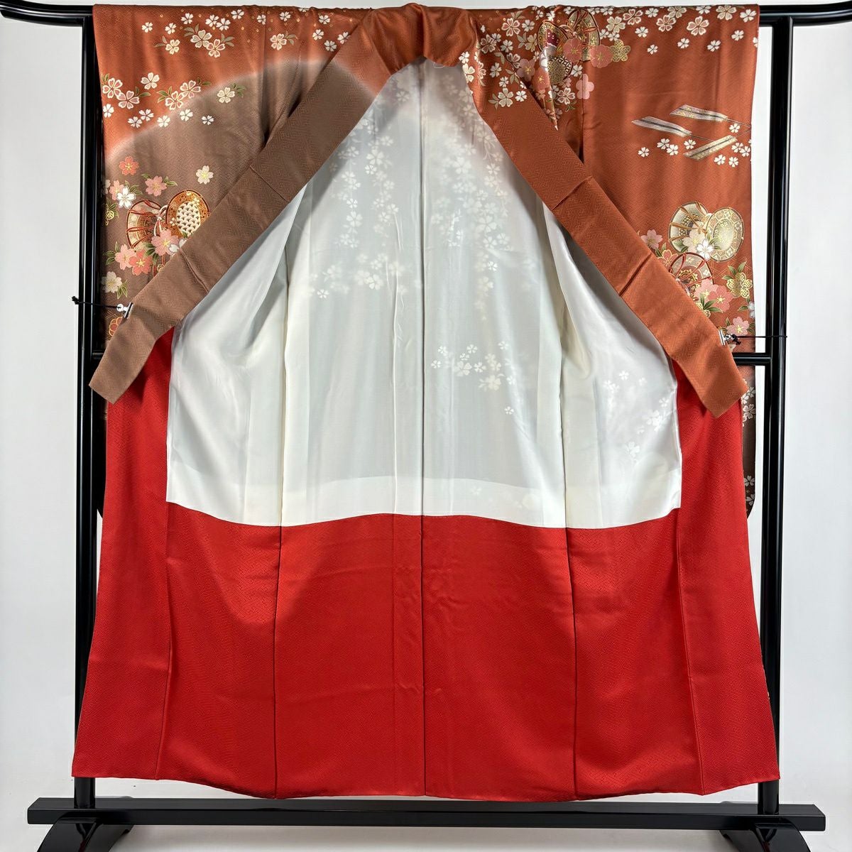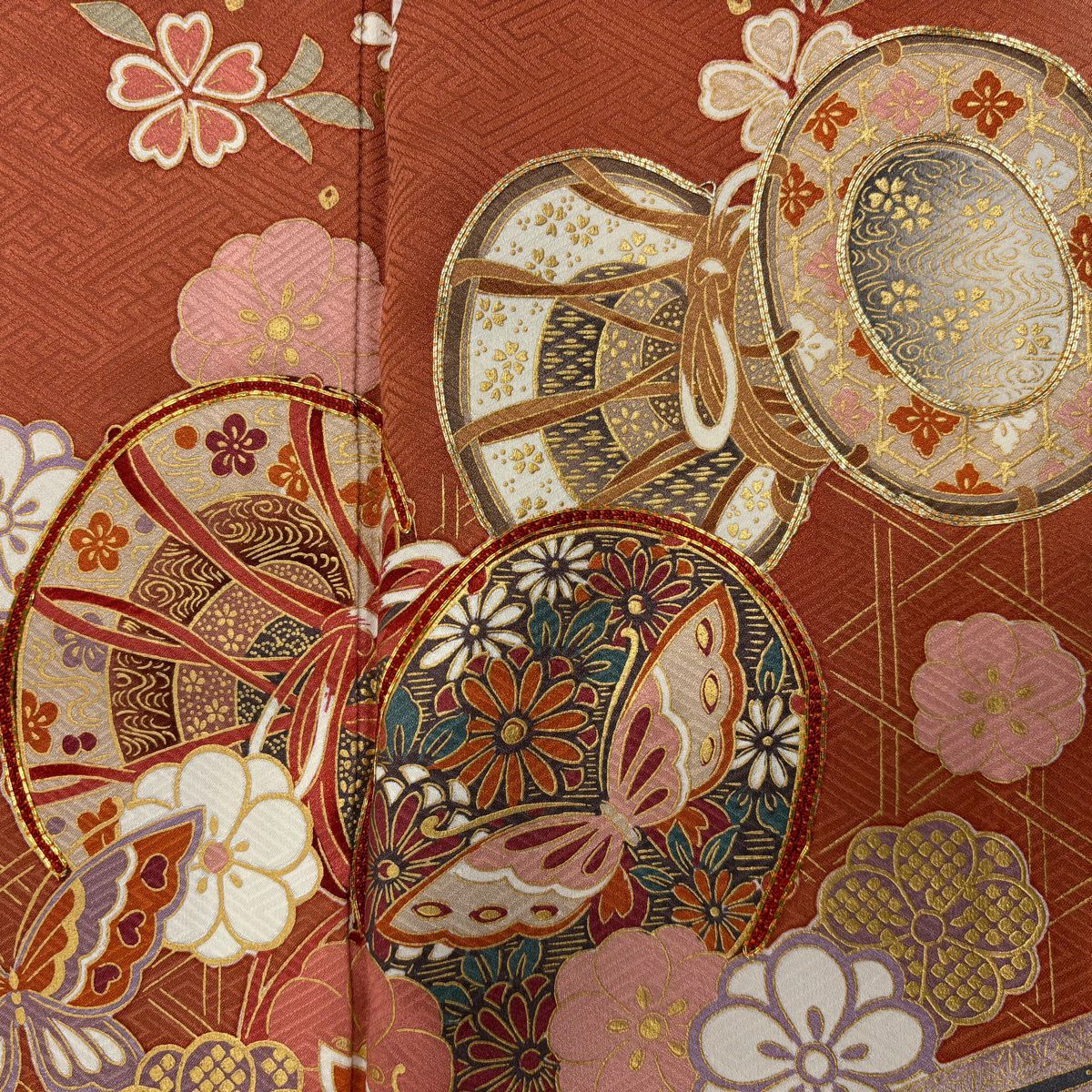 30%OFF 【美品】 振袖 身丈155cm 裄丈64cm M 袷 鼓 蝶 金糸 金彩 赤茶 正絹 秀品 K30