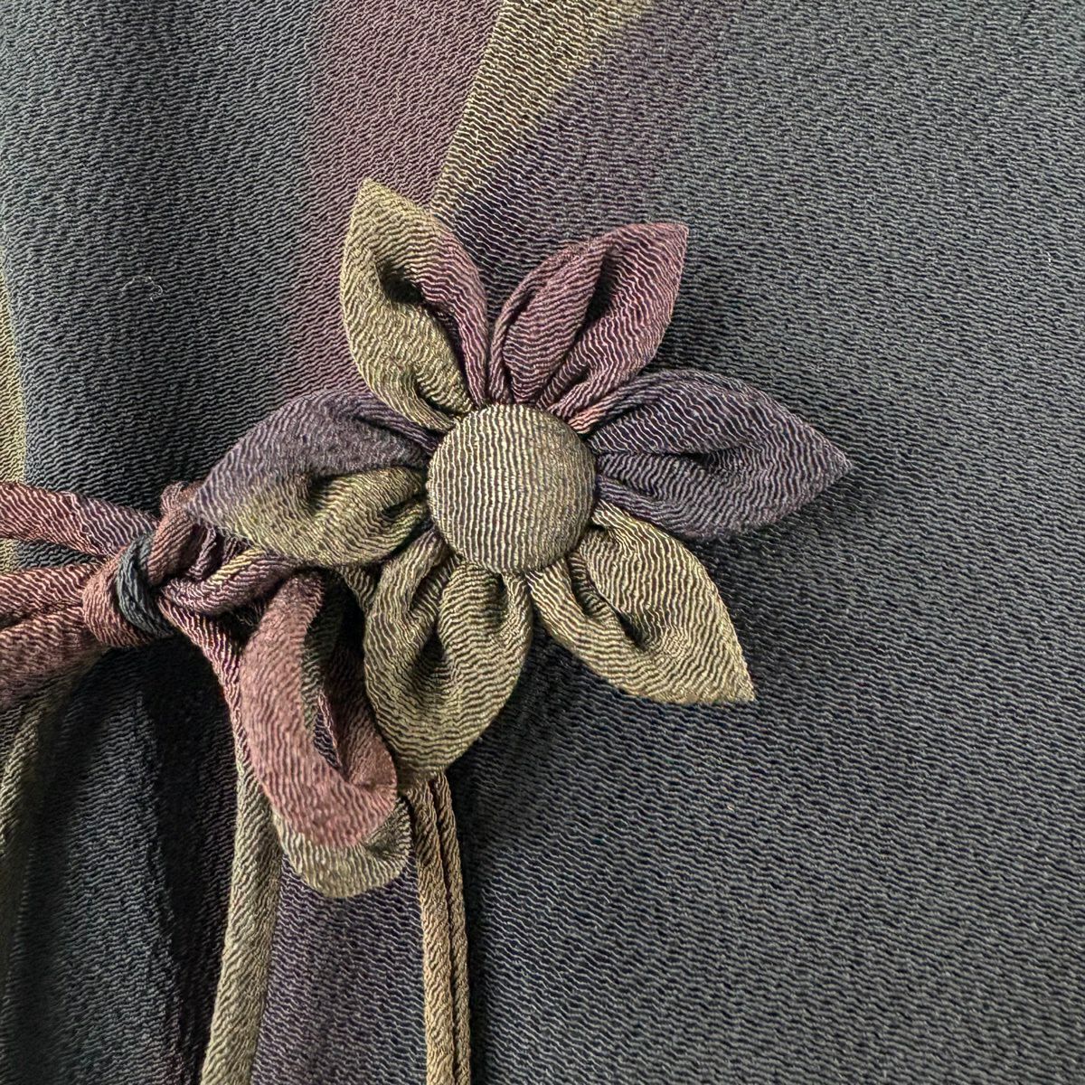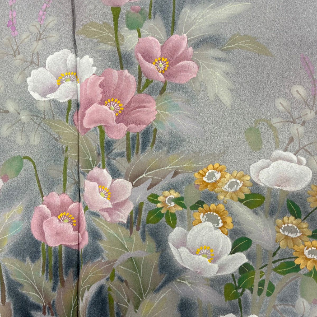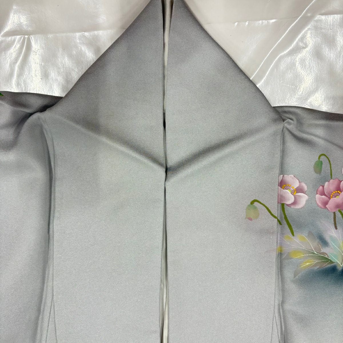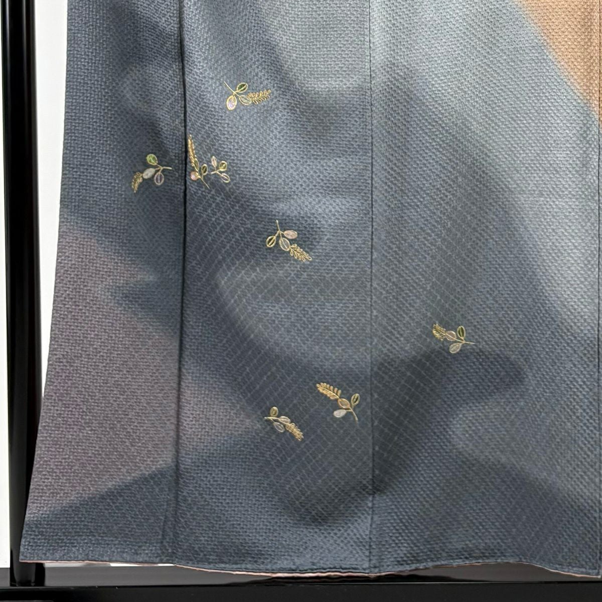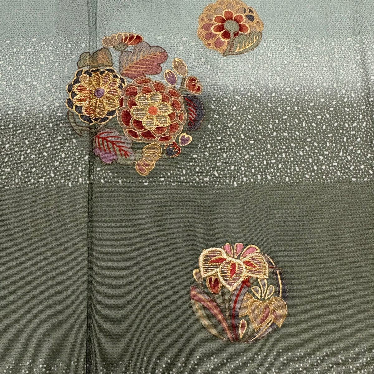 30%OFF 付下げ 身丈153cm 裄丈65cm M 袷 草花 流水 刺繍 ぼかし 灰緑 正絹 秀品 K30