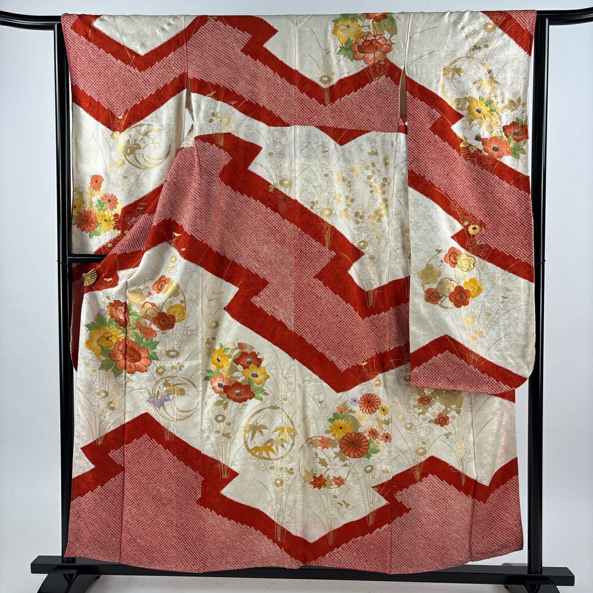 30%OFF 振袖 身丈167.5cm 裄丈68cm L 袷 花車 地紋 金銀彩 絞り 赤 正絹 秀品 K30