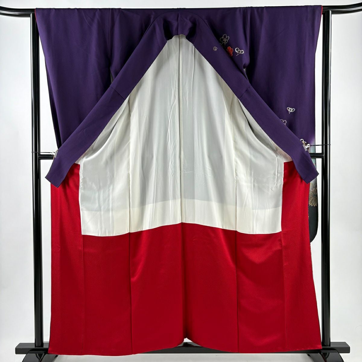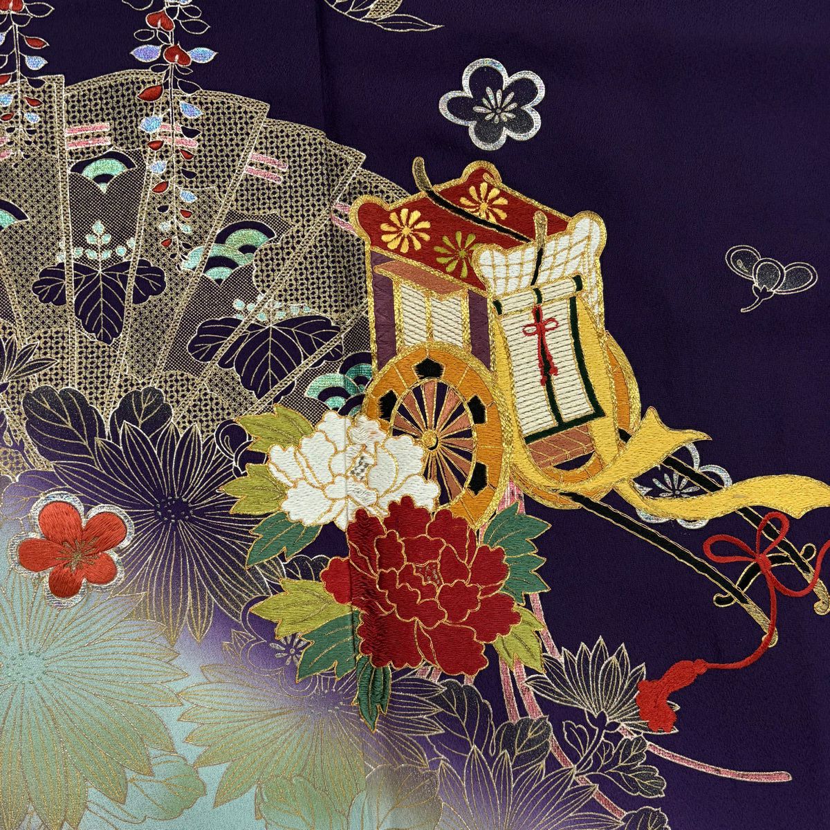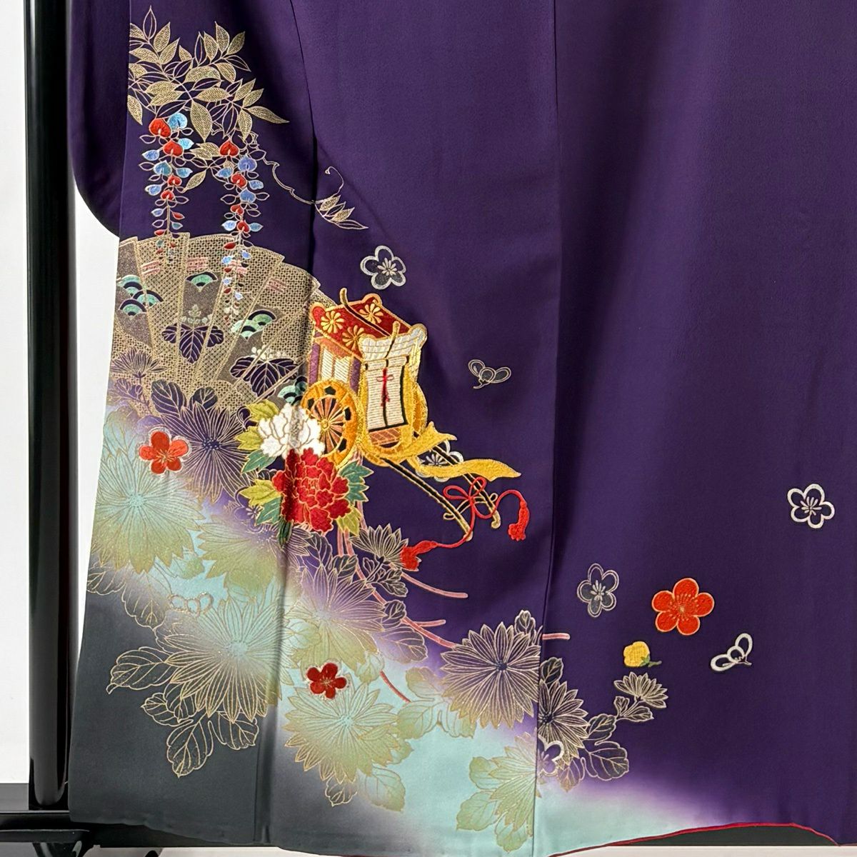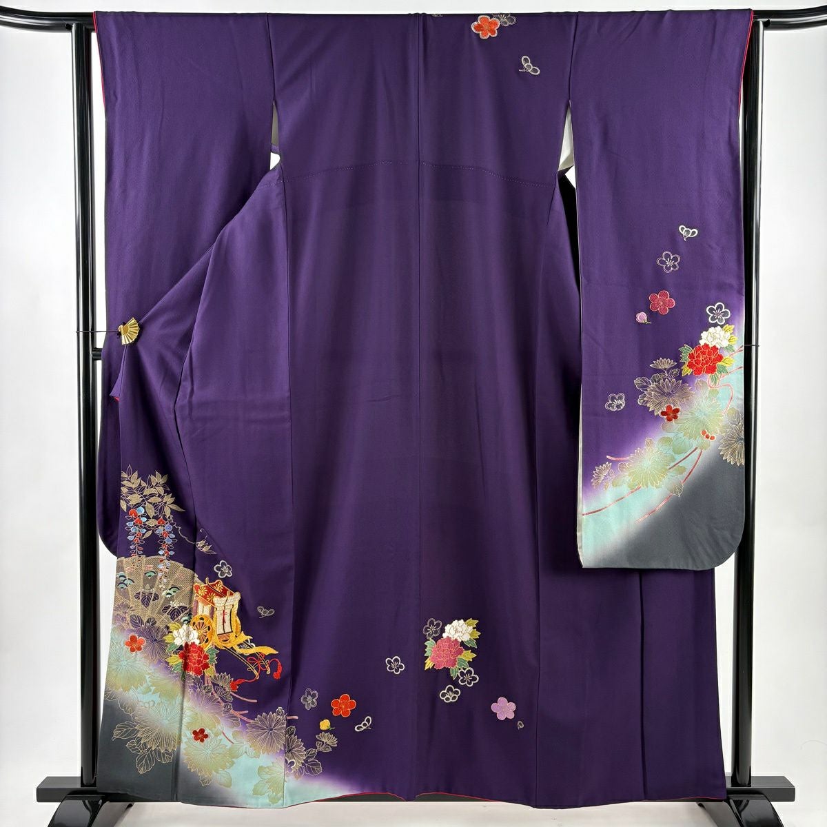 30%OFF 振袖 身丈160cm 裄丈63.5cm S 袷 御所車 桧扇 金糸 刺繍 紫 正絹 秀品 K30