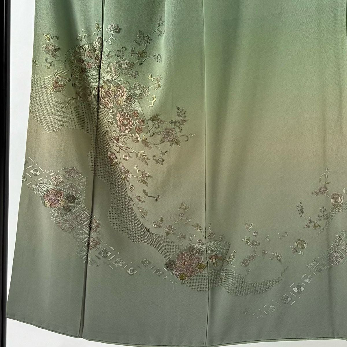 30%OFF 色留袖 身丈159cm 裄丈63.5cm S 袷 鼓 草花 金糸 刺繍 薄緑 正絹 秀品 K30