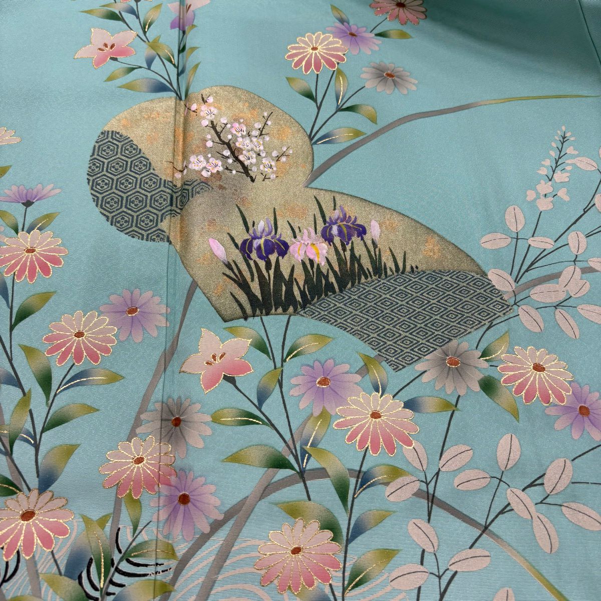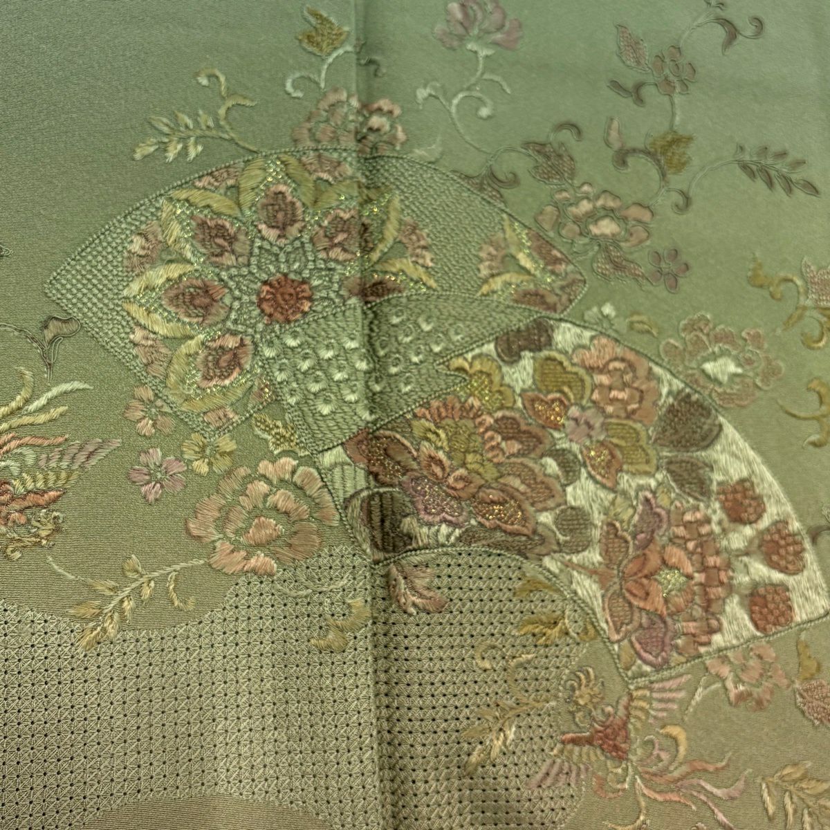30%OFF 付下げ 身丈151cm 裄丈63.5cm S 袷 扇面 花鳥 刺繍 箔 灰緑 正絹 秀品 K30