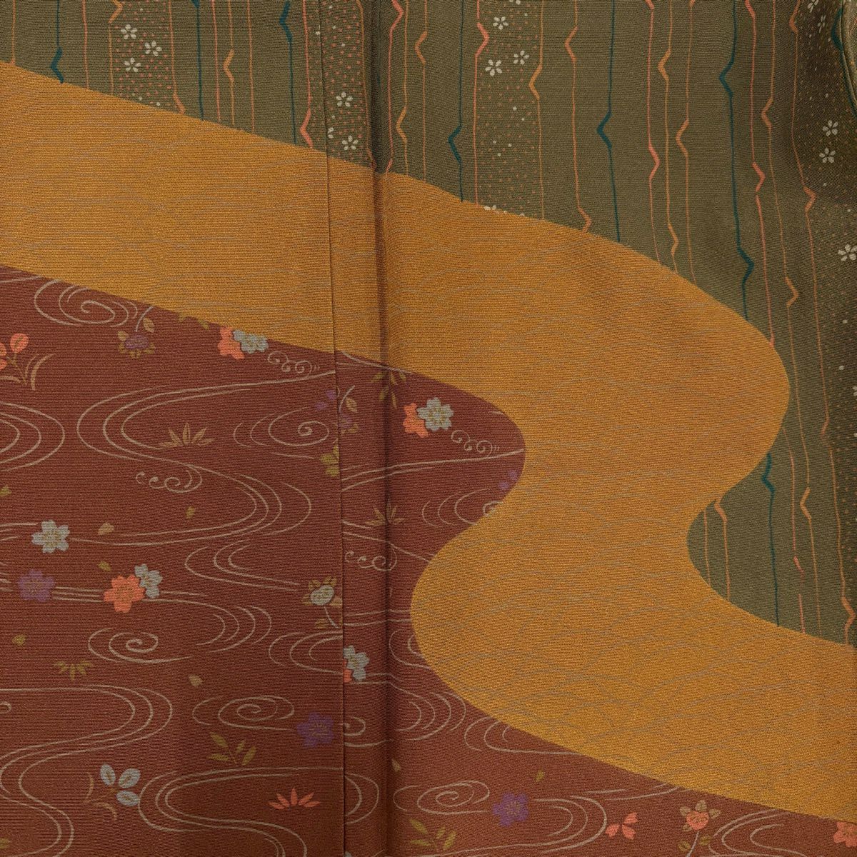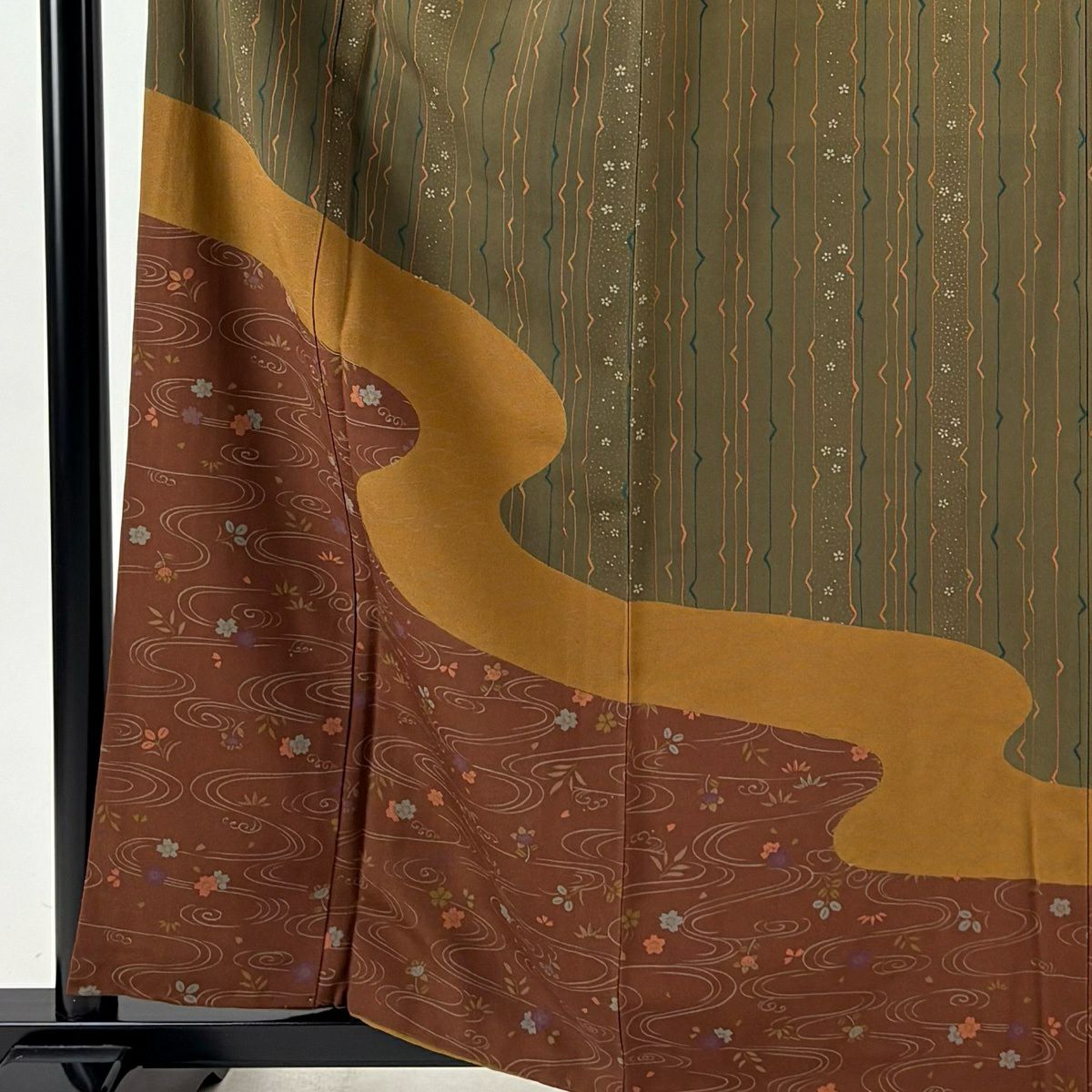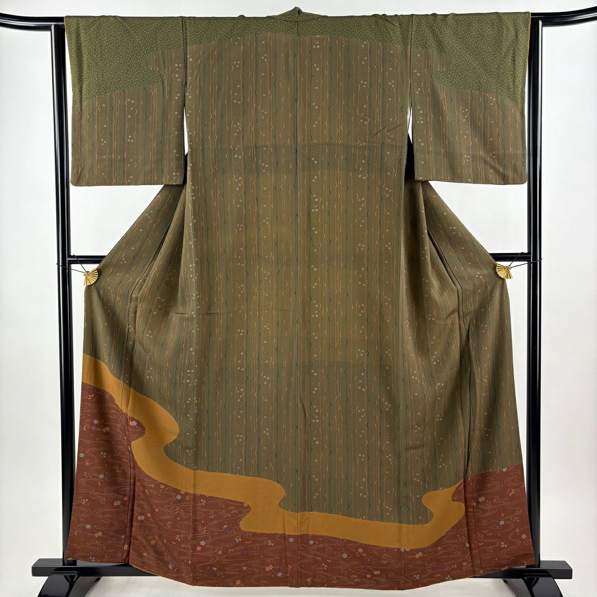 30%OFF 訪問着 身丈431cm 裄丈62.5cm S 袷 流水 桜 染め分け 茶緑色 正絹 秀品 K30