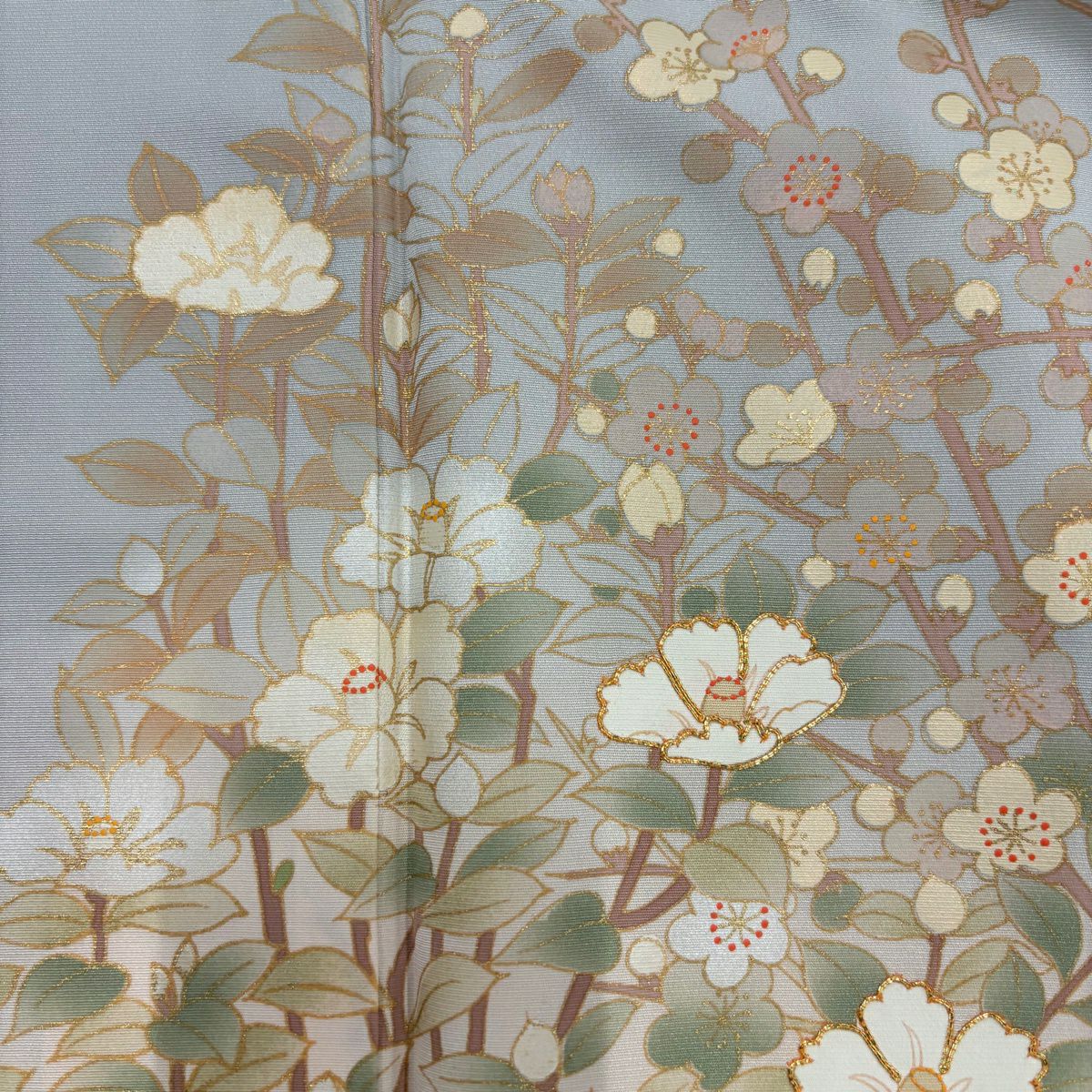 30%OFF 訪問着 身丈160cm 裄丈64cm M 袷 椿 菊 金銀彩 ぼかし 青灰色 正絹 秀品 K30