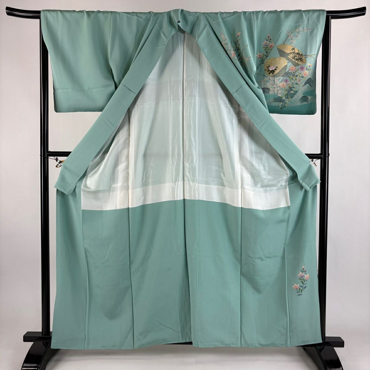 30%OFF 訪問着 身丈166cm 裄丈68cm L 袷 草花 秋の虫 刺繍 金彩 薄緑 正絹 秀品 K30