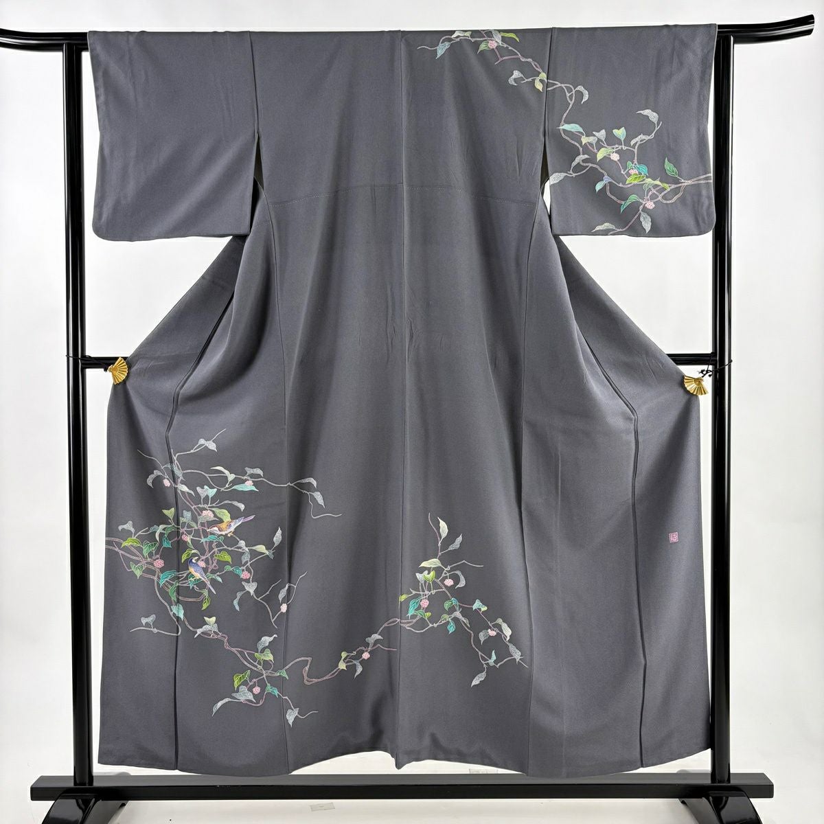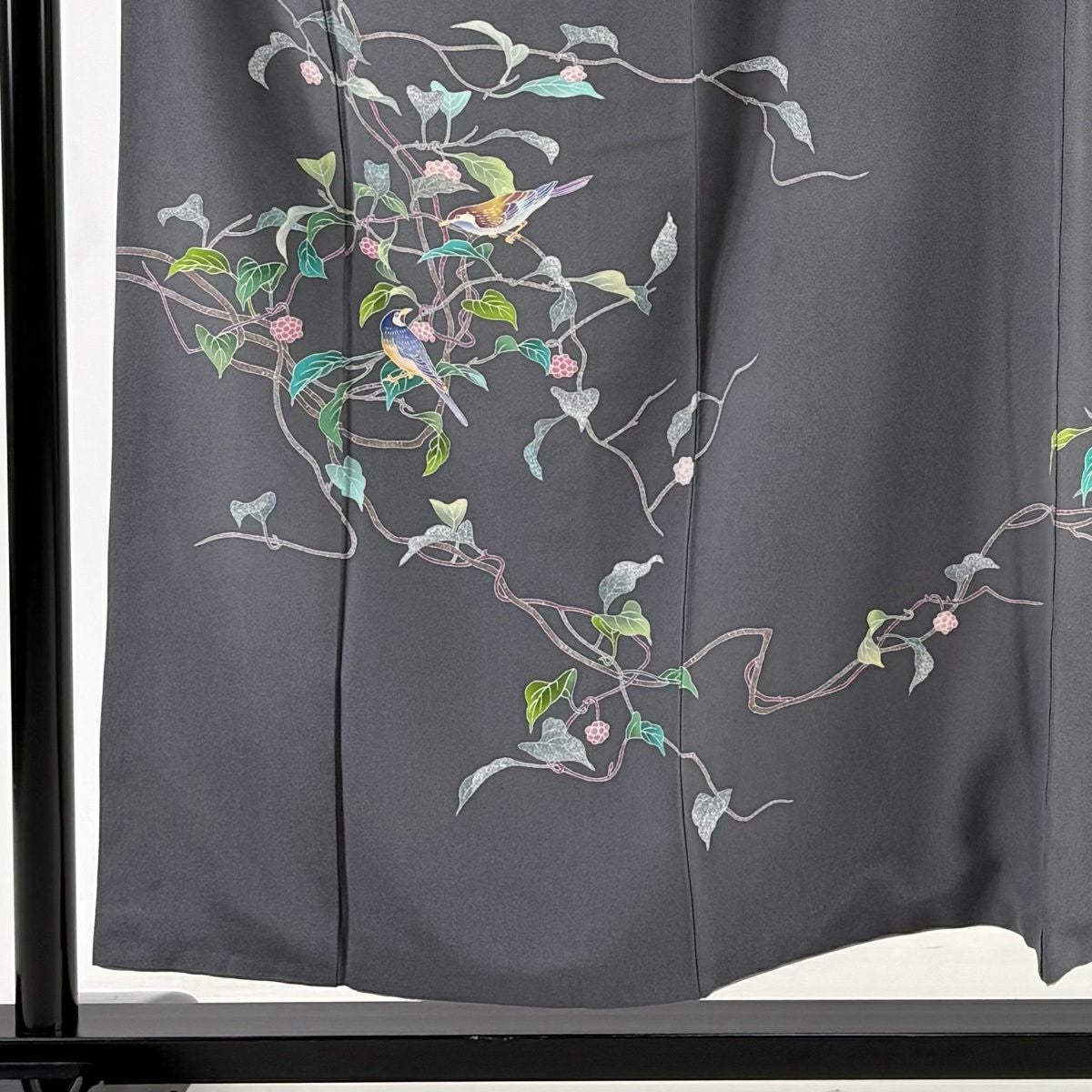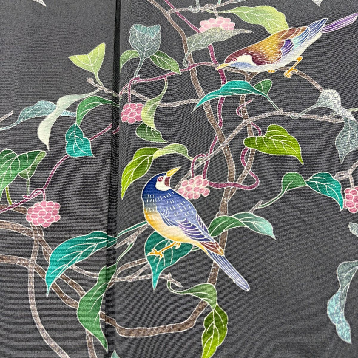 30%OFF 訪問着 身丈156cm 裄丈62.5cm S 袷 落款あり 葉と実 鳥 灰色 正絹 秀品 K30