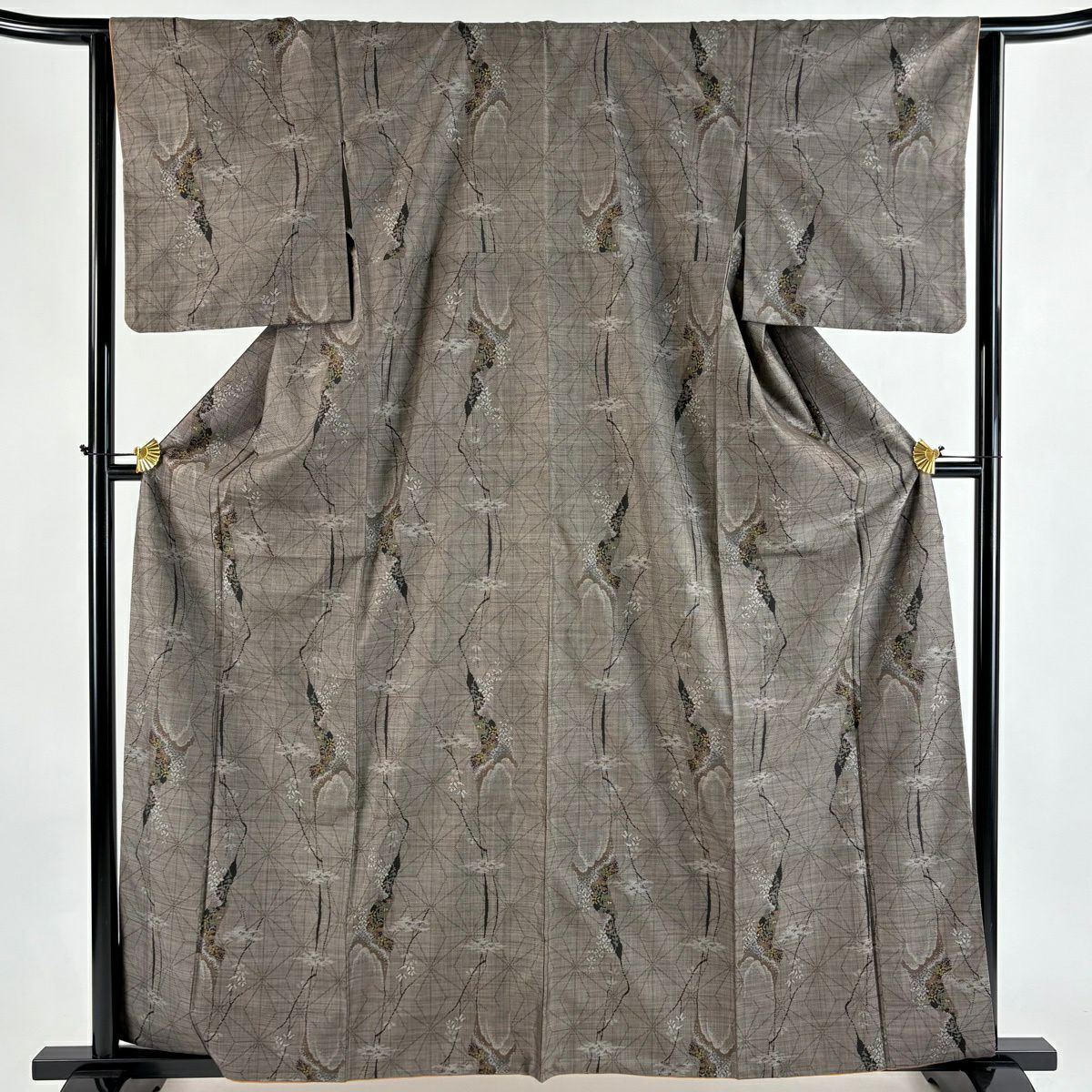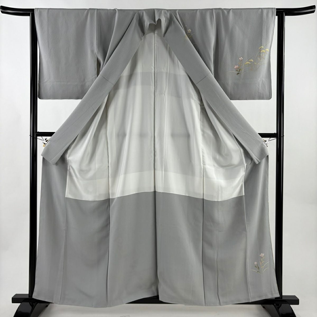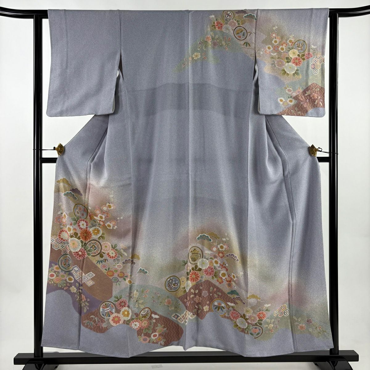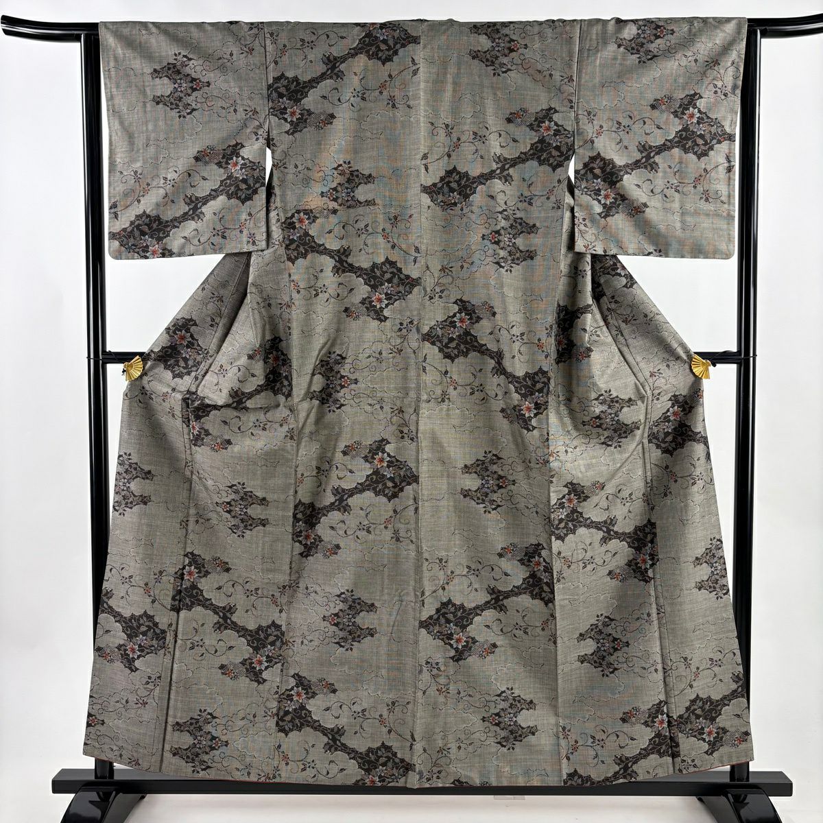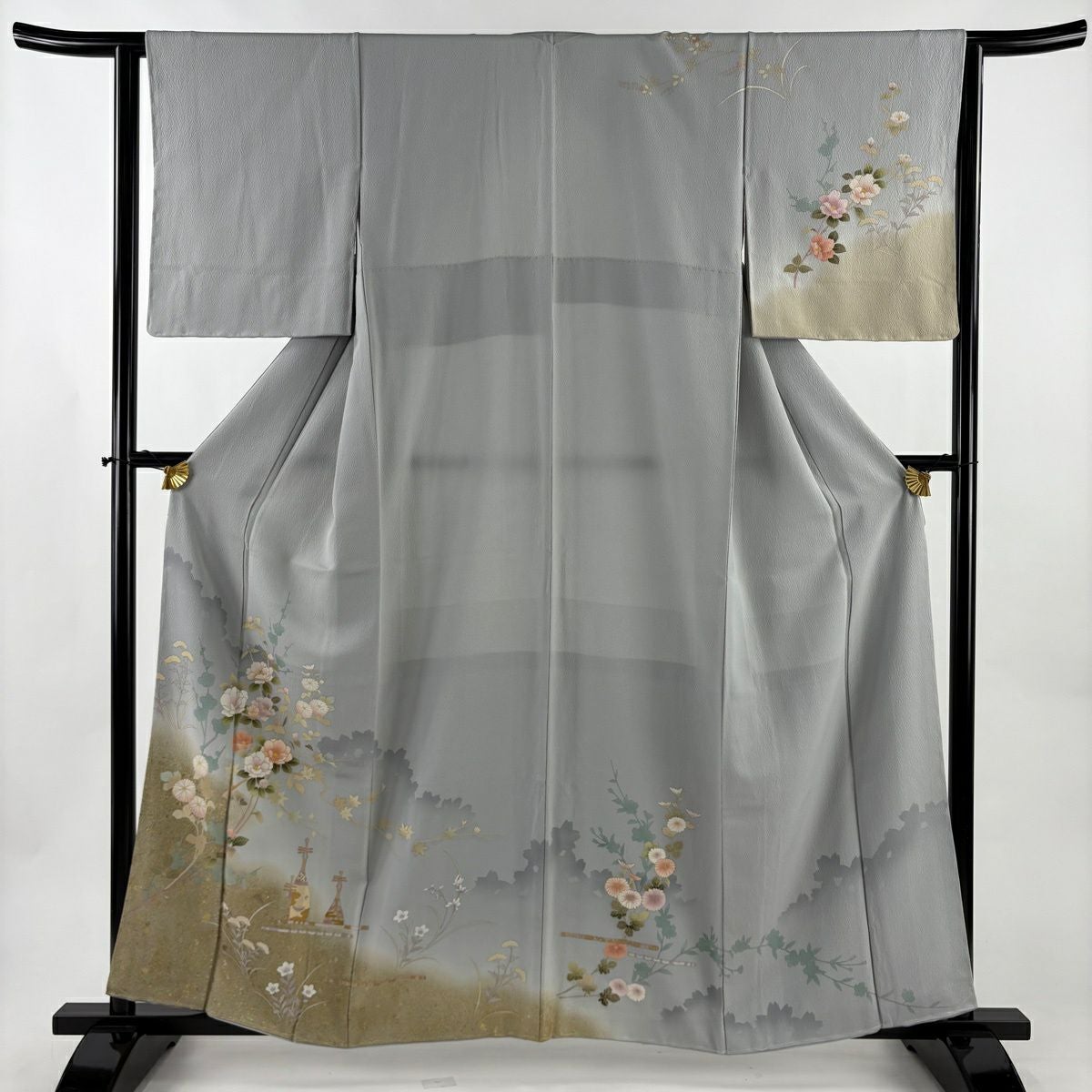 30%OFF 訪問着 身丈155.5cm 裄丈64cm M 袷 扇面 萩 刺繍 金彩 灰色 正絹 秀品 K30