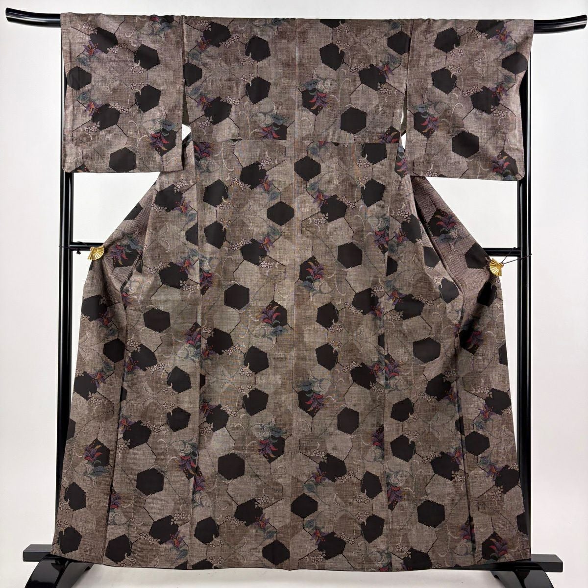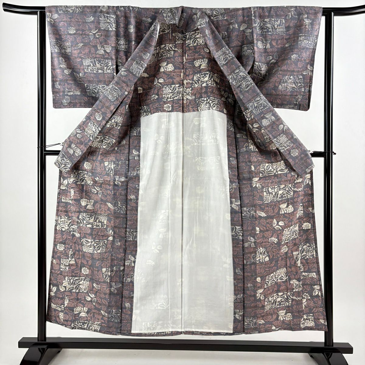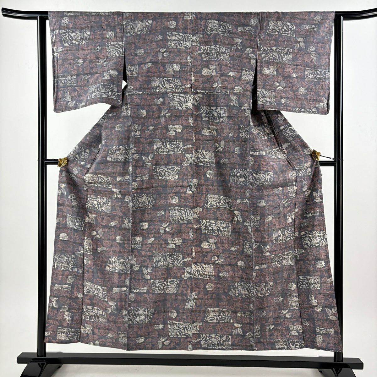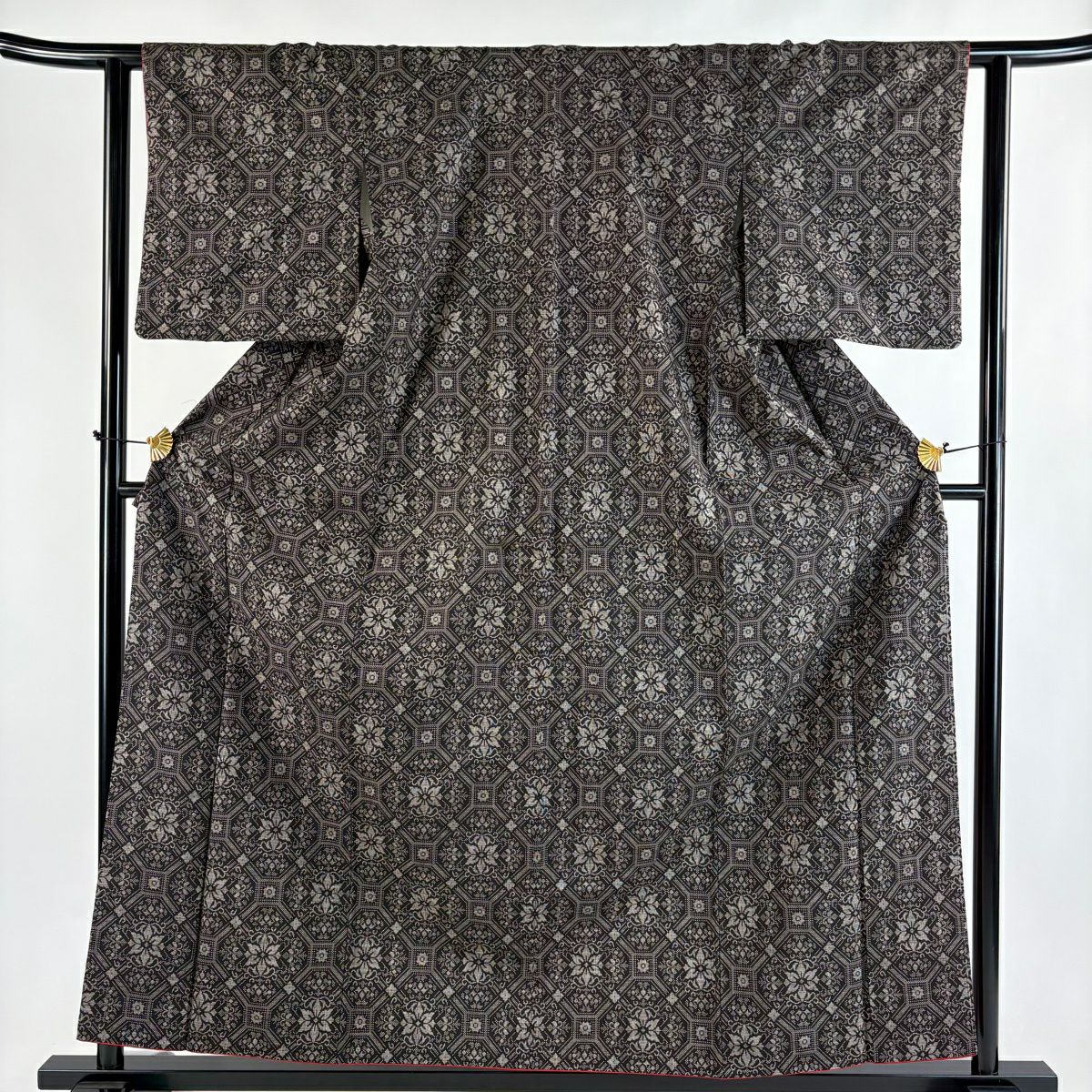 30%OFF 【美品】 紬 身丈162cm 裄丈67cm M 袷 草花 幾何学模様 焦茶色 正絹 秀品 K30