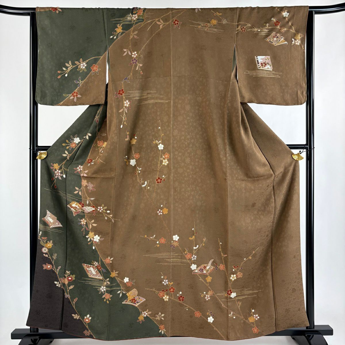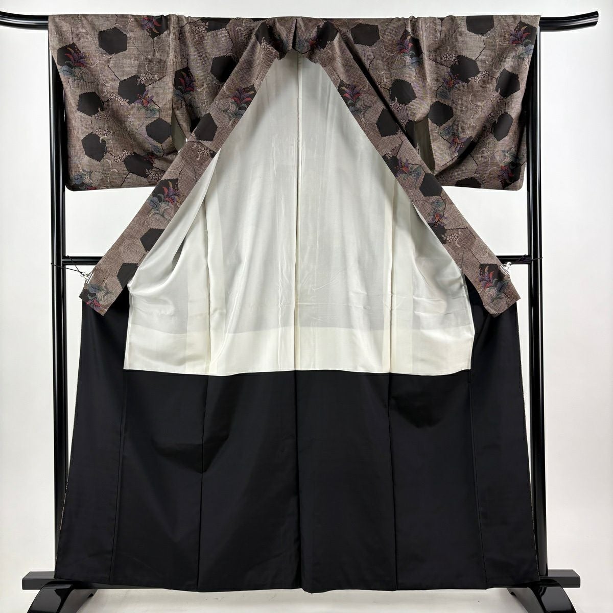 30%OFF 訪問着 身丈158cm 裄丈64cm M 袷 扇面 草花 金彩 ぼかし 黒灰 正絹 秀品 K30