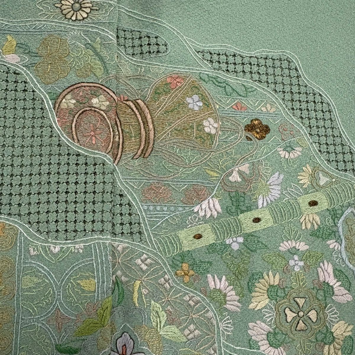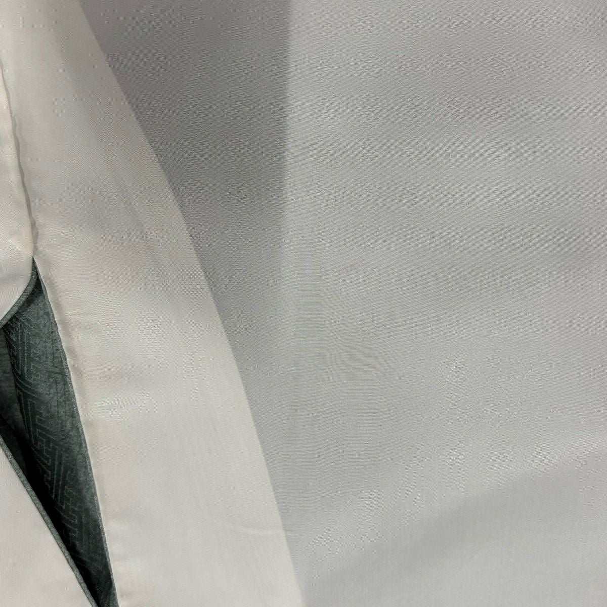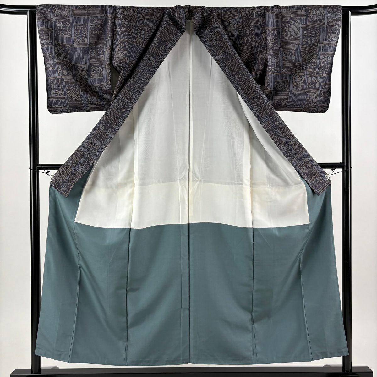30%OFF 小紋 身丈157cm 裄丈63.5cm S 袷 袋帯セット 幾何学模様 灰緑 正絹 秀品 K30
