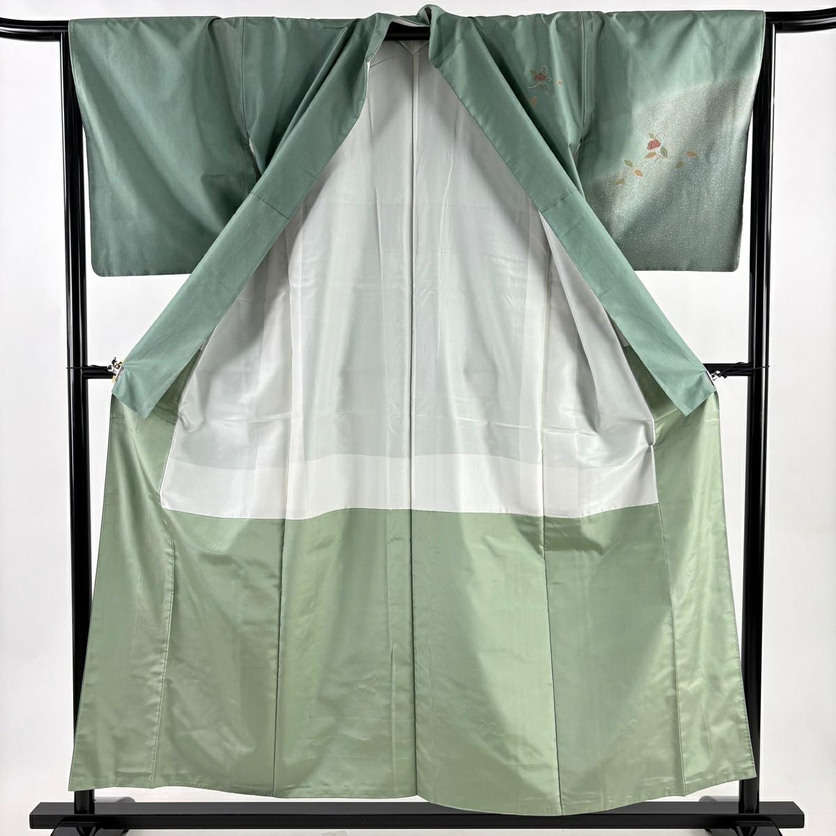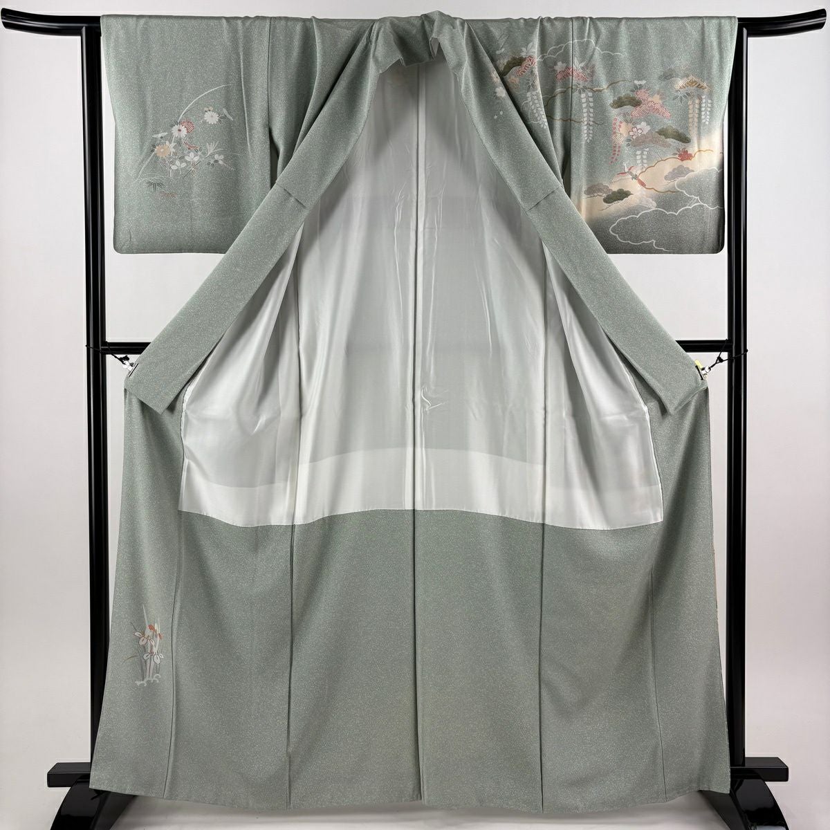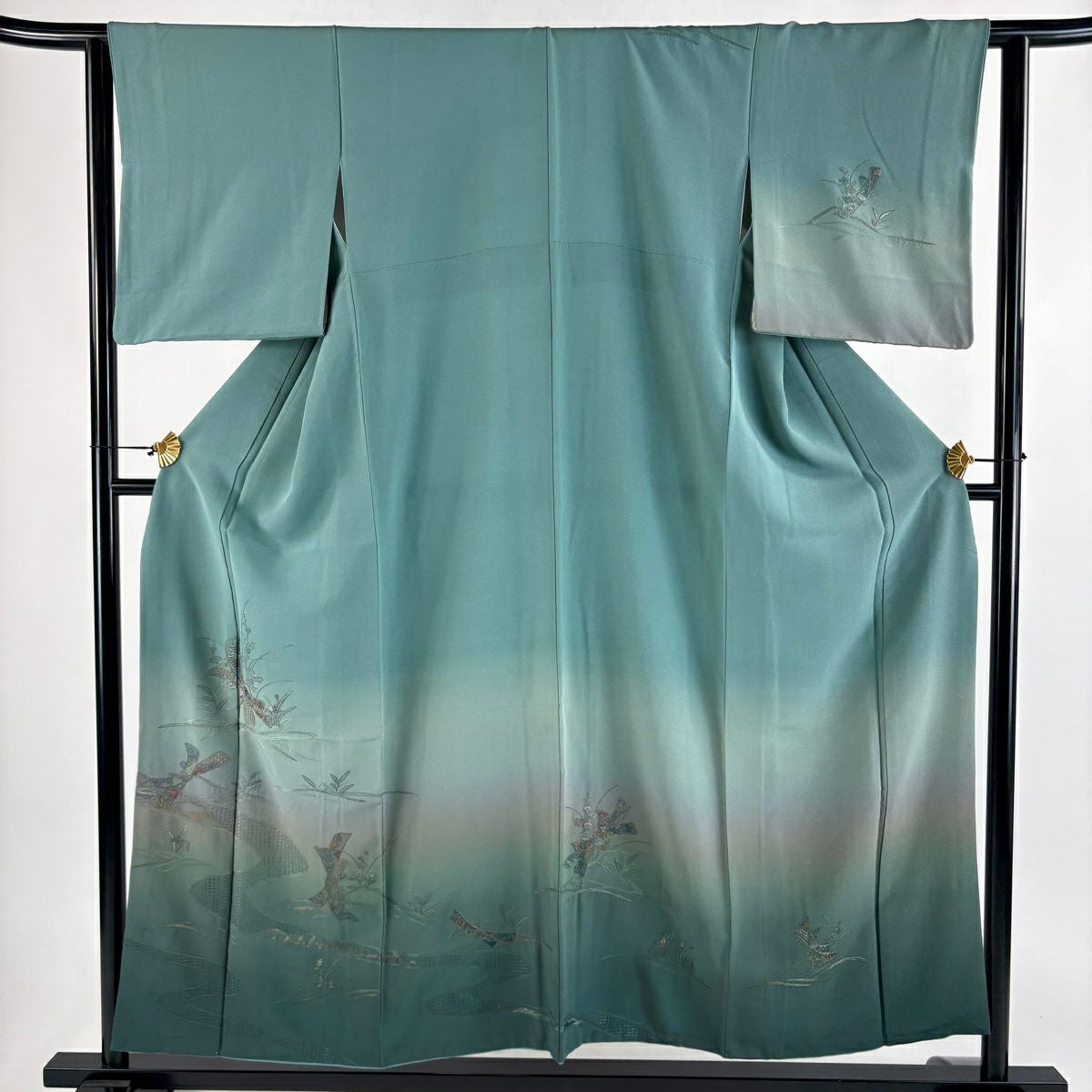 30%OFF 訪問着 身丈156cm 裄丈65cm M 袷 短冊 花鳥 金彩 ぼかし 灰緑 正絹 秀品 K30