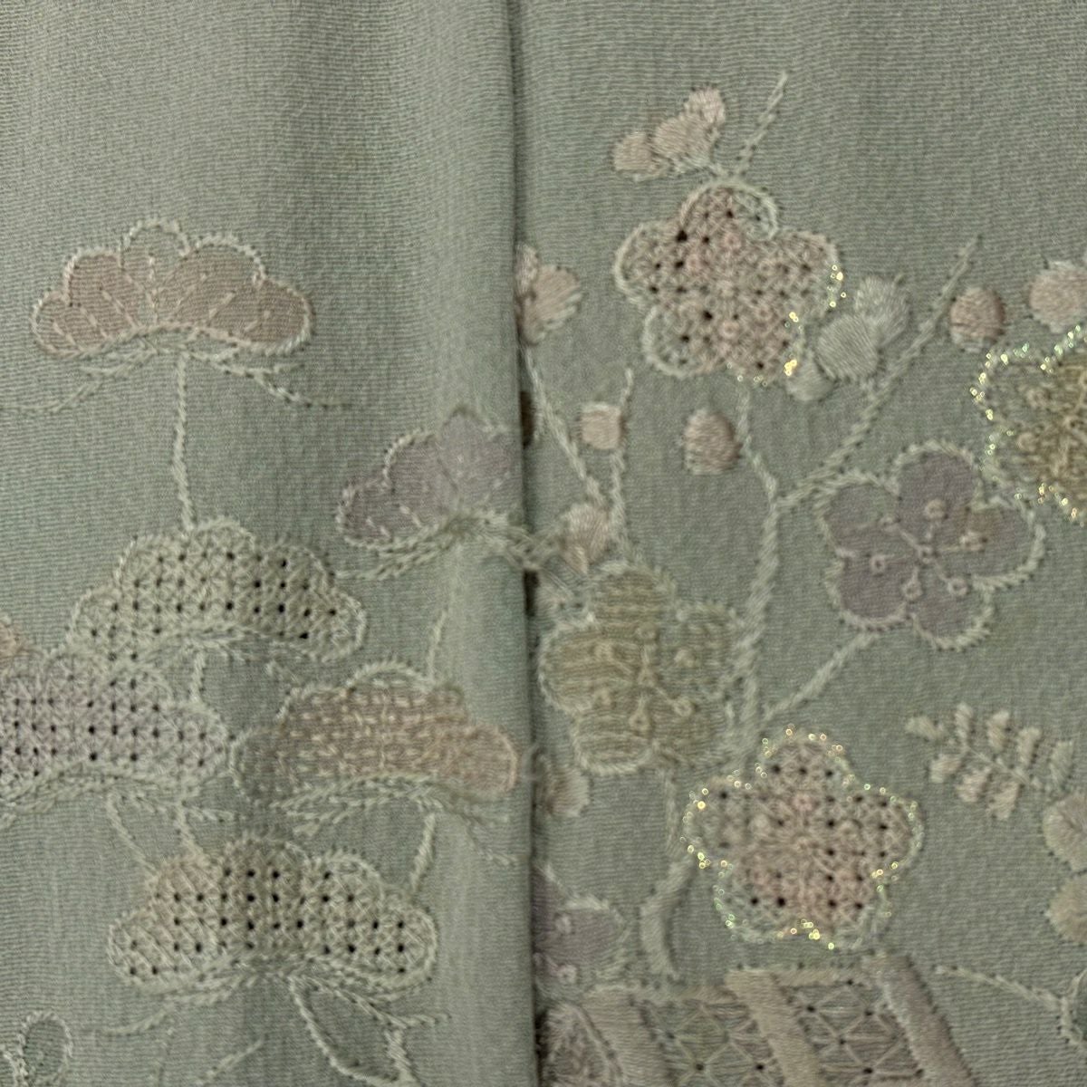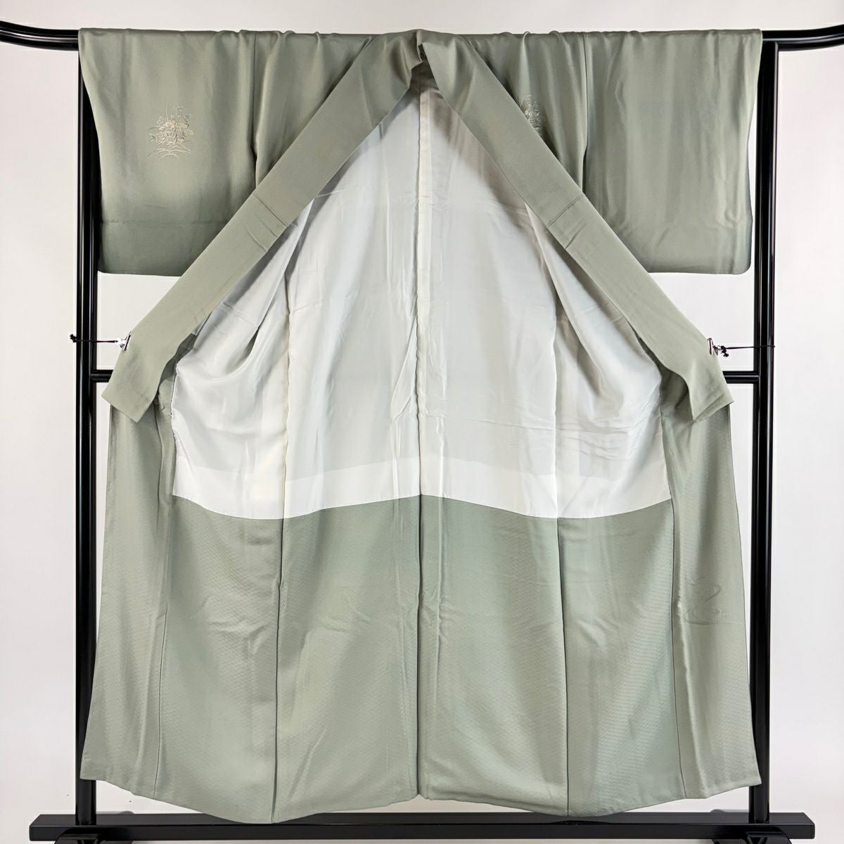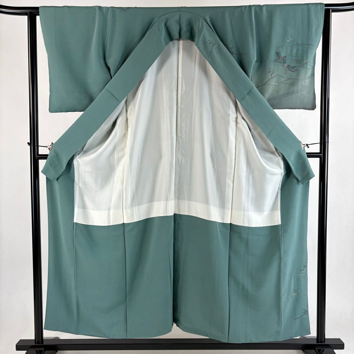 30%OFF 訪問着 身丈156cm 裄丈65cm M 袷 短冊 花鳥 金彩 ぼかし 灰緑 正絹 秀品 K30