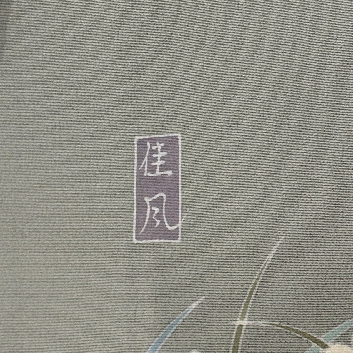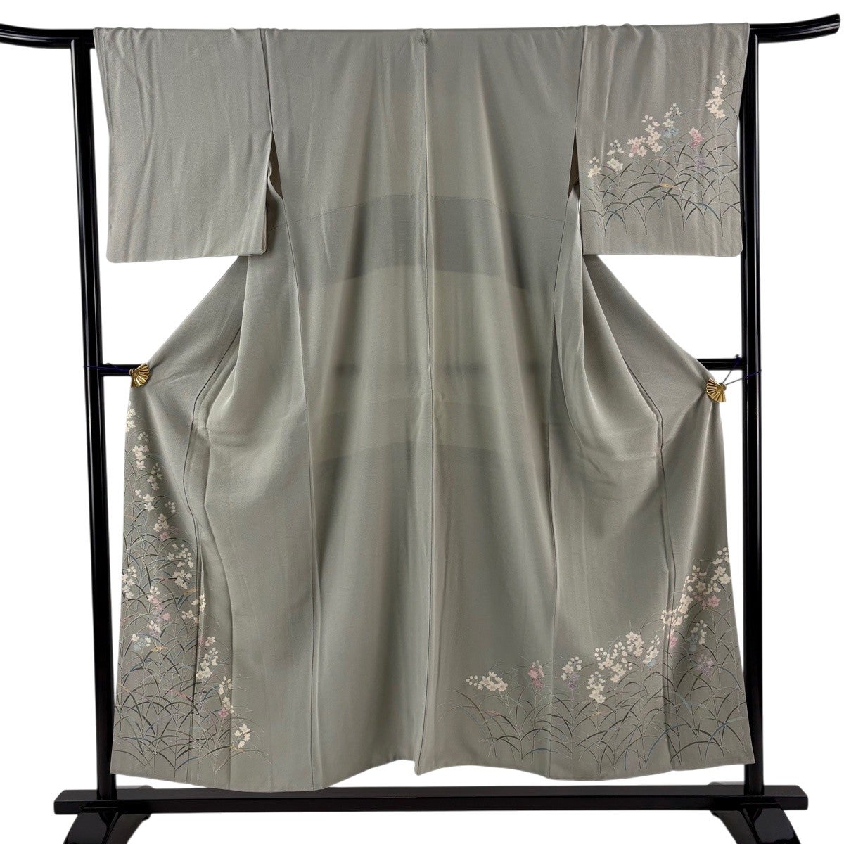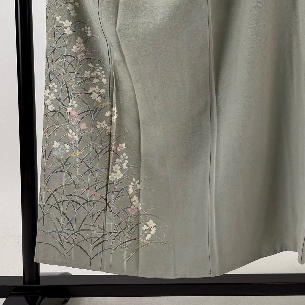 付下げ 身丈163cm 裄丈66cm M 袷 花筏 流水 刺繍 金糸 灰緑 正絹 秀品