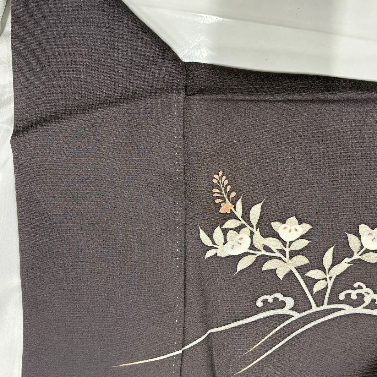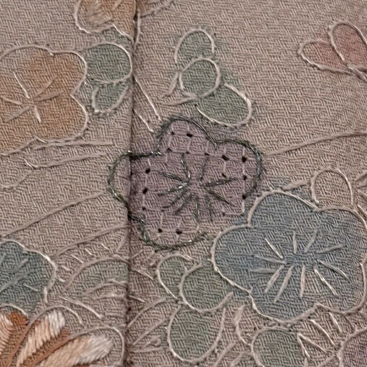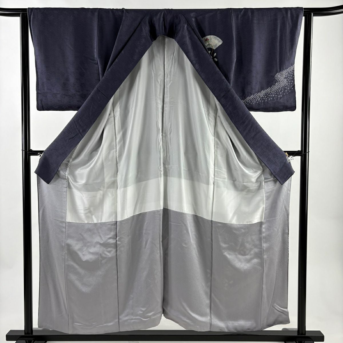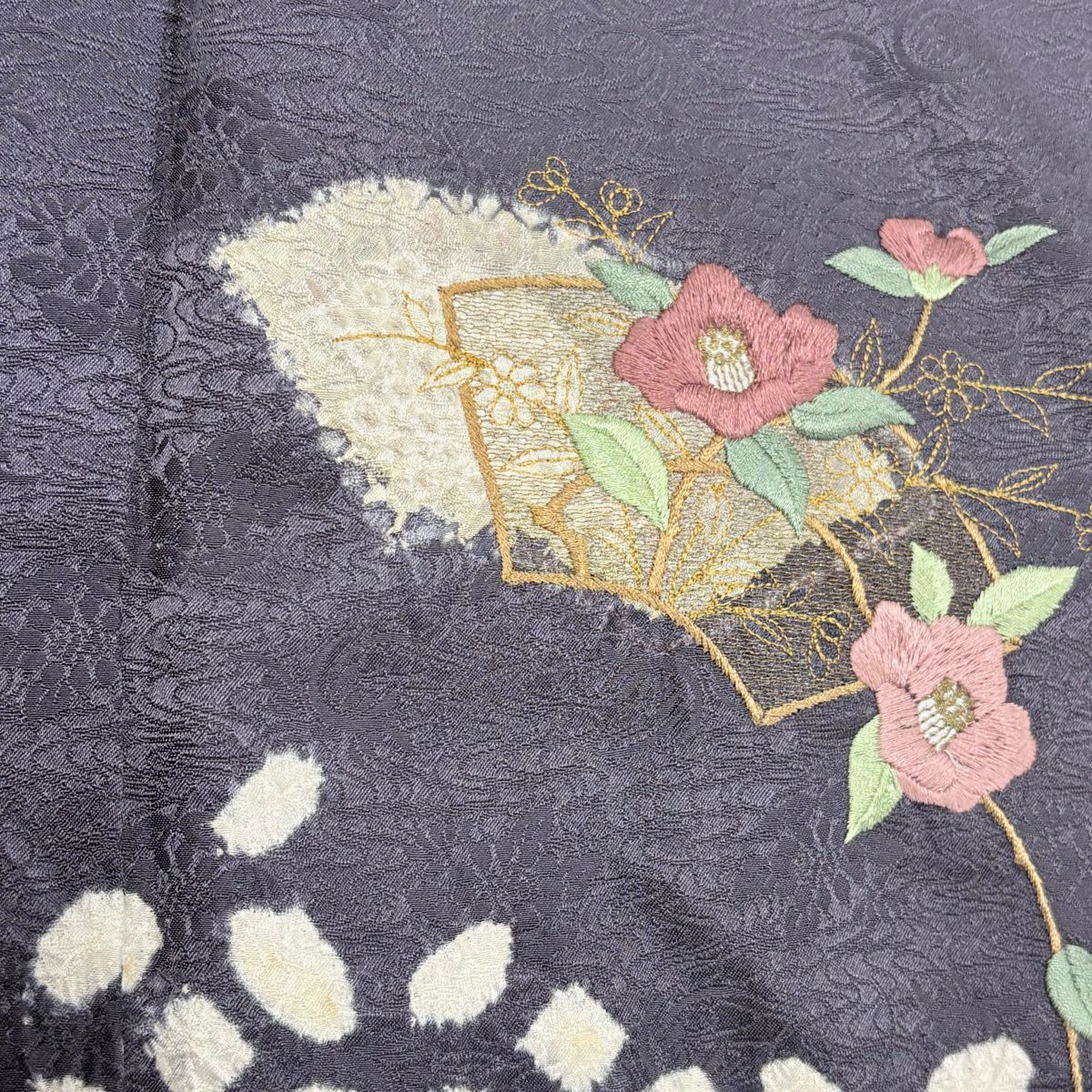 50%OFF 付下げ 身丈154.5cm 裄丈62cm S 袷 扇面 椿 刺繍 絞り 灰紫 正絹 秀品 K50