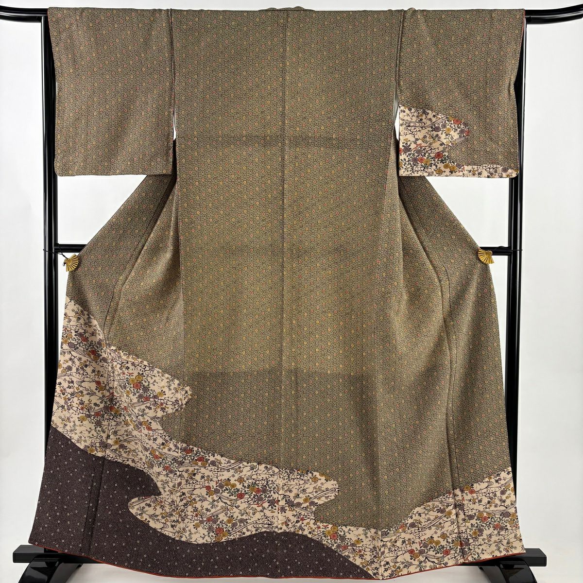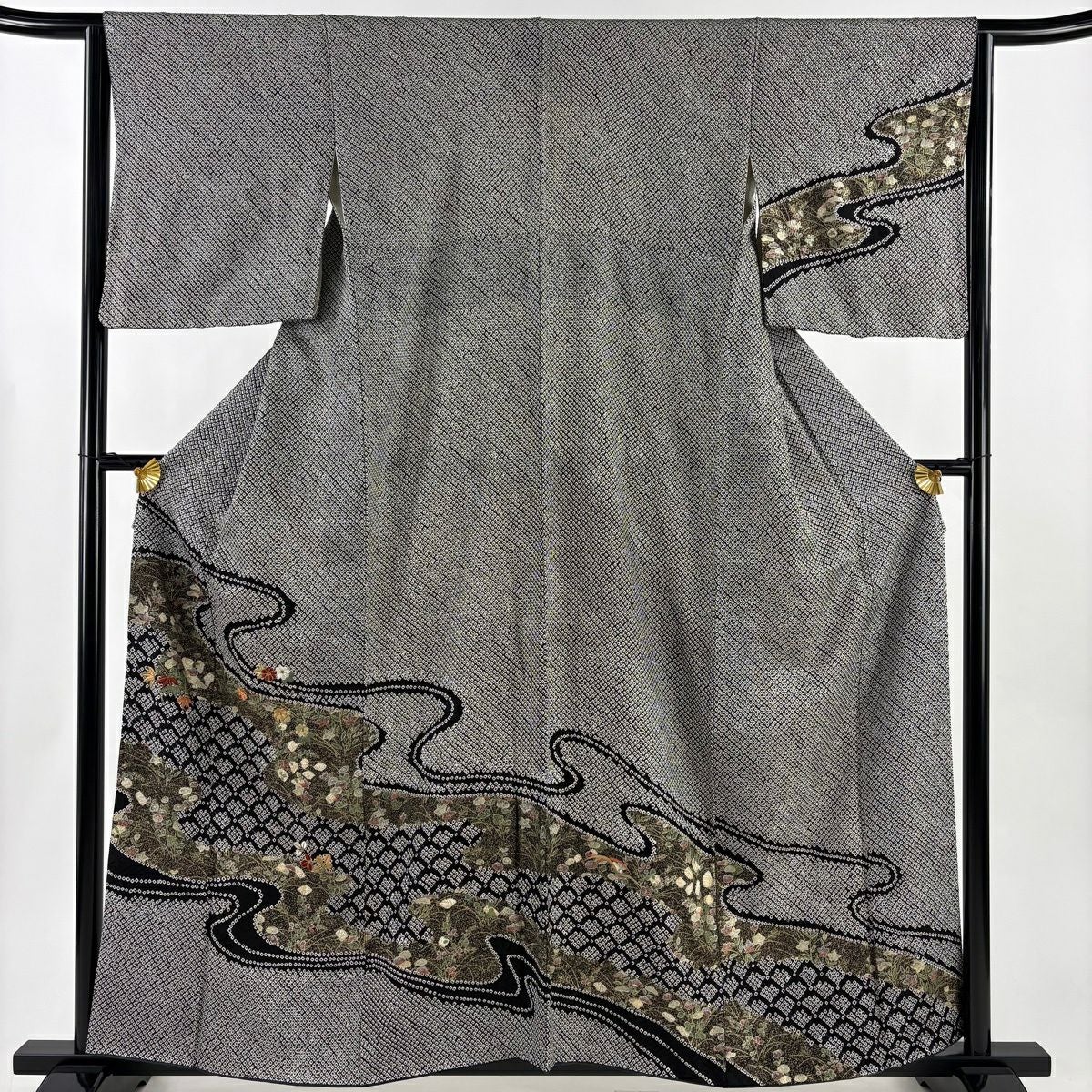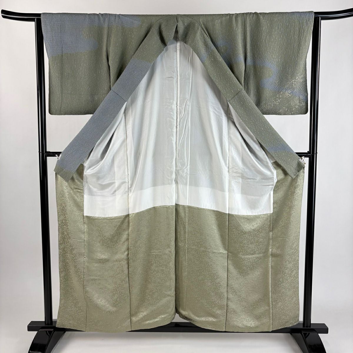 50%OFF 付下げ 身丈157cm 裄丈63.5cm S 袷 萩 流水 絞り 刺繍 灰緑 正絹 秀品 K50