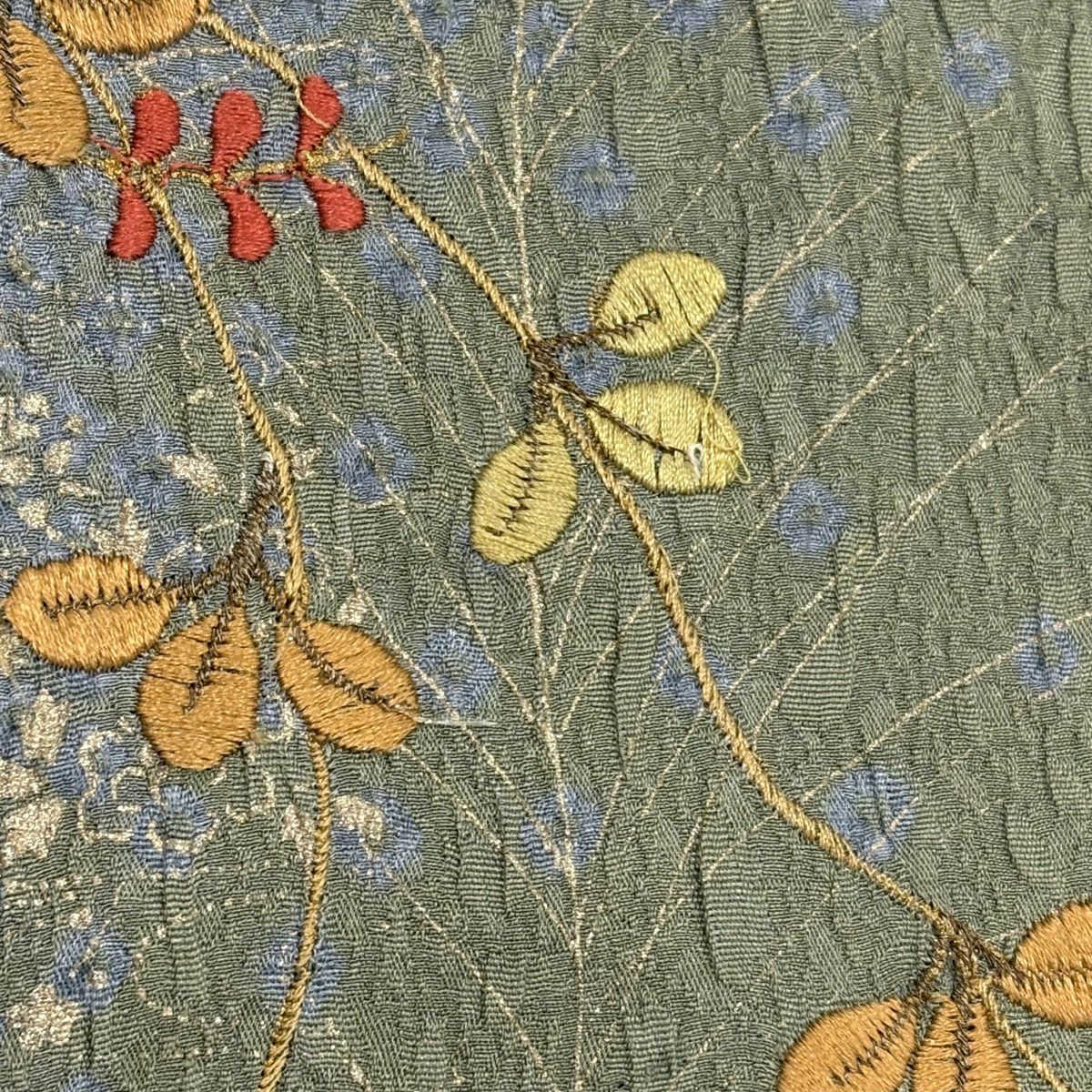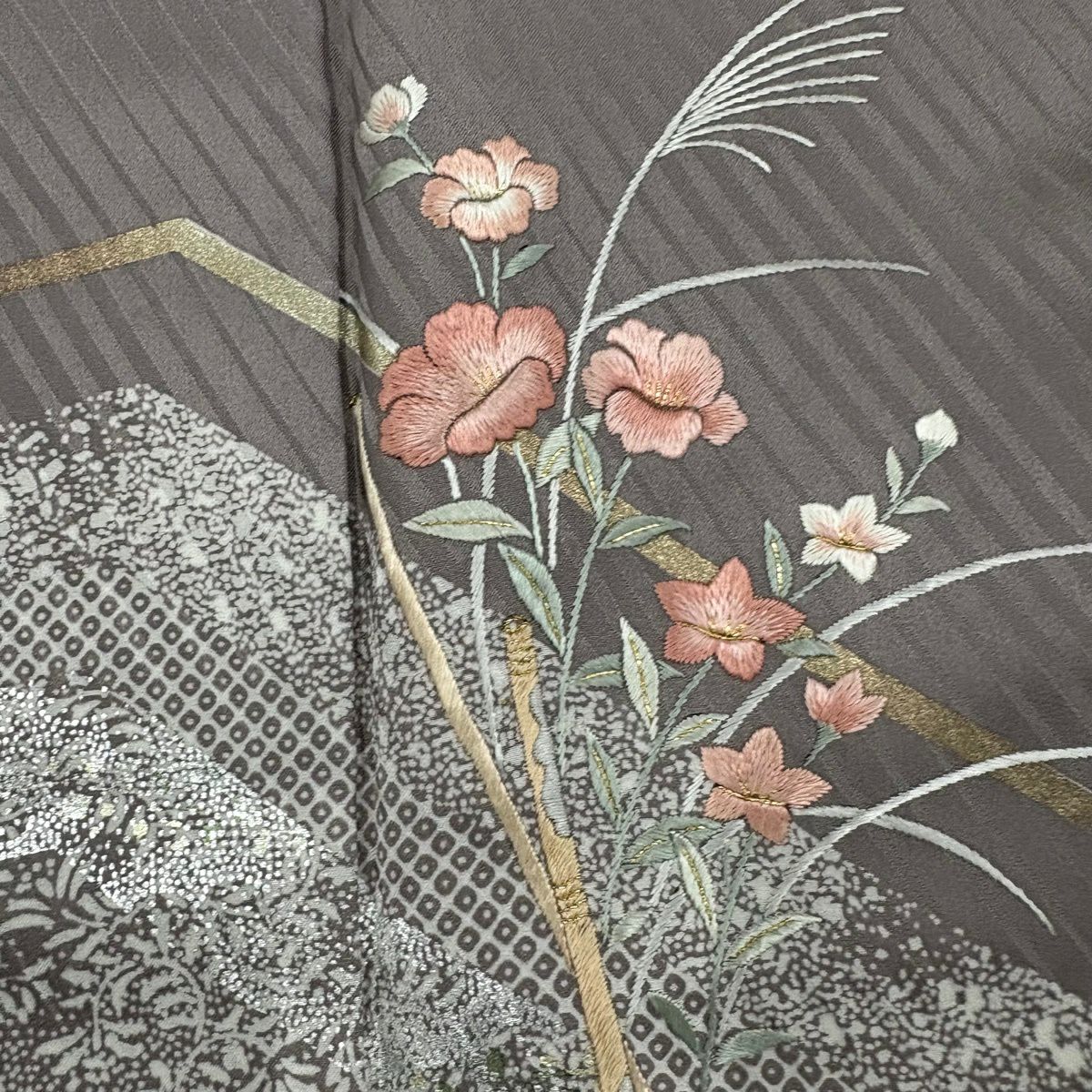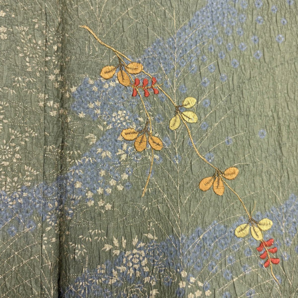 50%OFF 付下げ 身丈157cm 裄丈63.5cm S 袷 萩 流水 絞り 刺繍 灰緑 正絹 秀品 K50