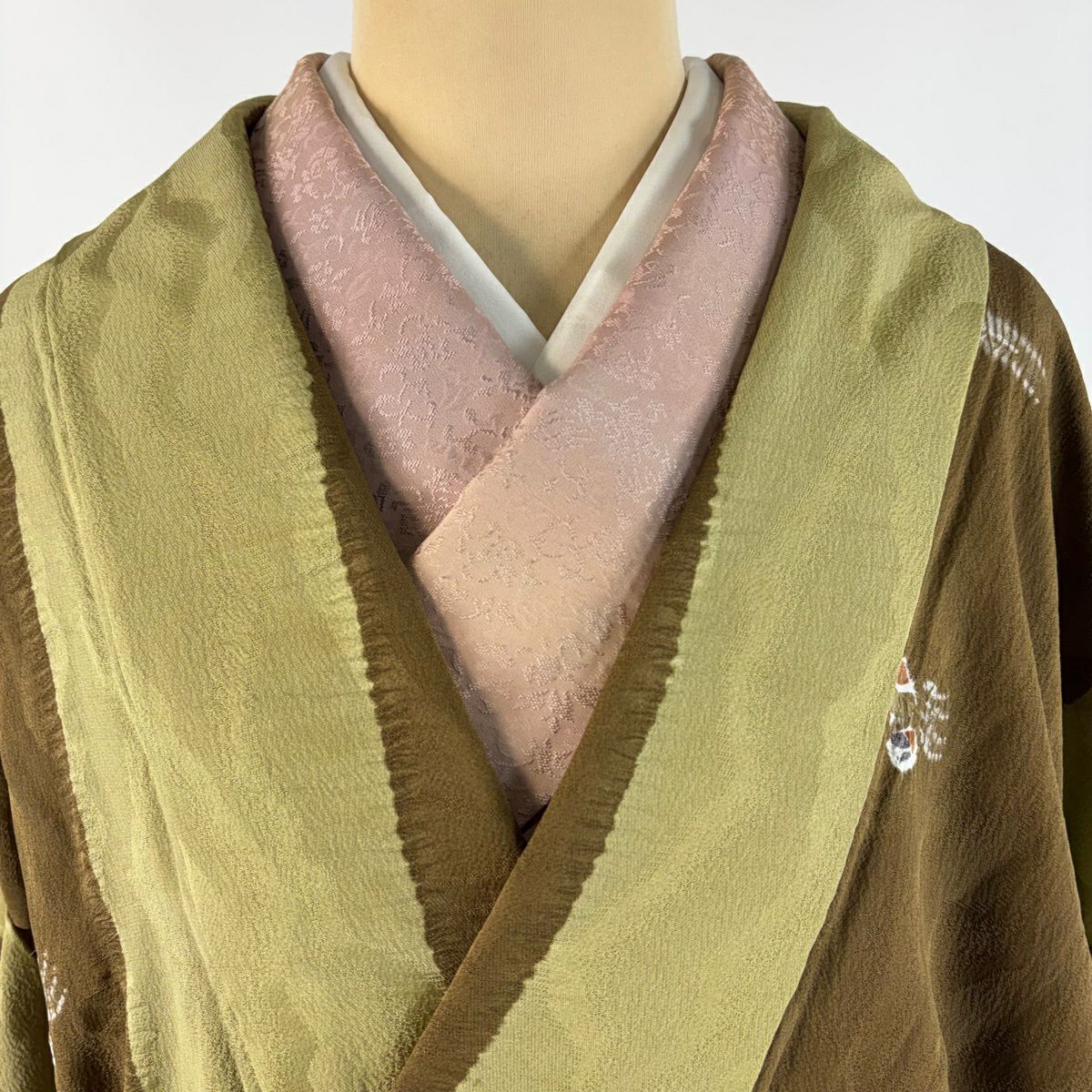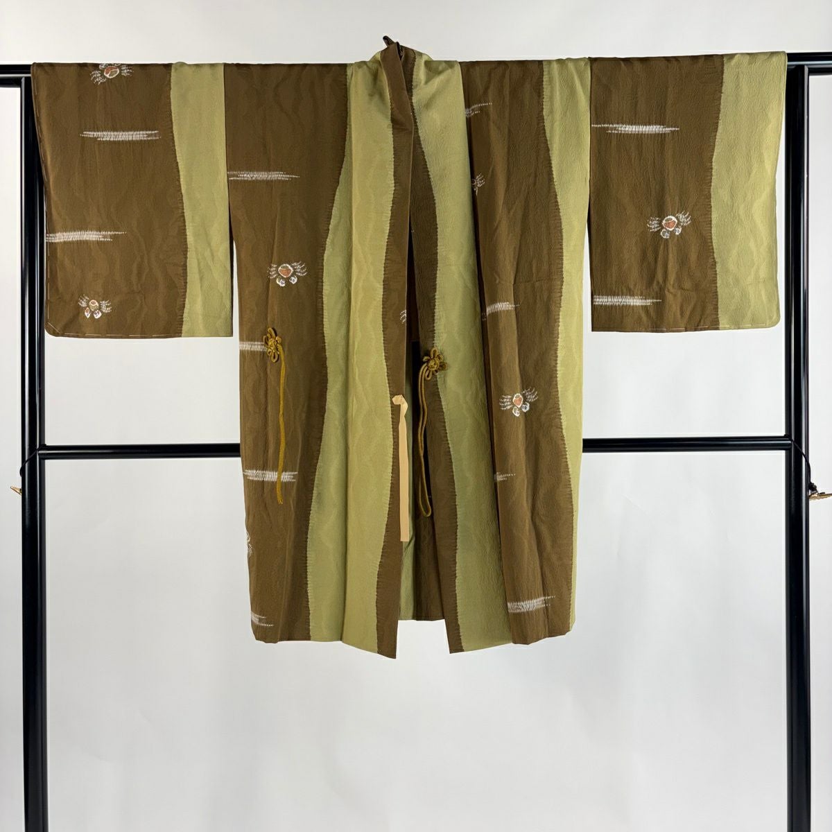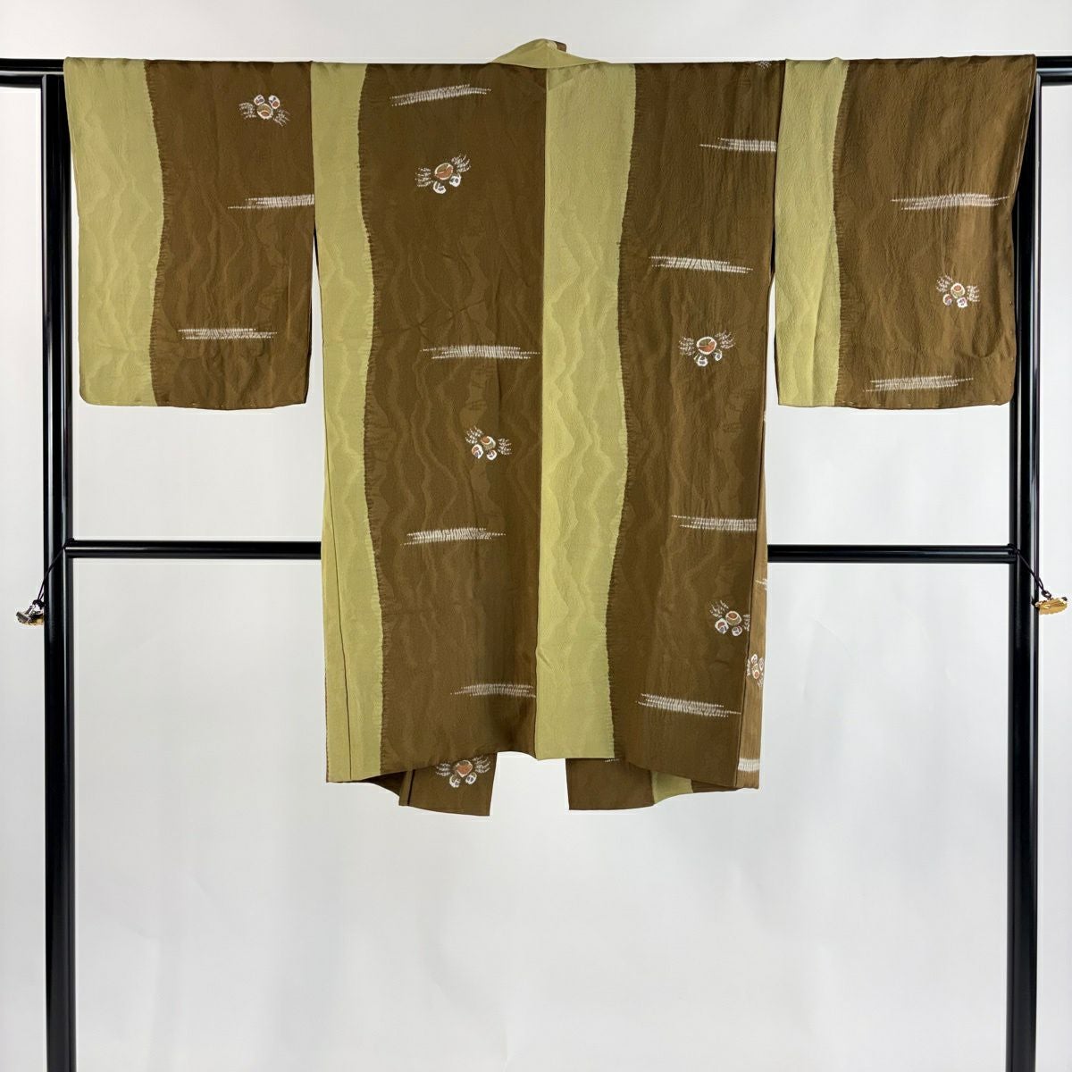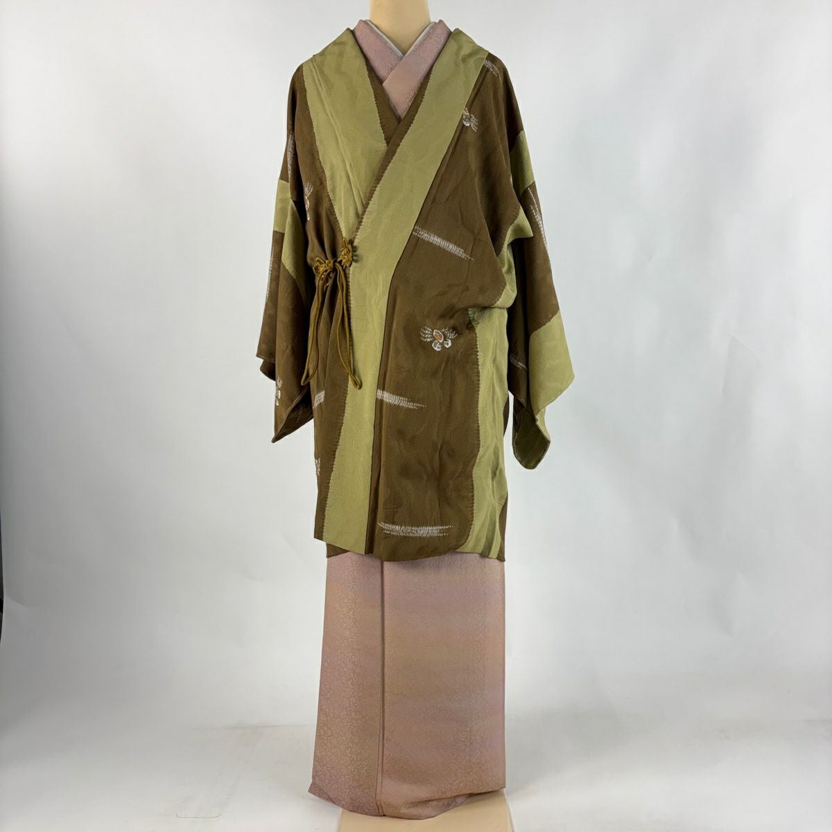 50%OFF 道中着 身丈98cm 裄丈64.5cm M 和装コート 蟹 霞 絞り 抹茶色 正絹 秀品 K50