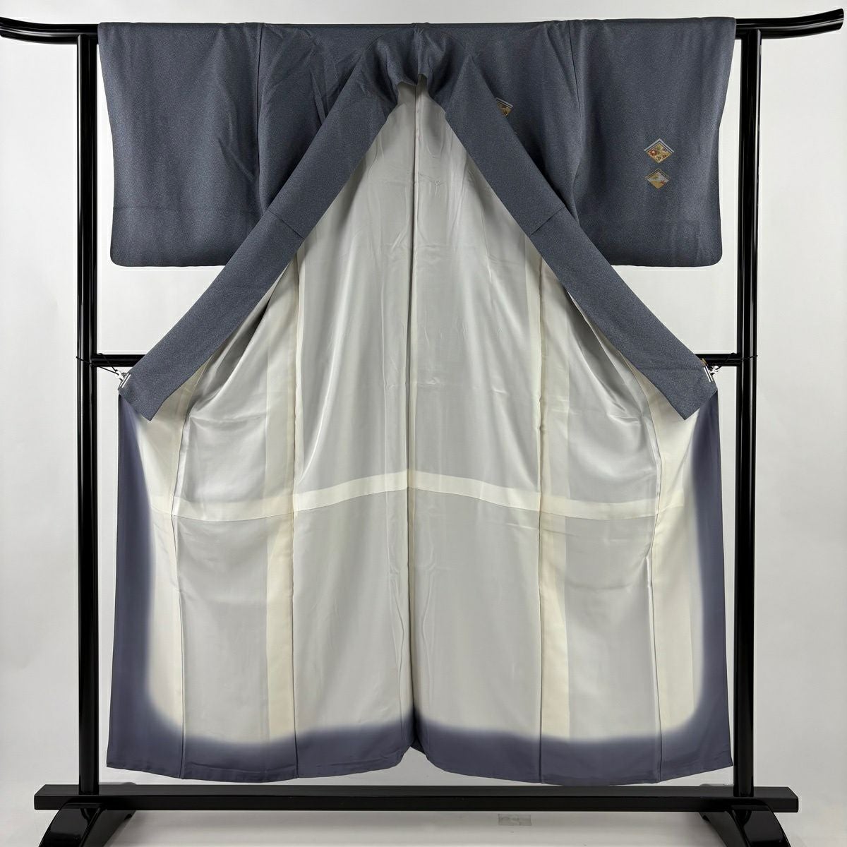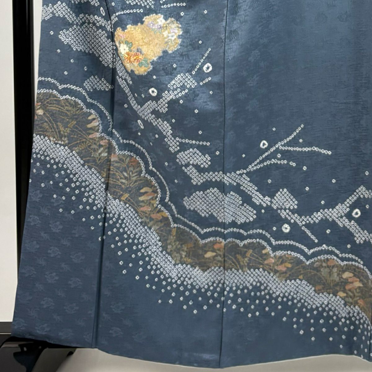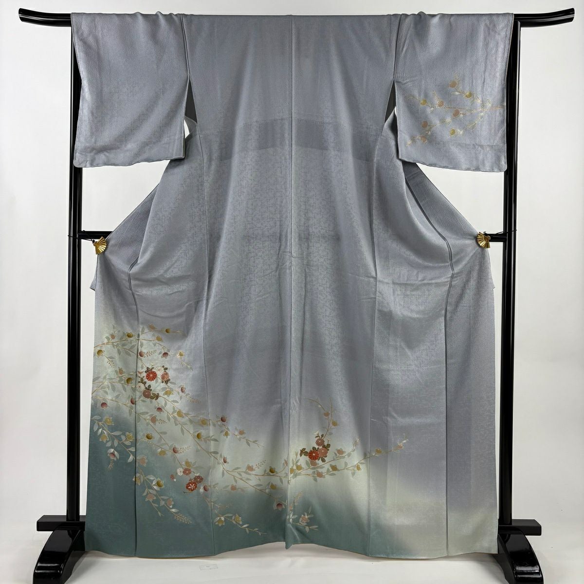 50%OFF 付下げ 身丈163.5cm 裄丈66.5cm M 袷 草花 絞り 金銀彩 青灰色 正絹 秀品 K50