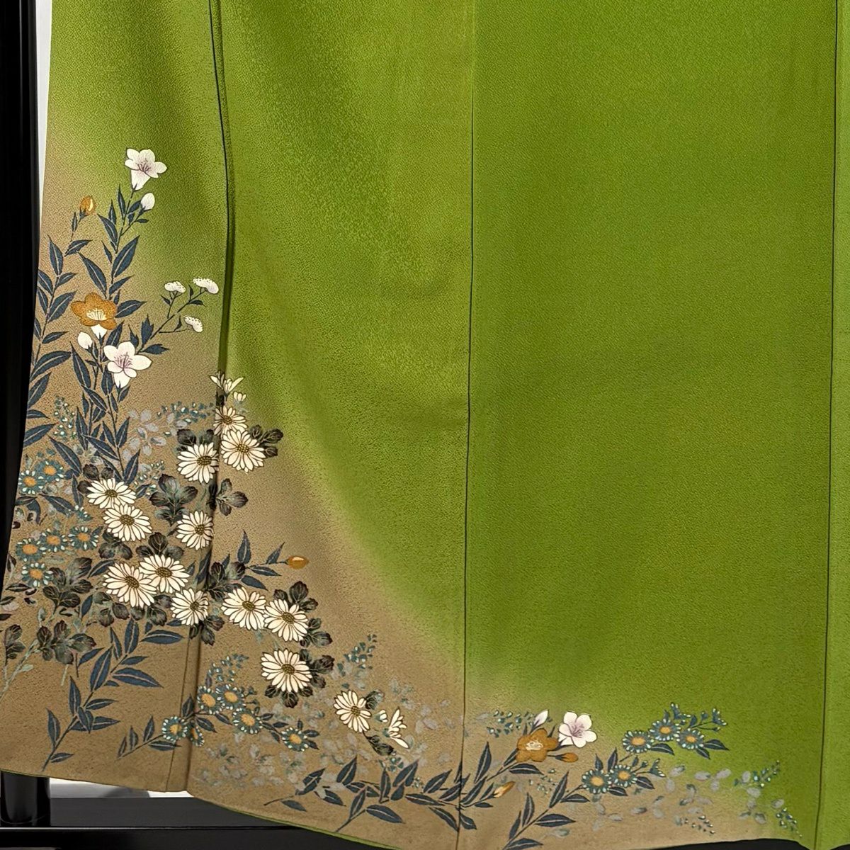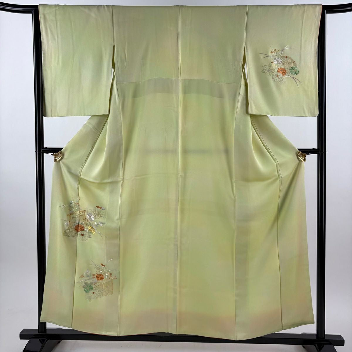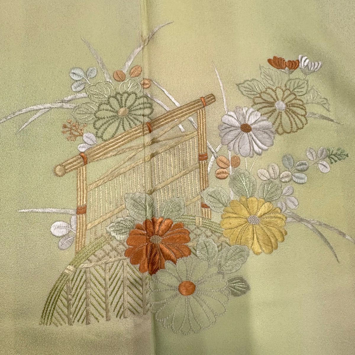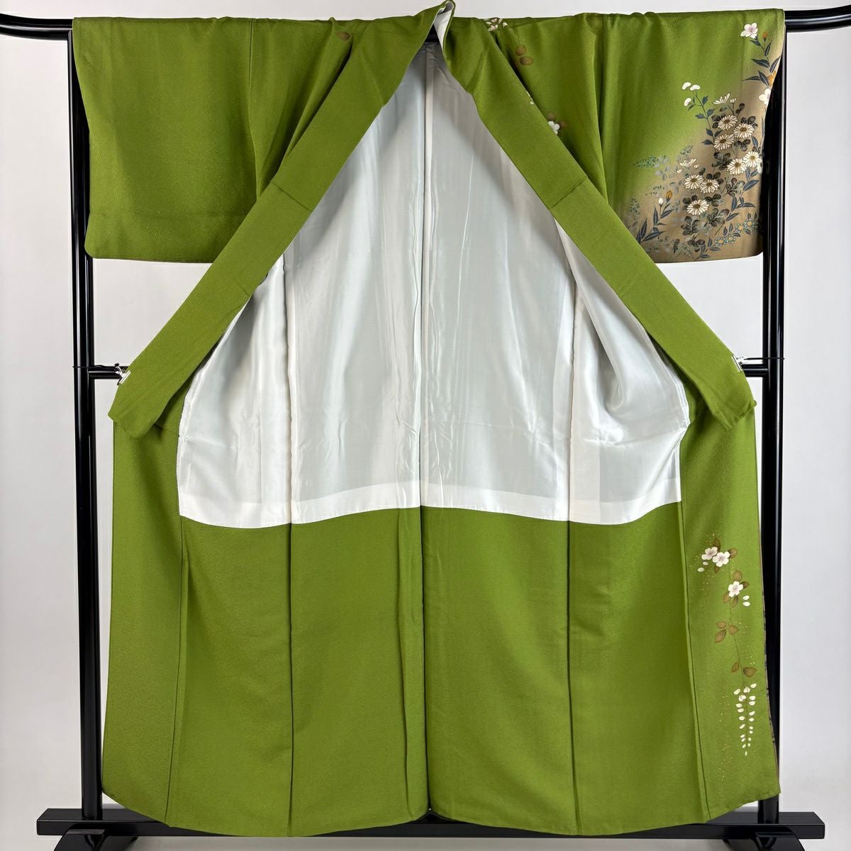 50%OFF 付下げ 身丈155cm 裄丈64cm M 袷 菊 垣根 刺繍 ぼかし 黄緑色 正絹 秀品 K50
