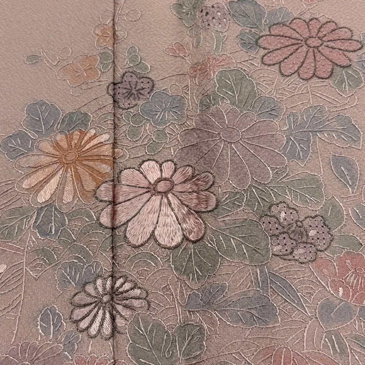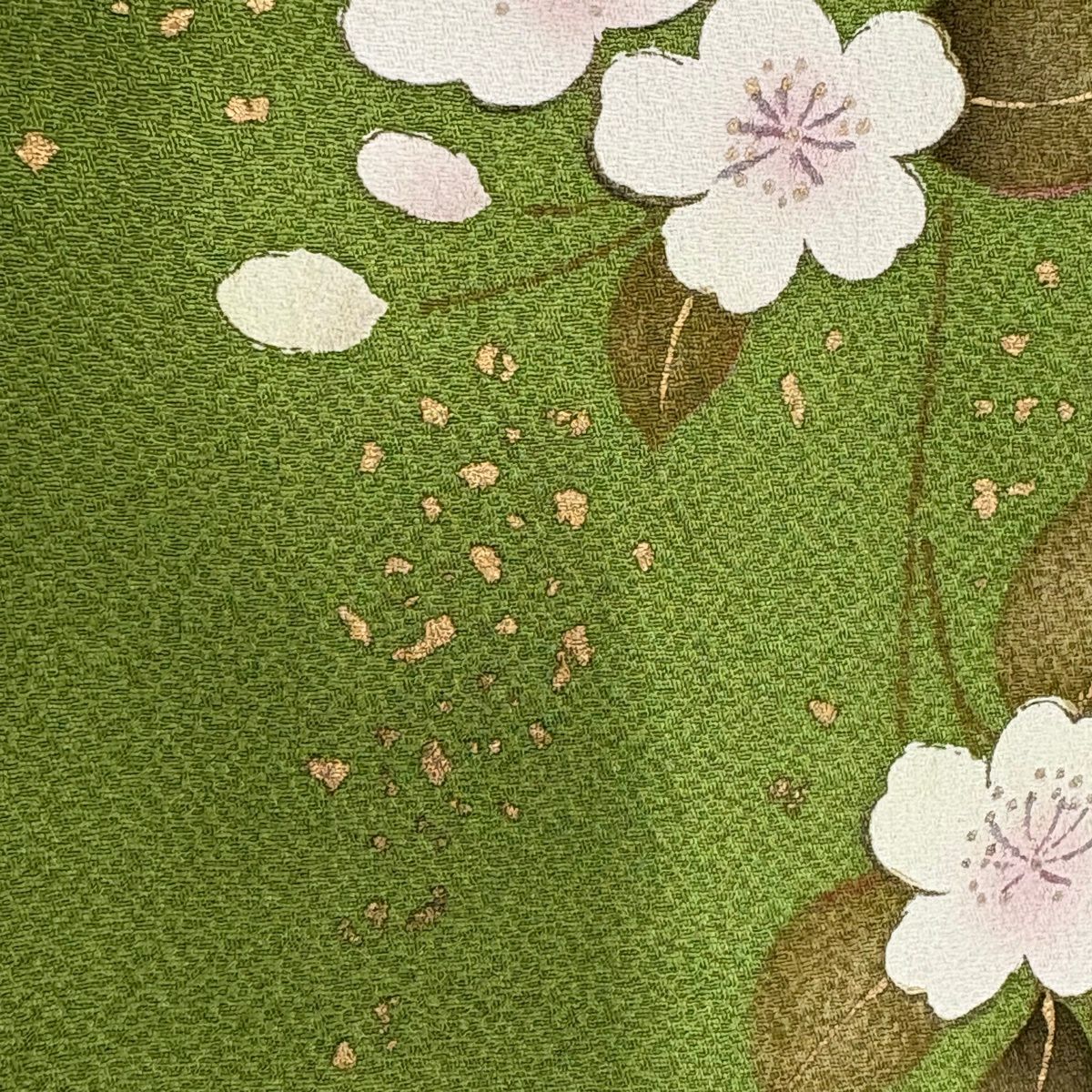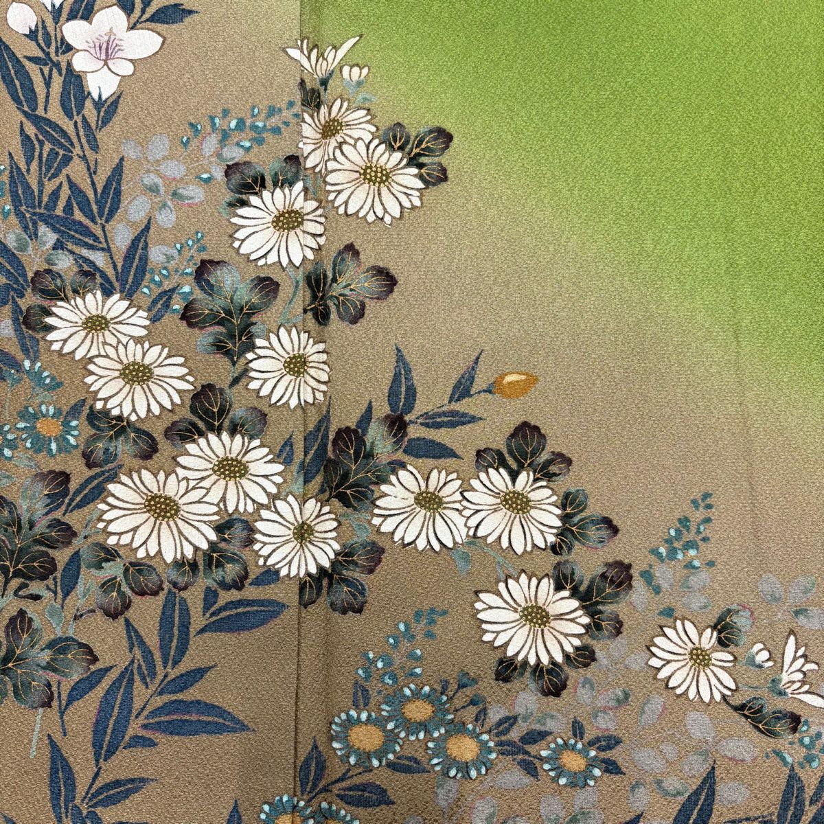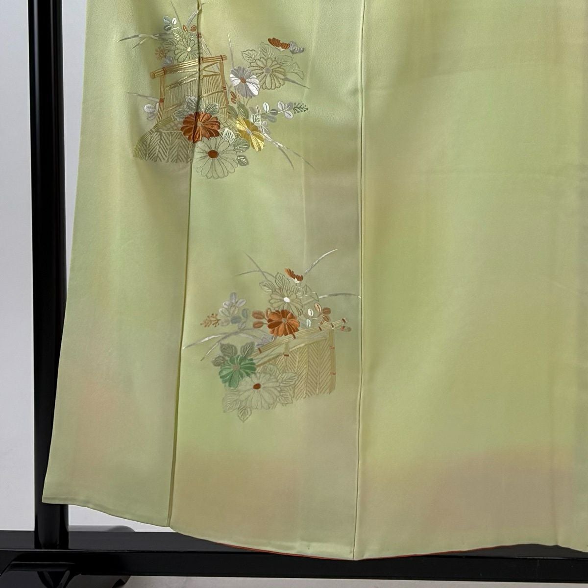 50%OFF 付下げ 身丈155cm 裄丈64cm M 袷 菊 垣根 刺繍 ぼかし 黄緑色 正絹 秀品 K50