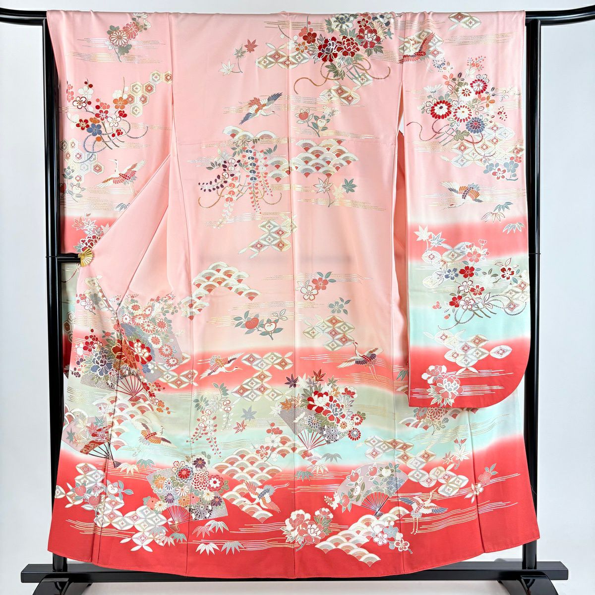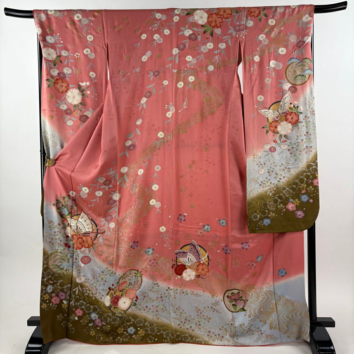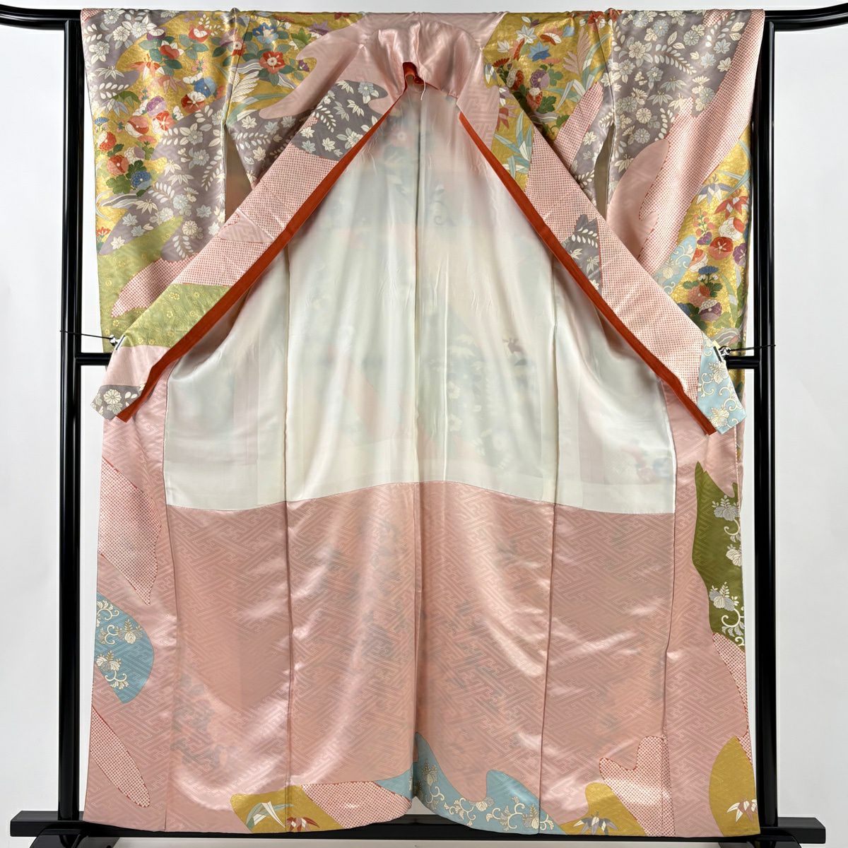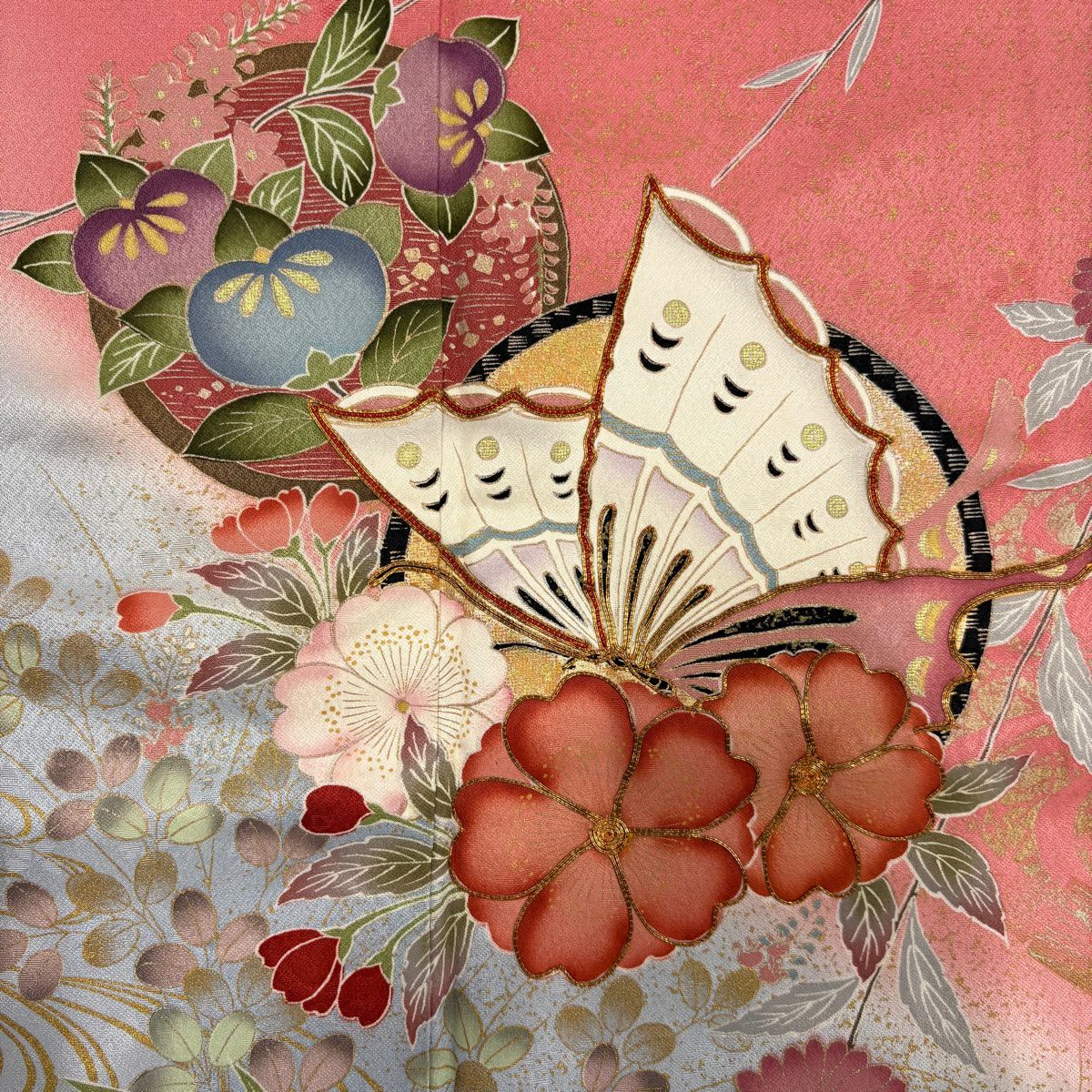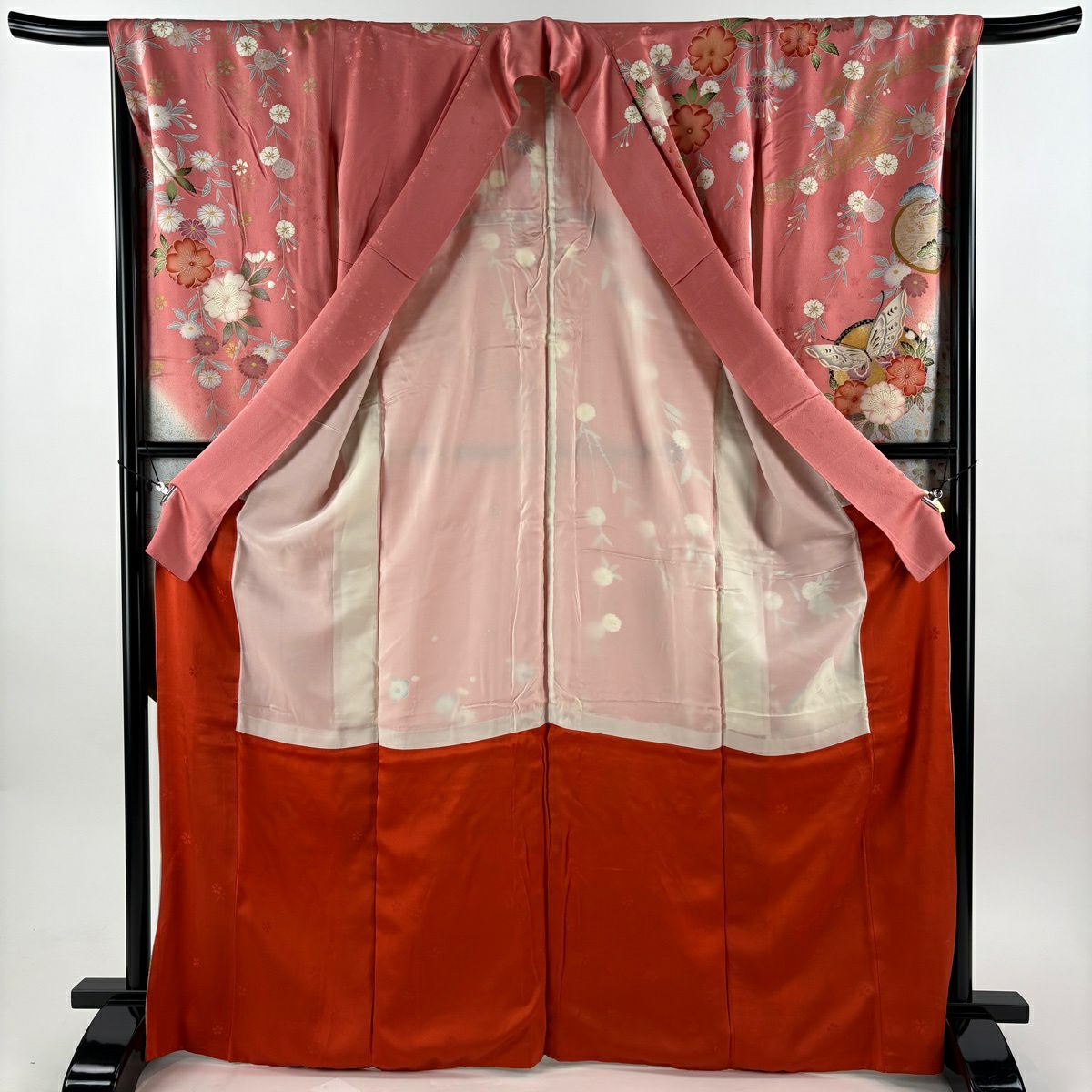 50%OFF 振袖 身丈166.5cm 裄丈67.5cm L 袷 蝶 梅 金糸 金銀彩 ピンク 正絹 秀品 K50