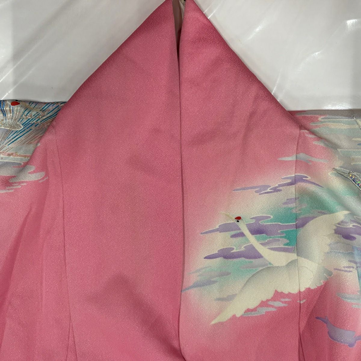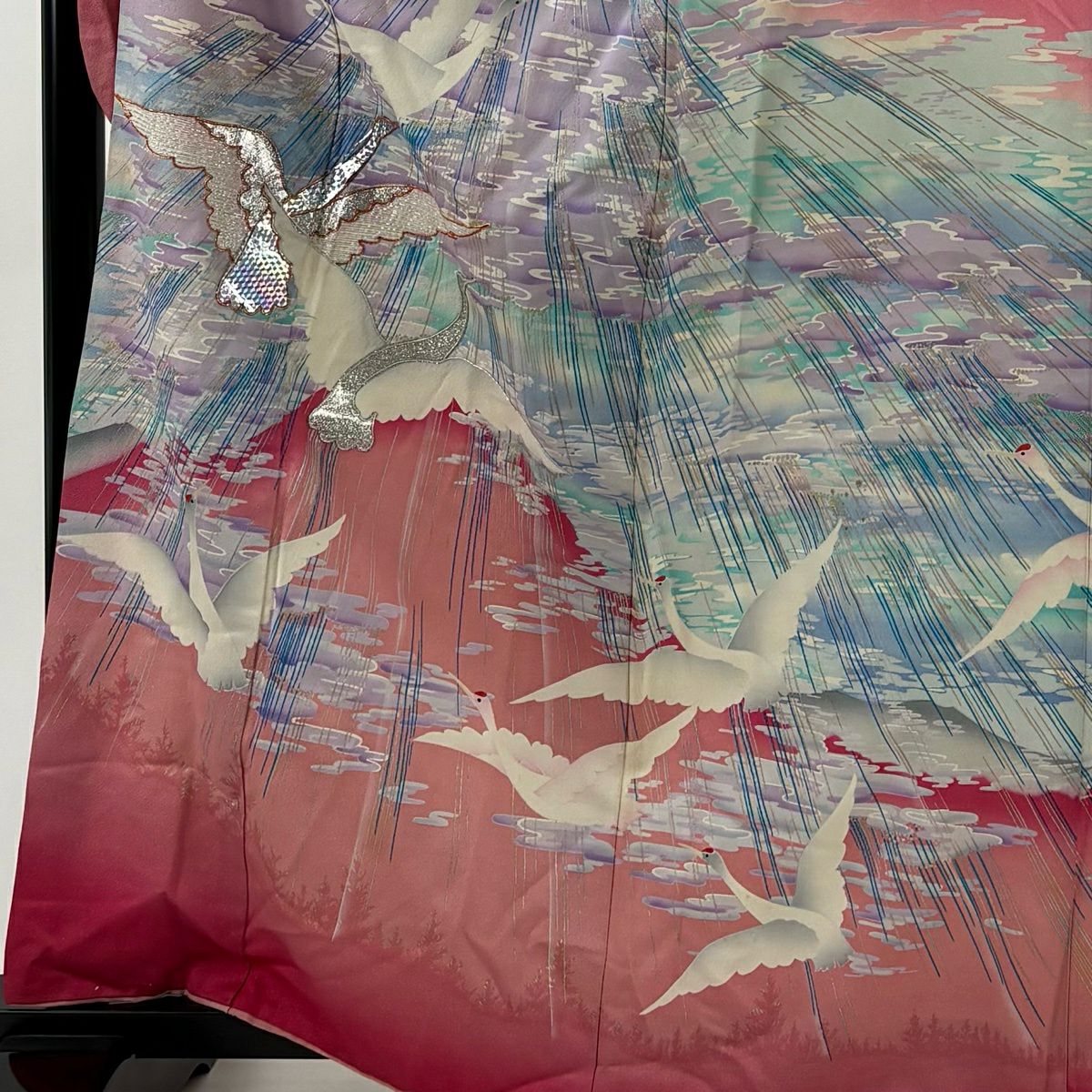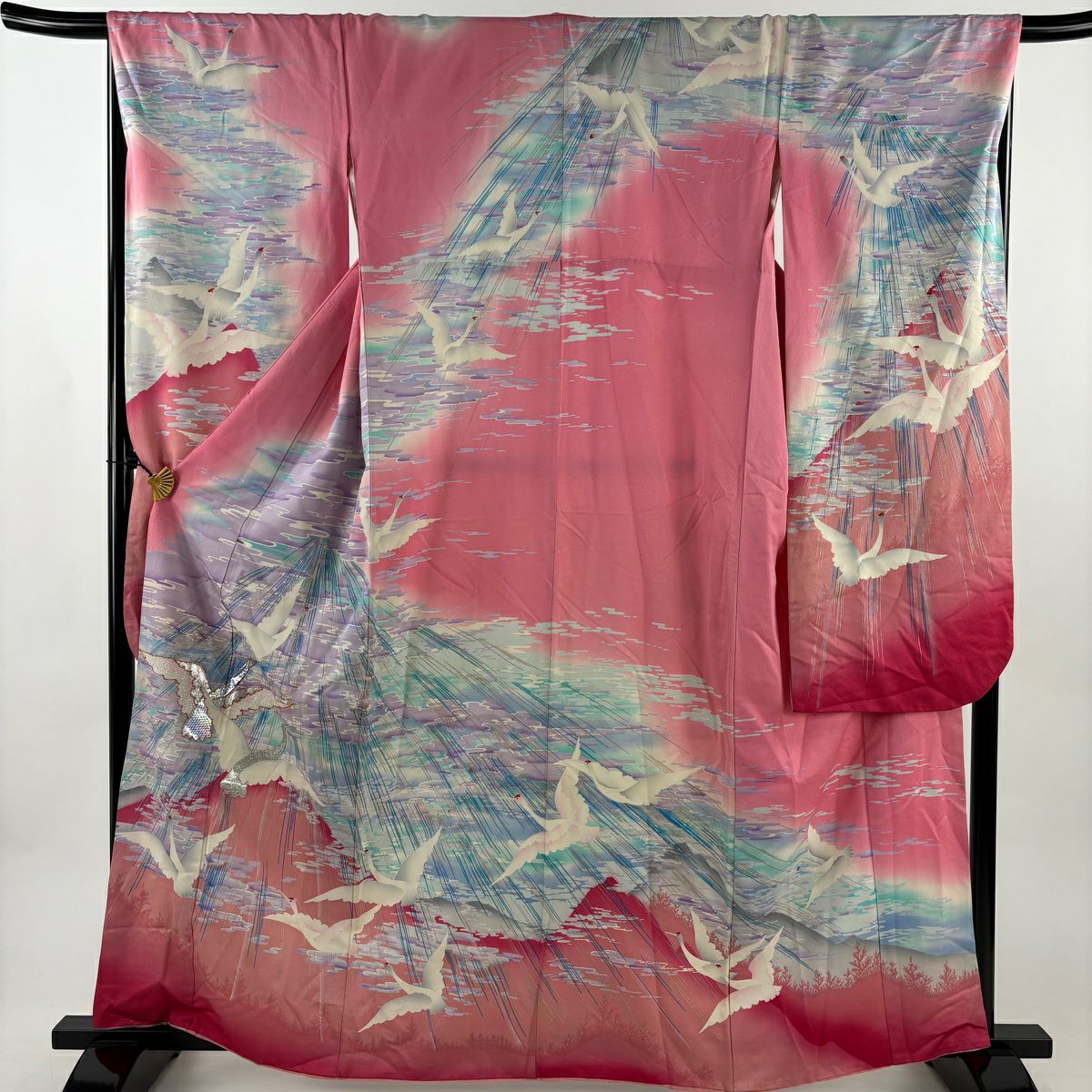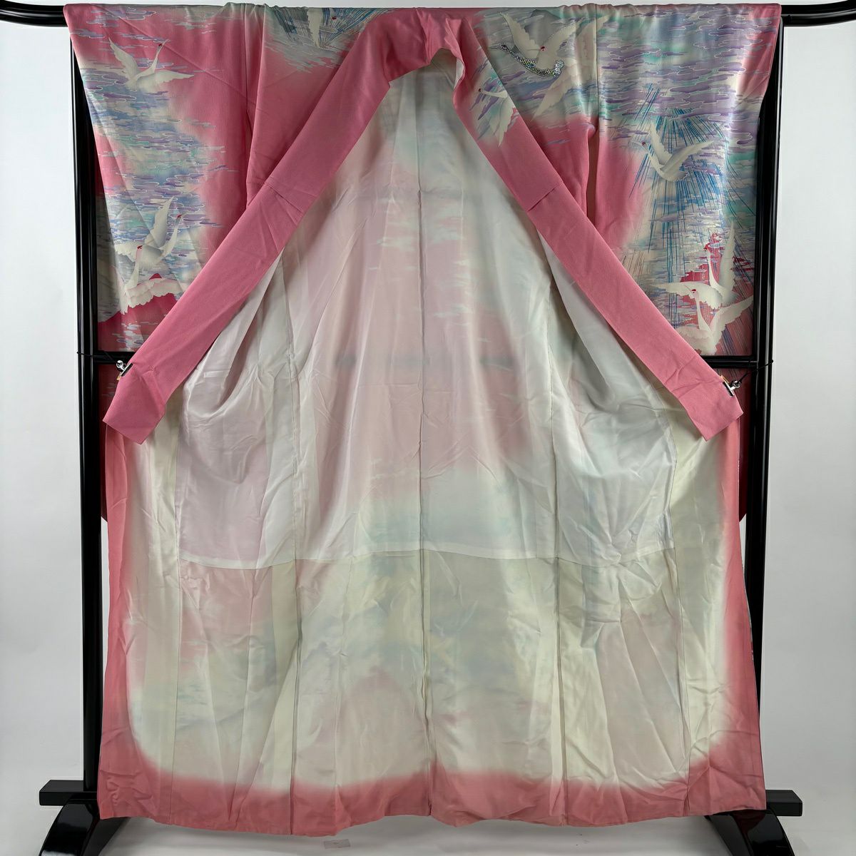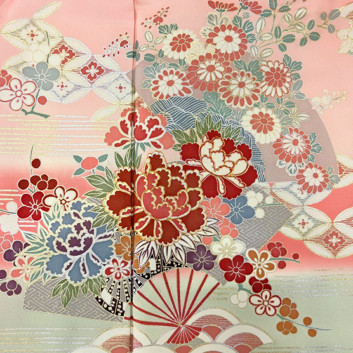 50%OFF 振袖 身丈166.5cm 裄丈67.5cm L 袷 蝶 梅 金糸 金銀彩 ピンク 正絹 秀品 K50