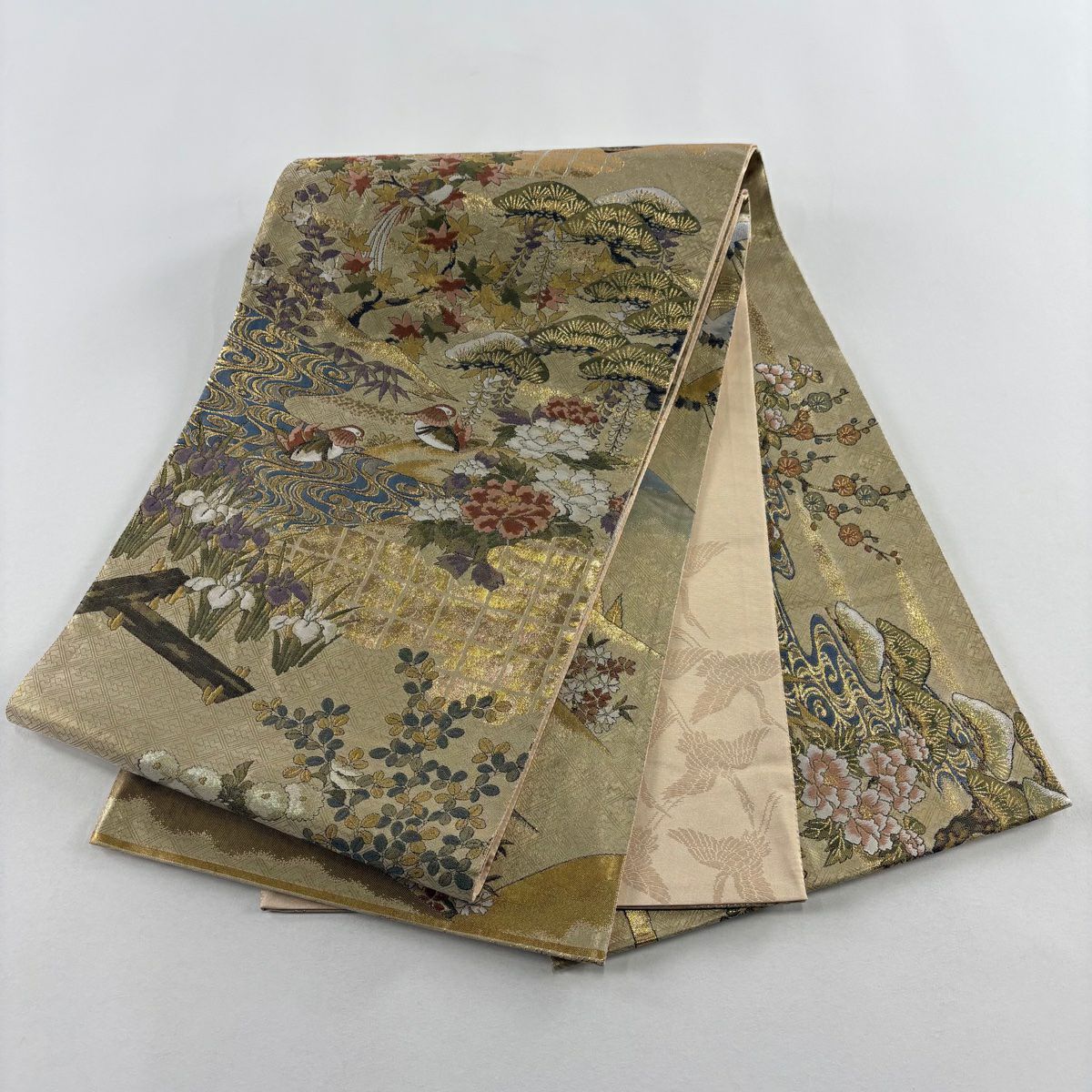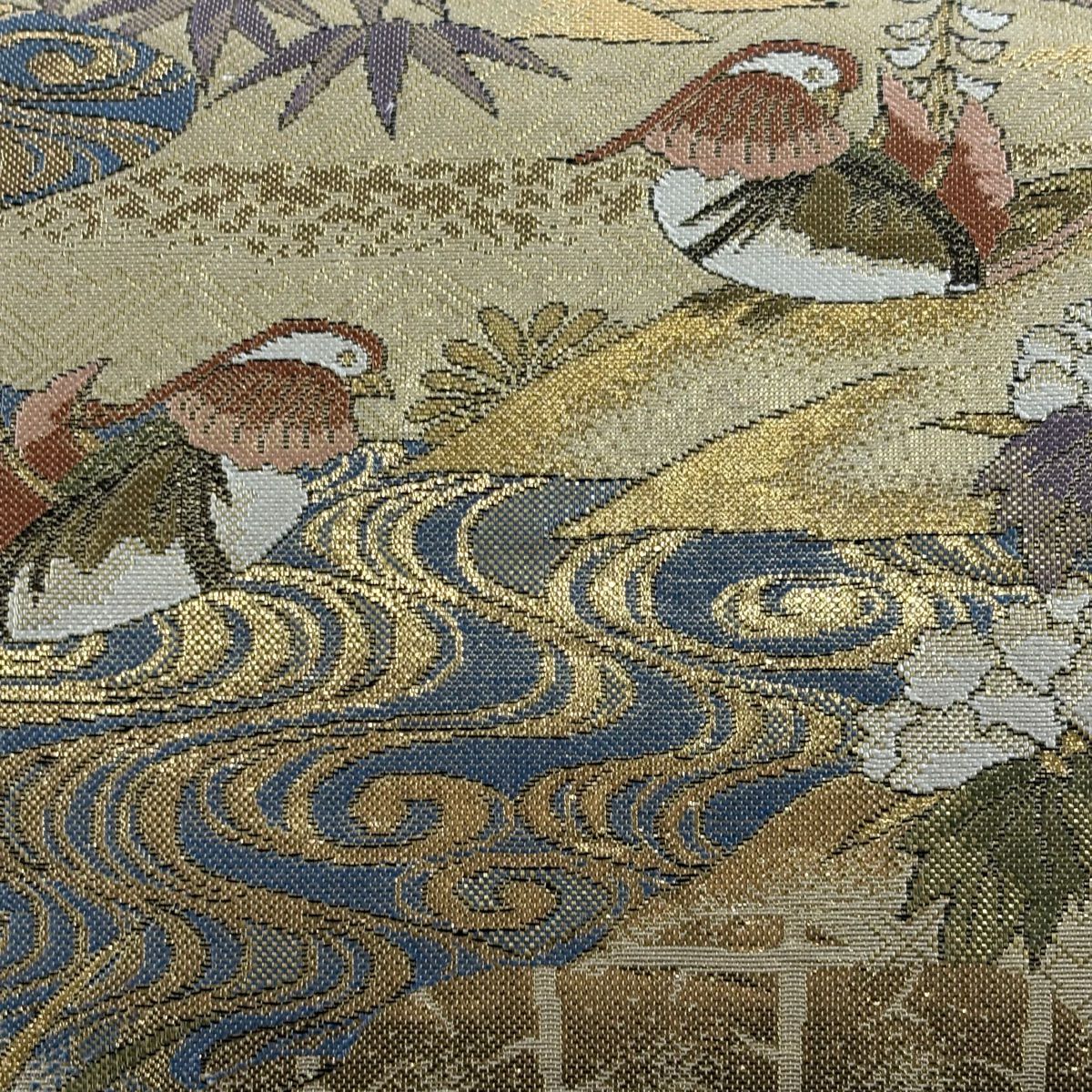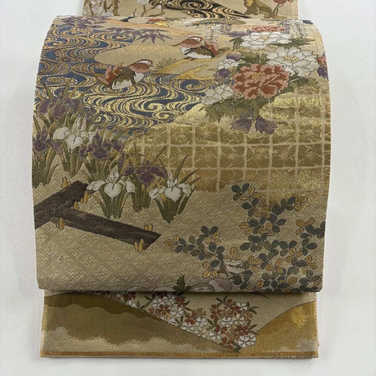 【最終値引き】 77%OFF 【美品】 袋帯 秀品 鴛鴦 草花 箔 金糸 ベージュ お太鼓柄 正絹 K70