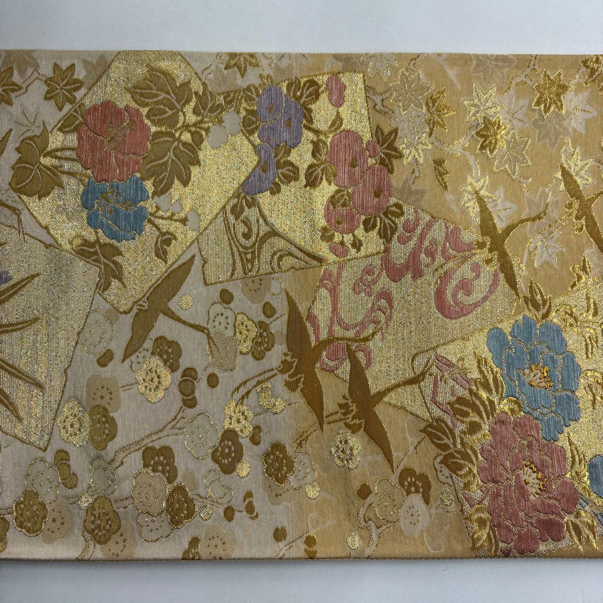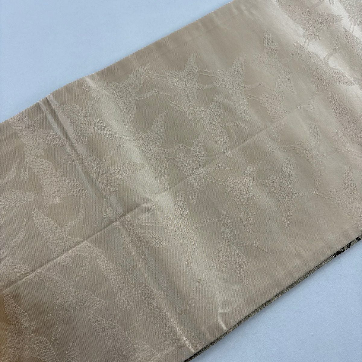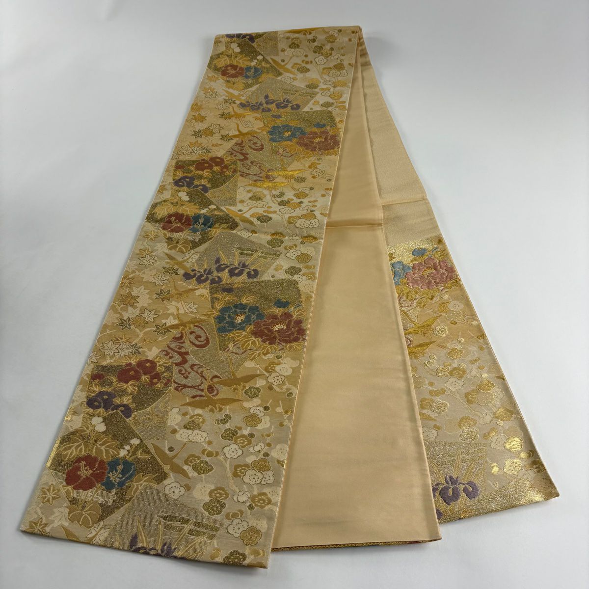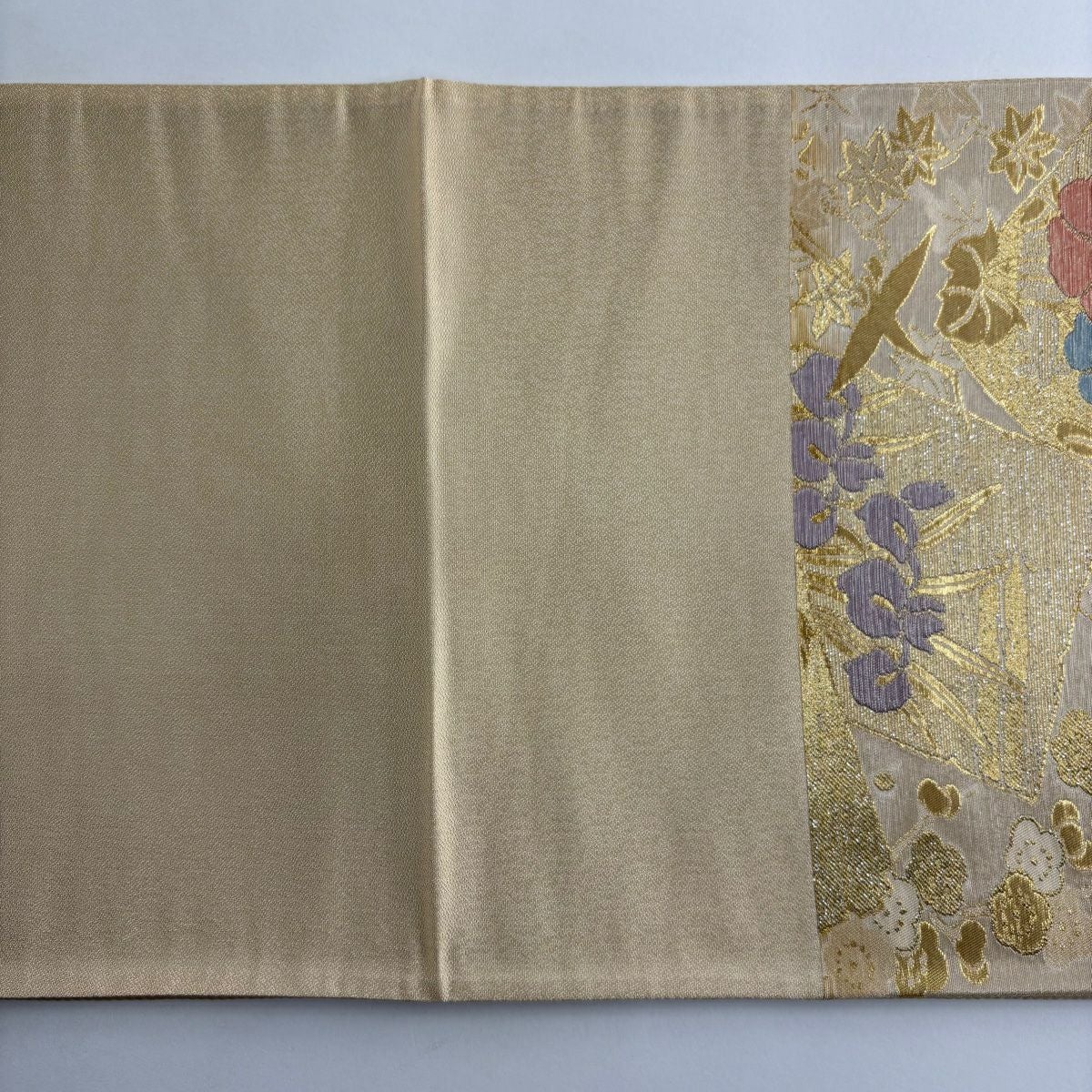 【最終値引き】 77%OFF 【美品】 袋帯 秀品 鴛鴦 草花 箔 金糸 ベージュ お太鼓柄 正絹 K70
