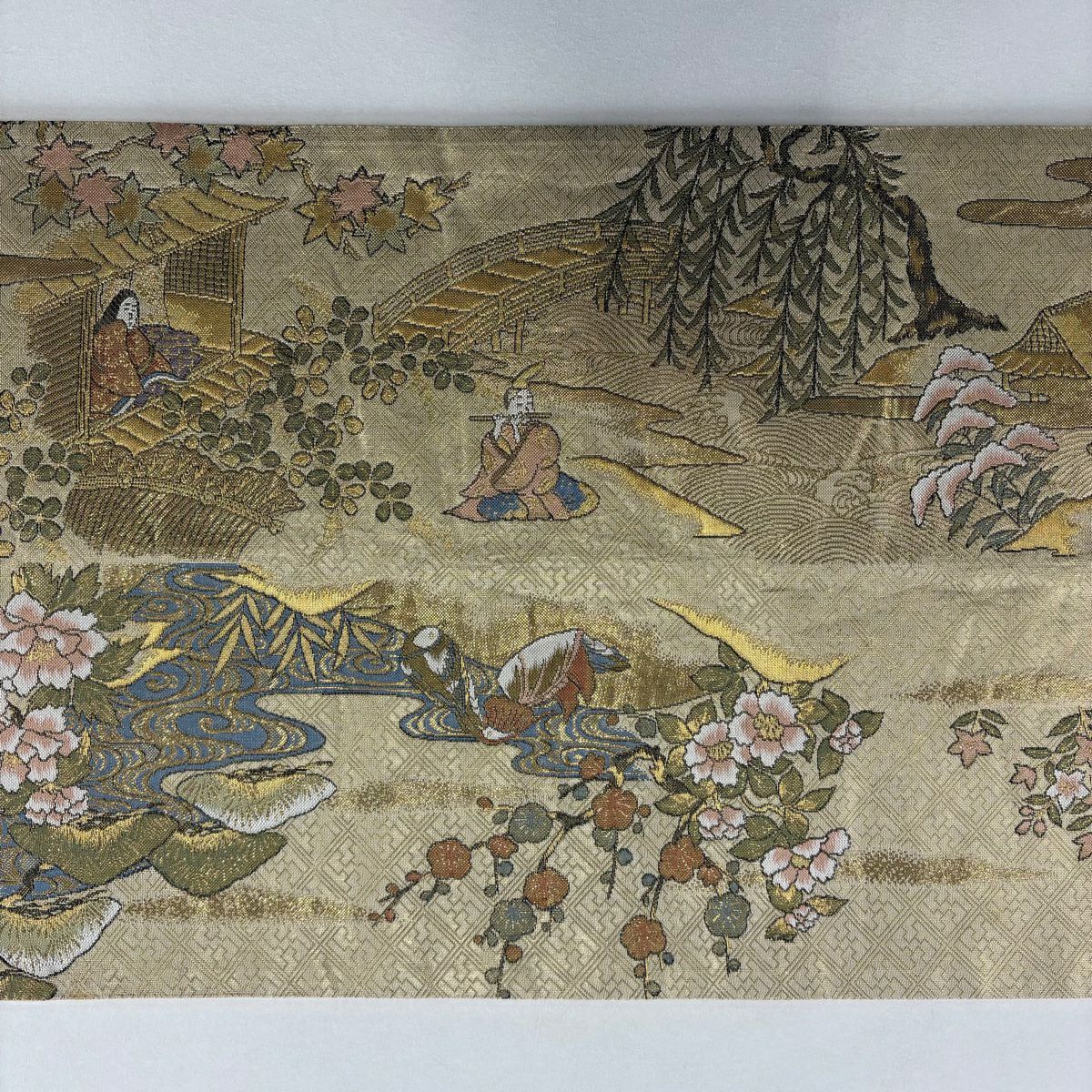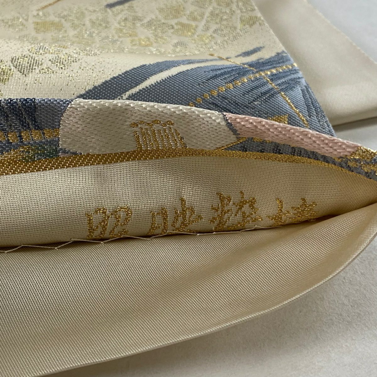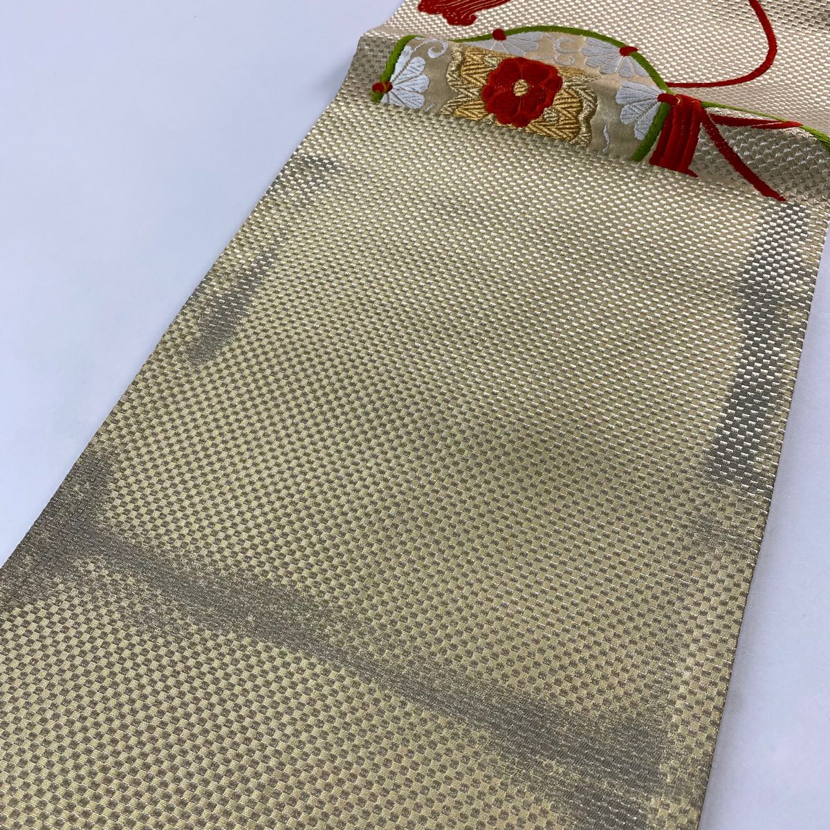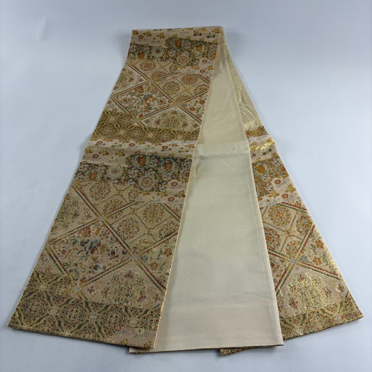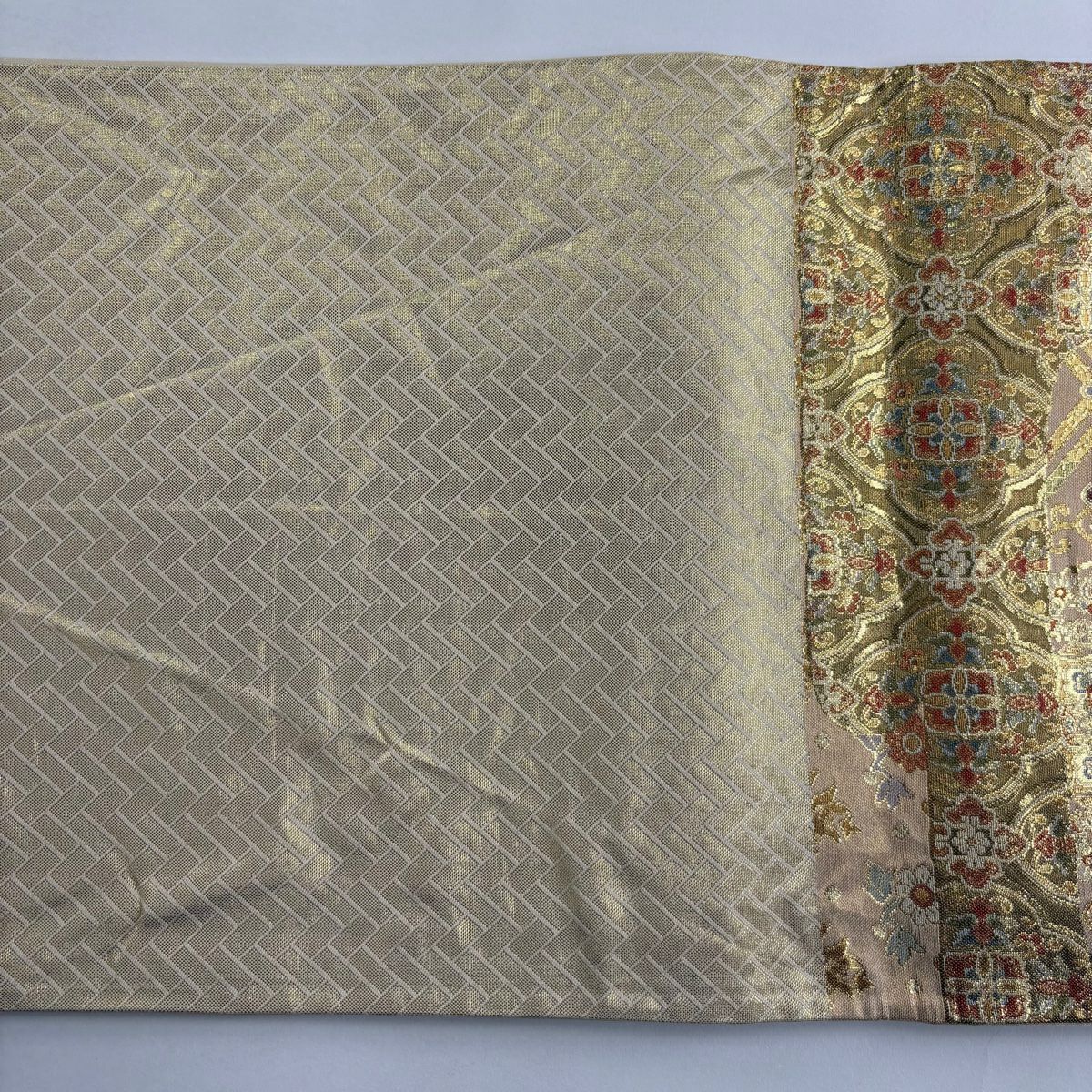 【最終値引き】 77%OFF 【美品】 袋帯 秀品 関西仕立て 流水 菱 箔 ベージュ 全通 正絹 K70