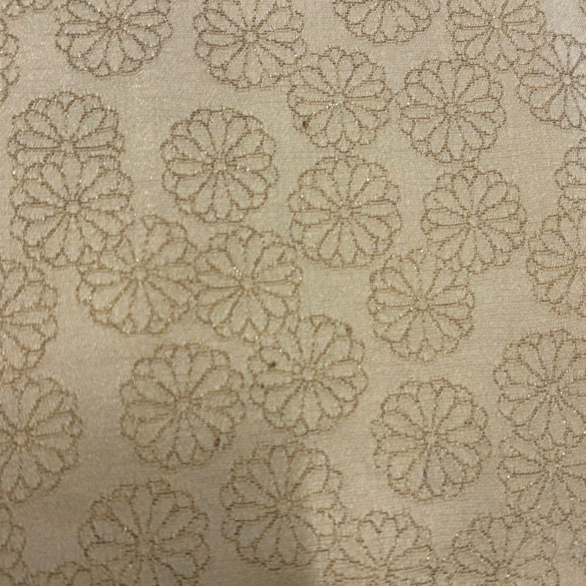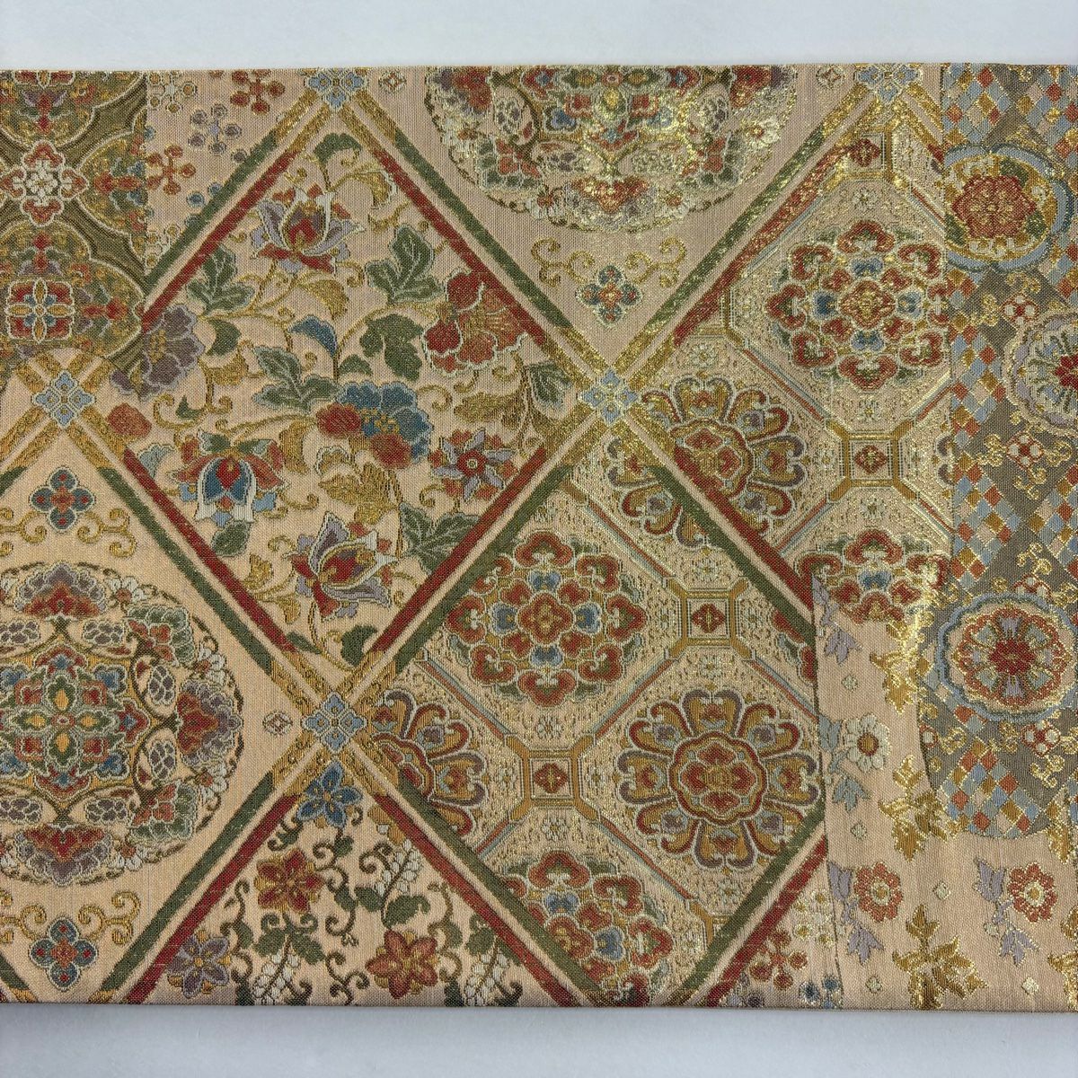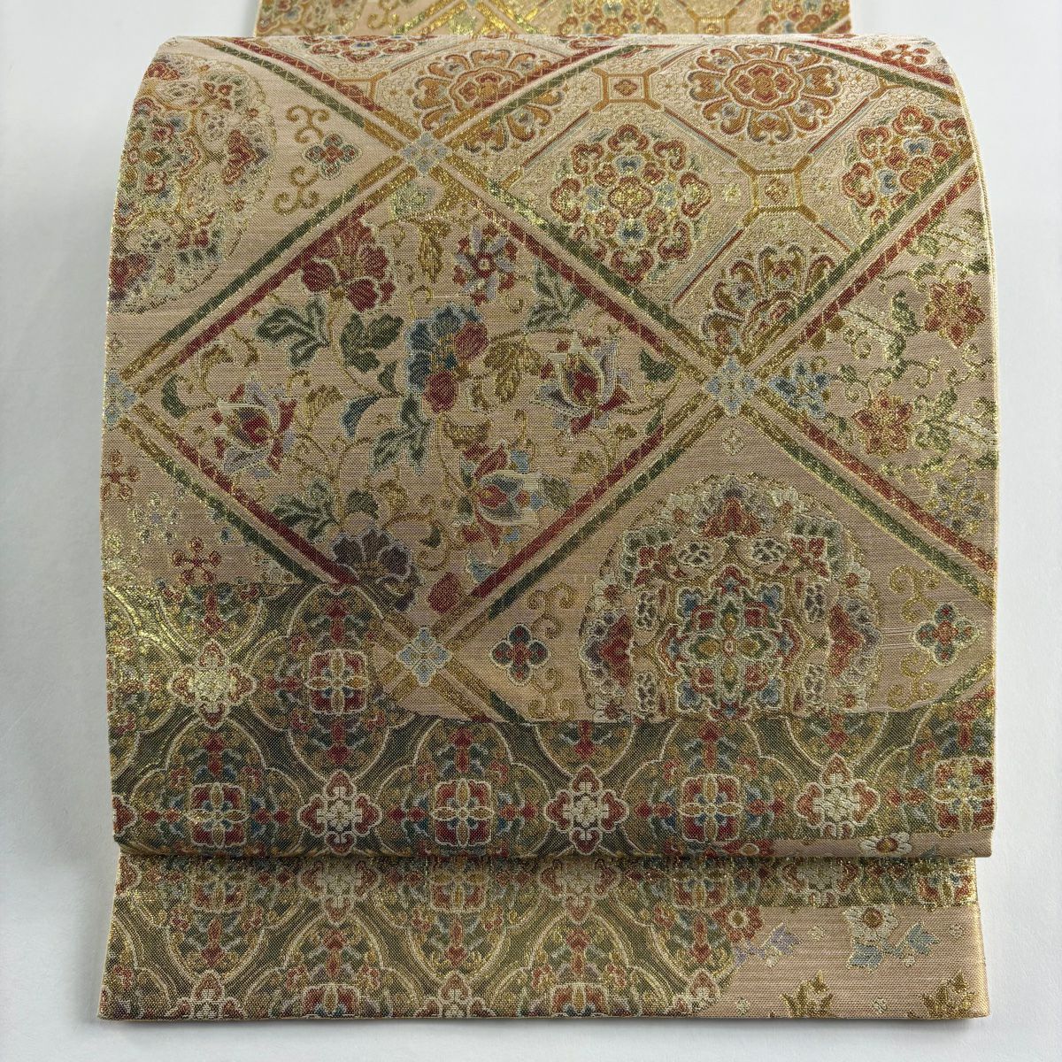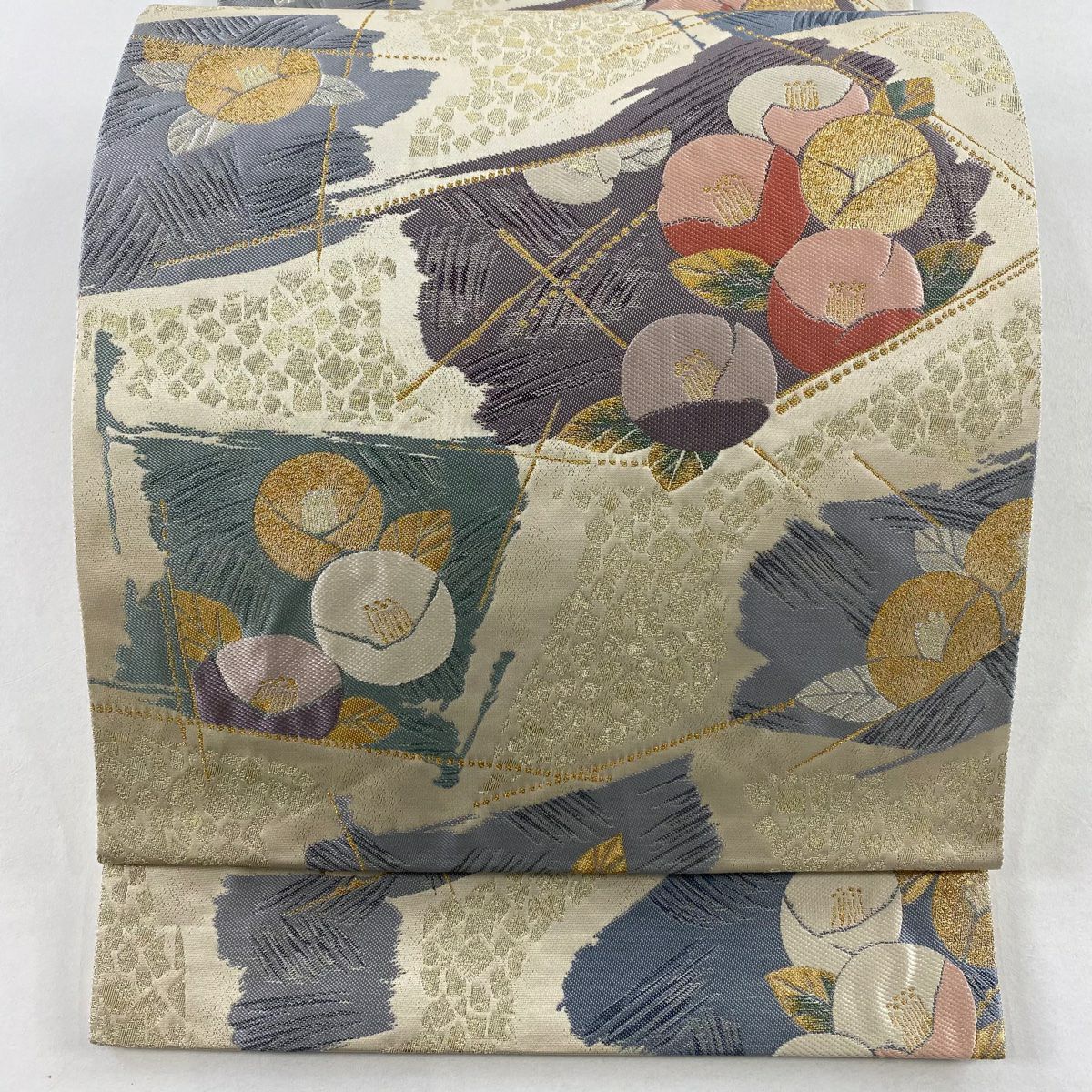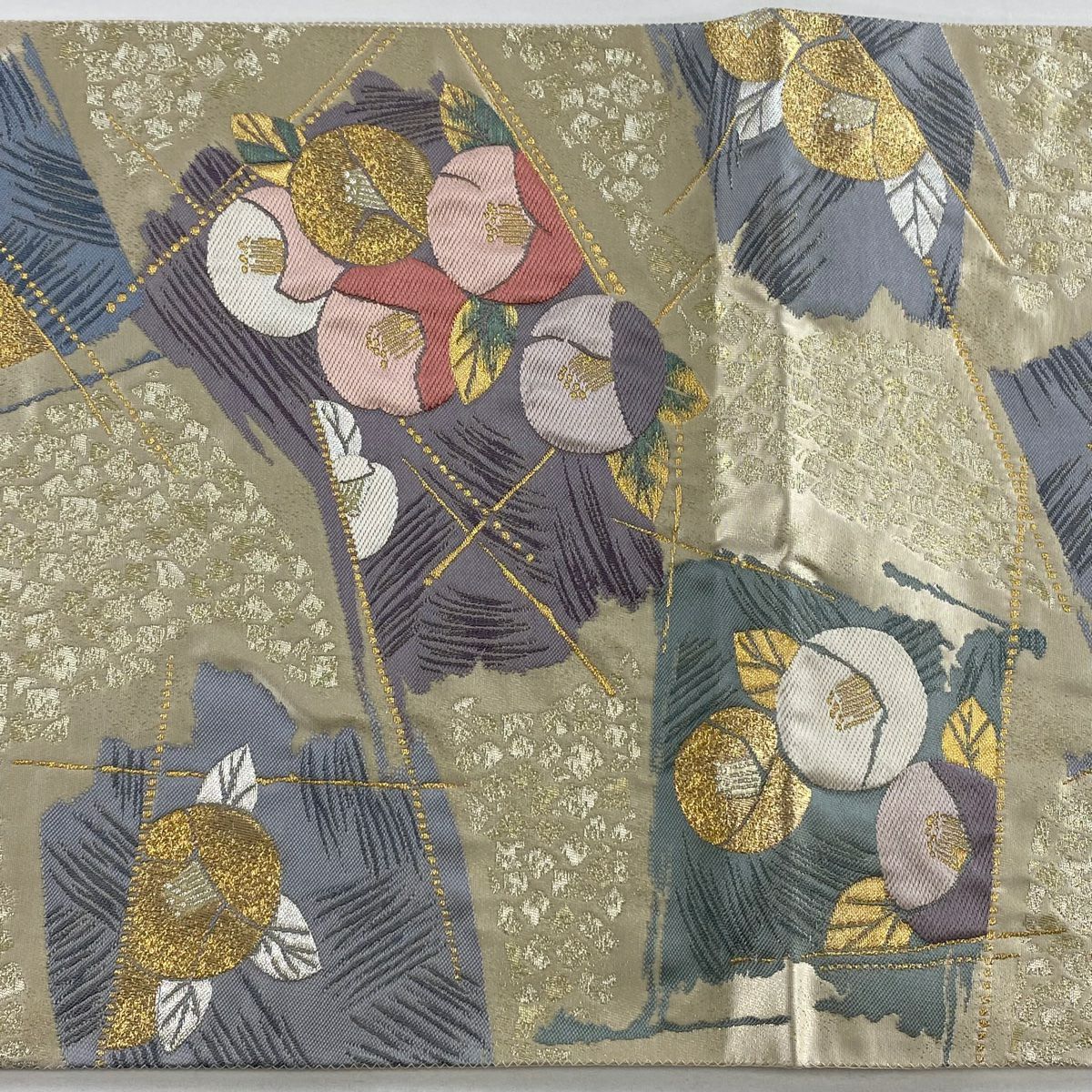 【最終値引き】 70%OFF 袋帯 秀品 照映粋椿 幾何学模様 金銀糸 箔 ベージュ 六通 正絹 K70