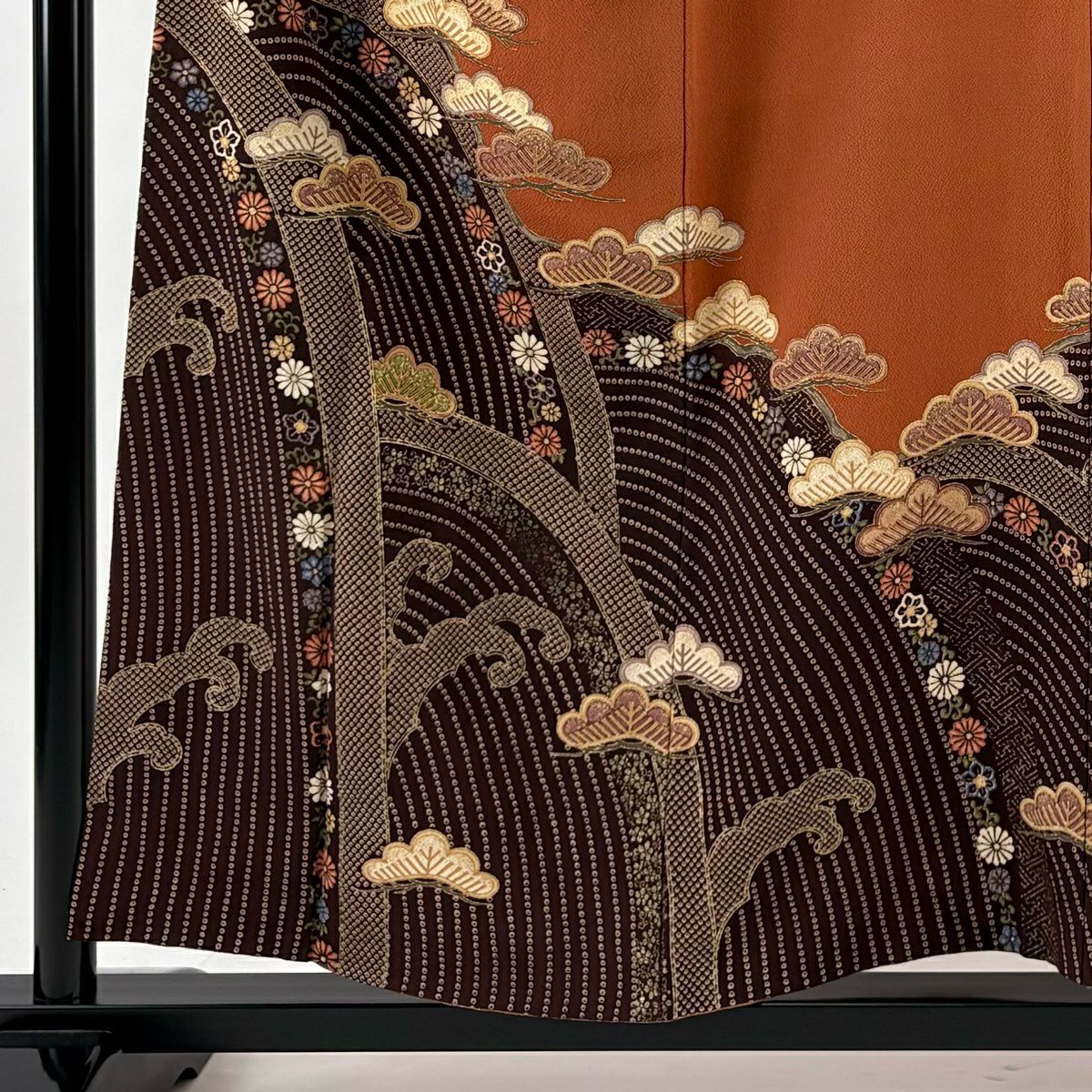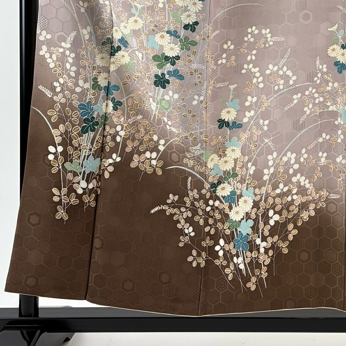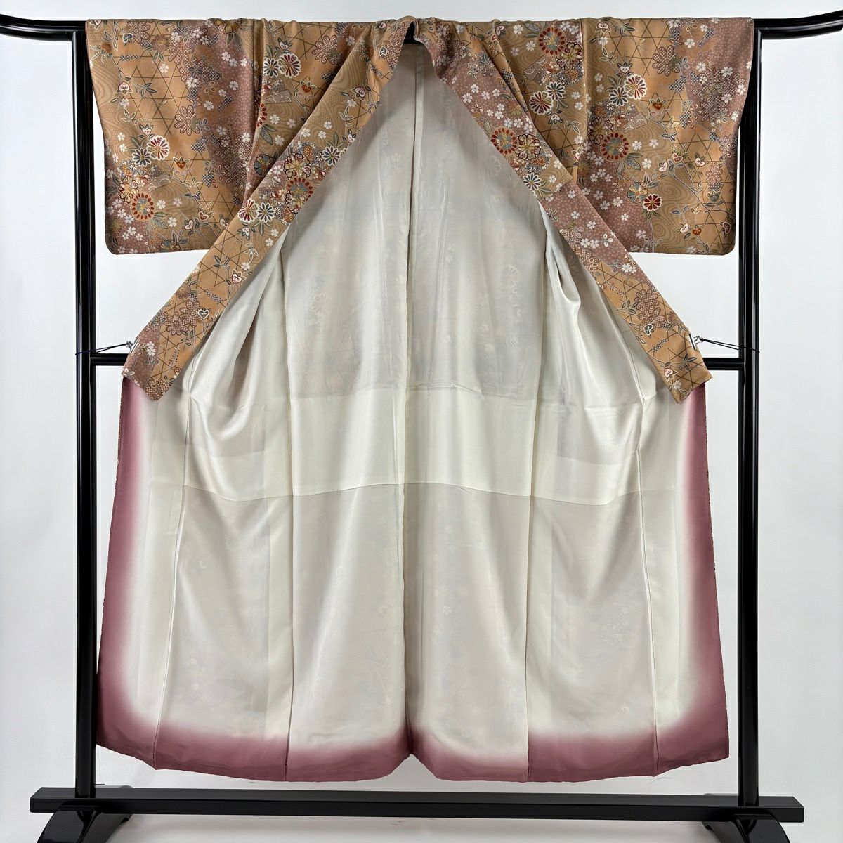 【在庫一掃】 付下げ 身丈157cm 裄丈63cm S 袷 松 菊唐草 金糸 ぼかし 茶紫 正絹 秀品 一つ紋