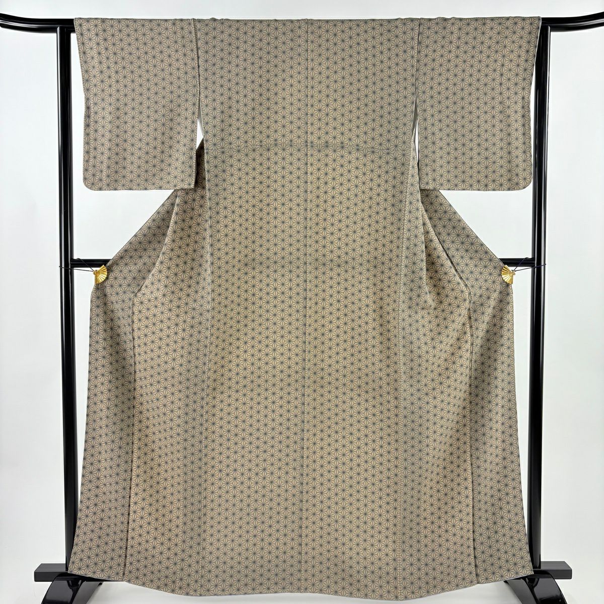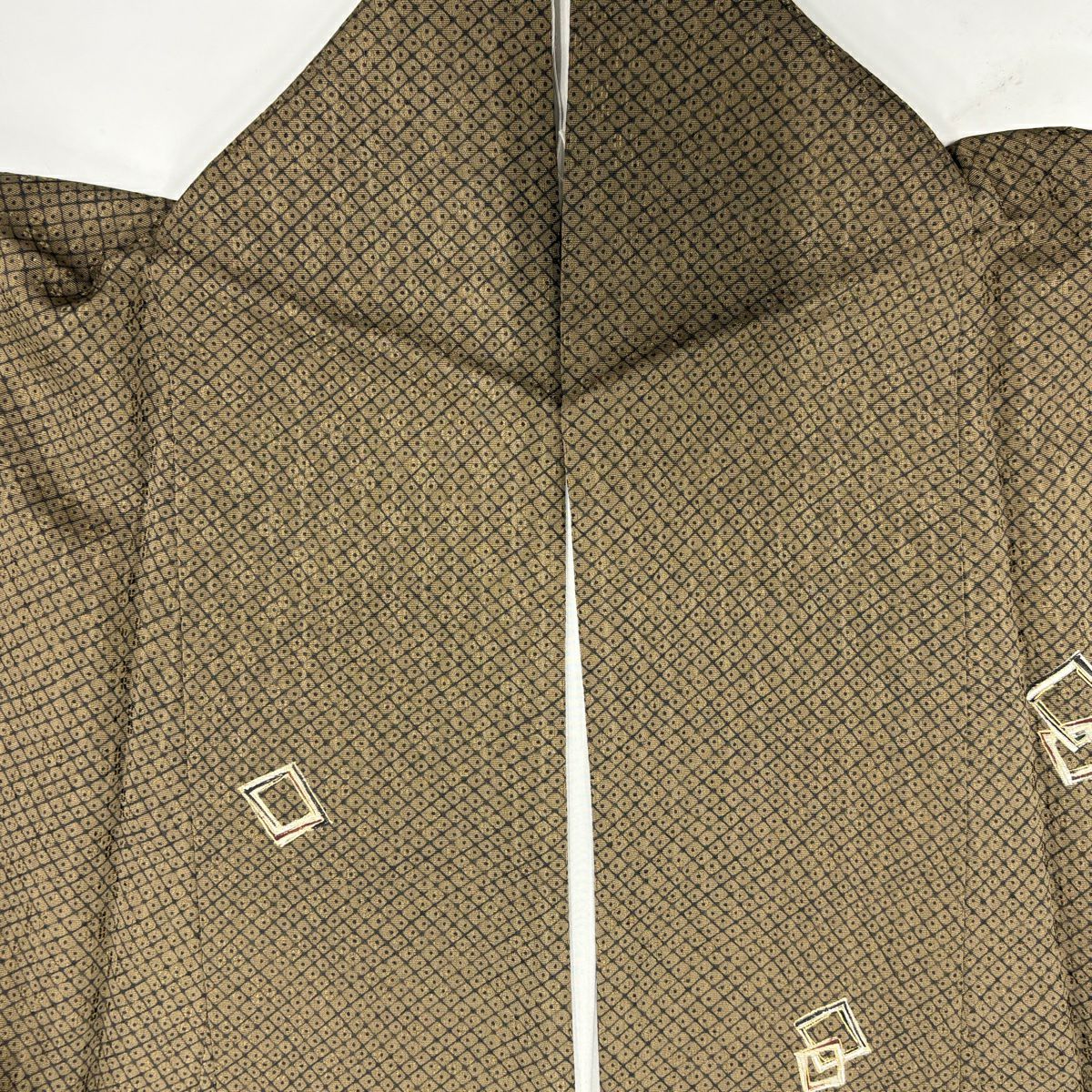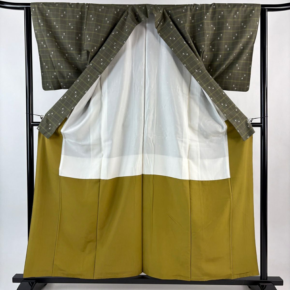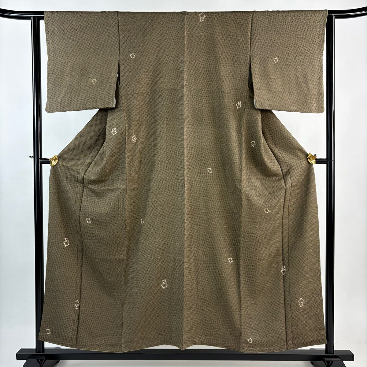 70%OFF 小紋 身丈155cm 裄丈63cm S 袷 幾何学模様 疋田柄 金彩 茶緑色 正絹 秀品 K70