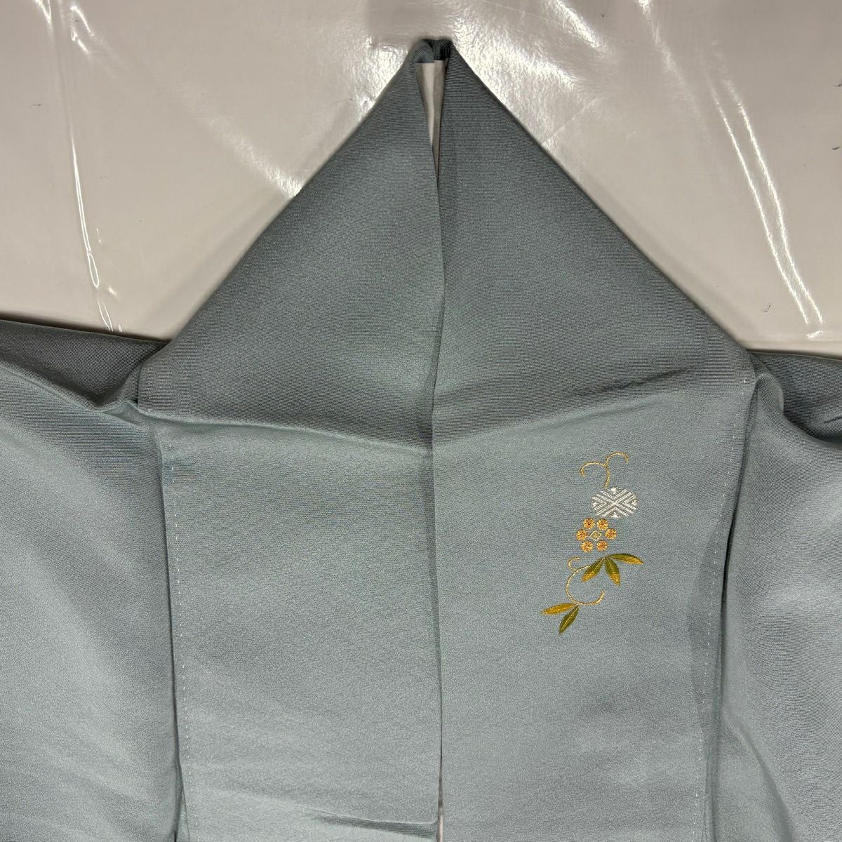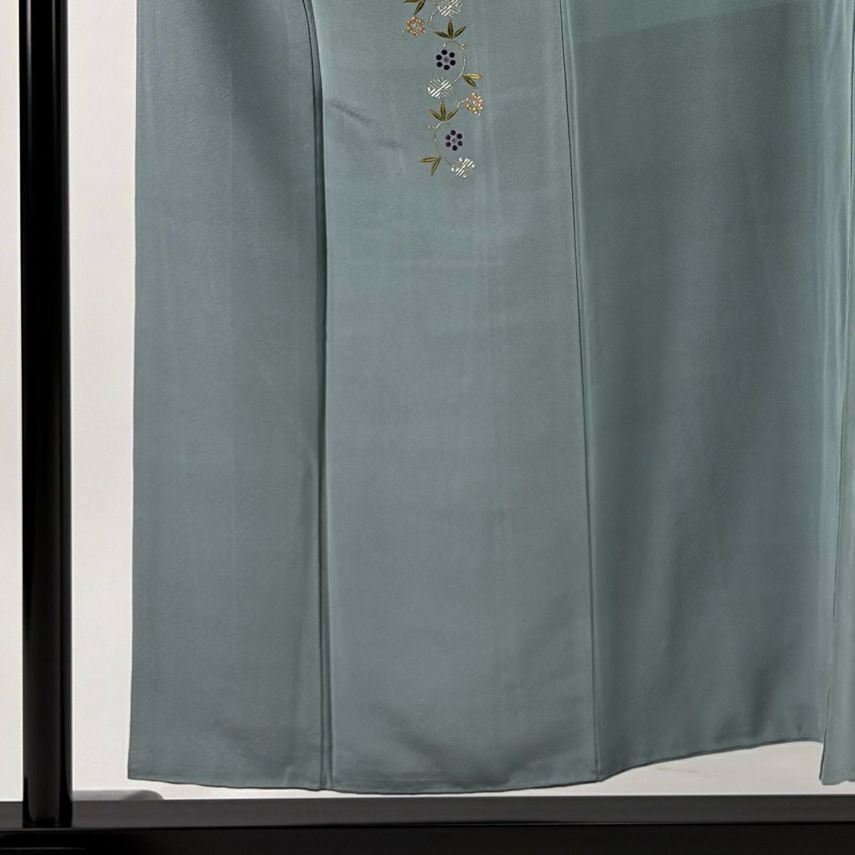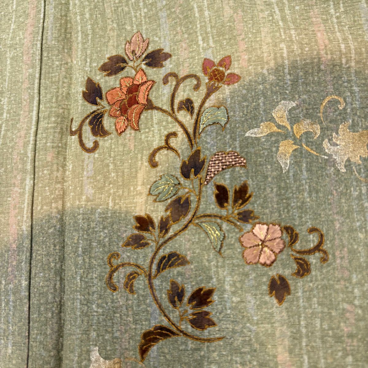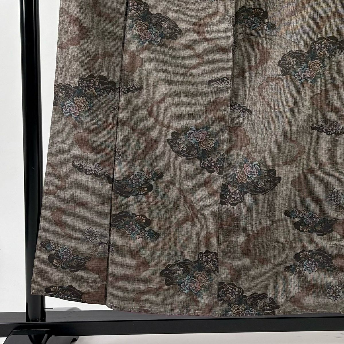 【在庫一掃】 【美品】 道行 身丈125cm 裄丈64.5cm M 和装コート 都衿 草花 器物 灰緑 正絹 秀品