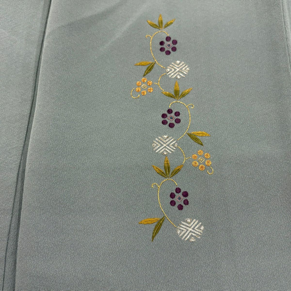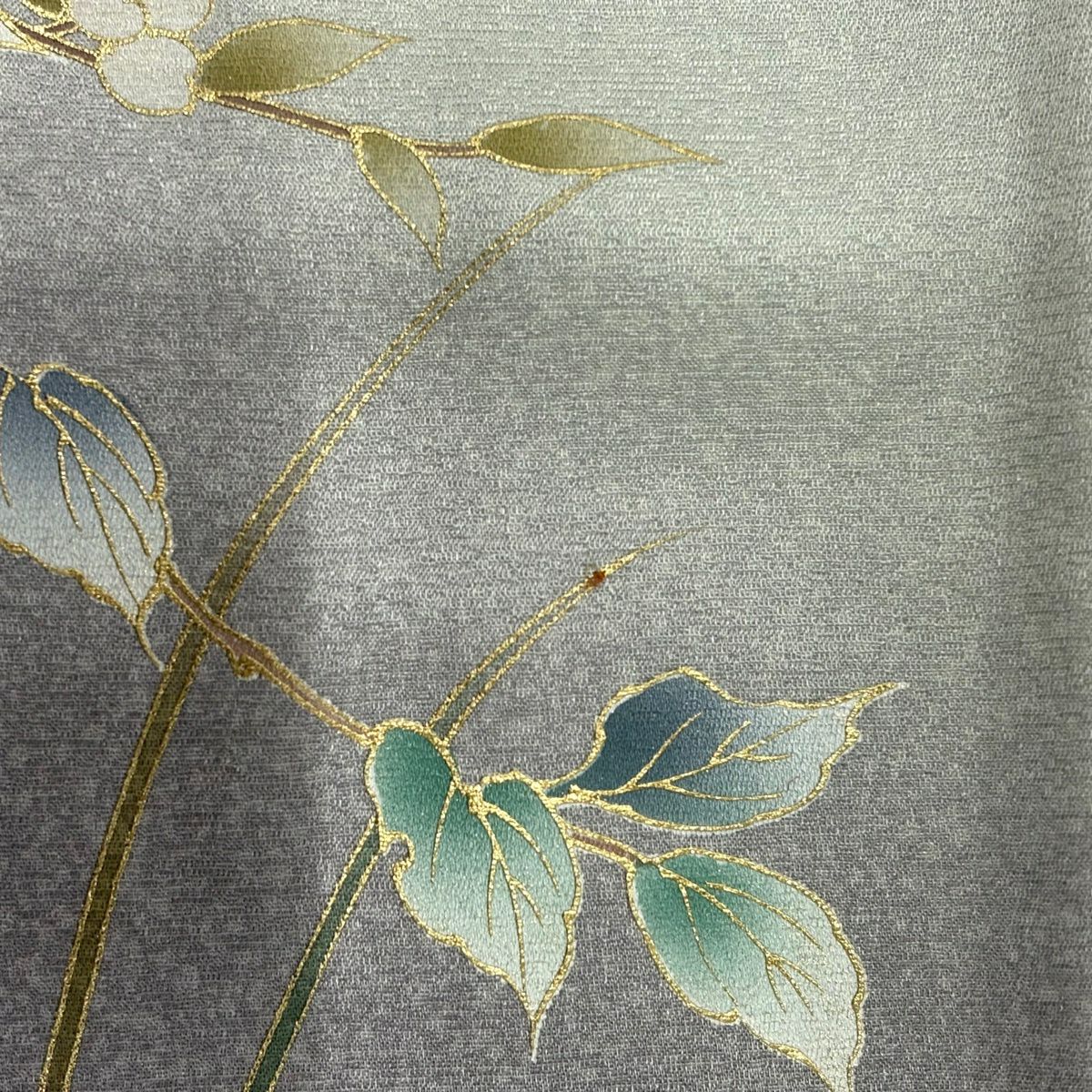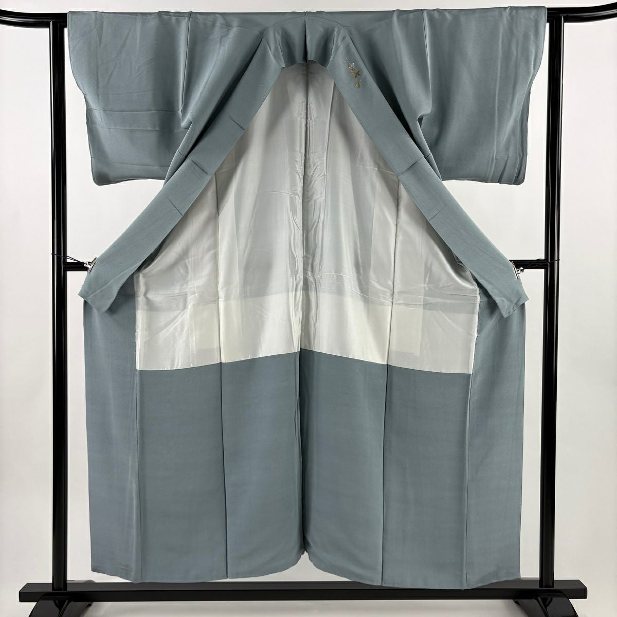【在庫一掃】 付下げ 身丈157cm 裄丈64.5cm M 袷 落款あり 葉と実 刺繍 金糸 灰緑 正絹 秀品