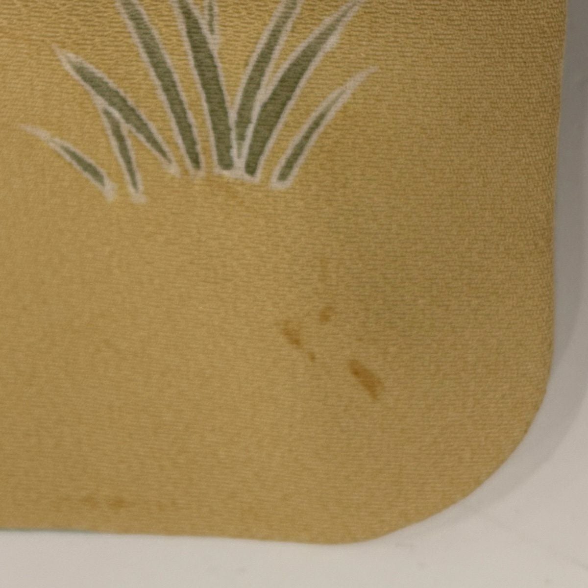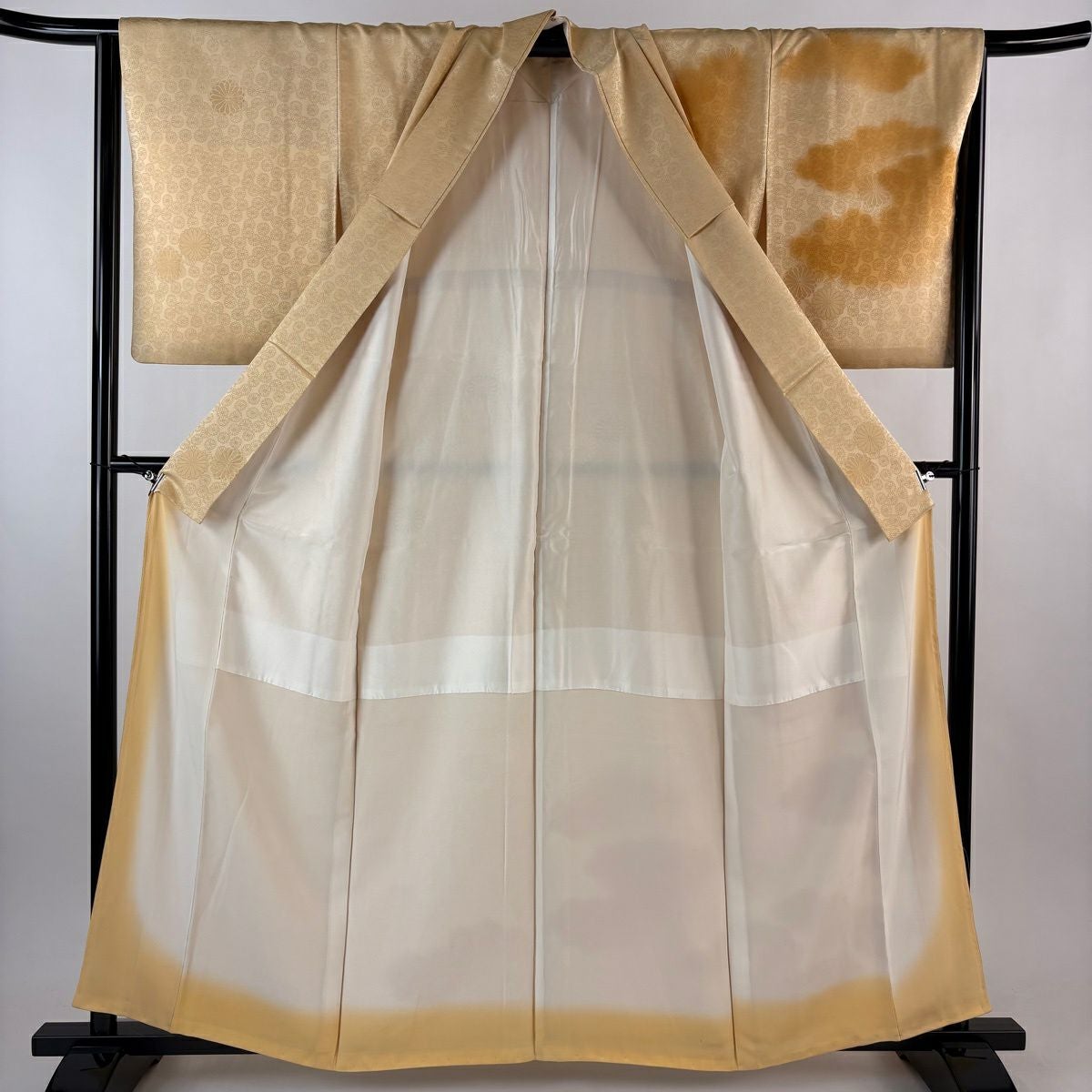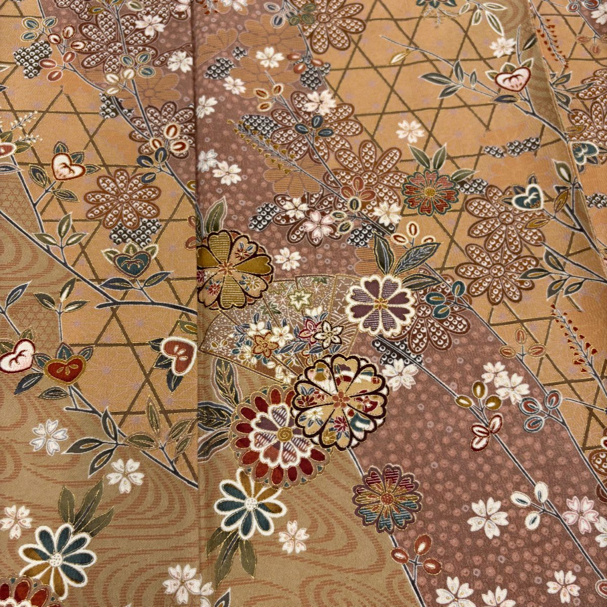 【在庫一掃】 【美品】 付下げ 身丈161cm 裄丈64cm M 袷 扇面 草花 刺繍 絞り 黄土色 正絹 秀品