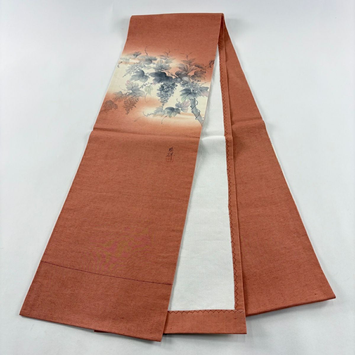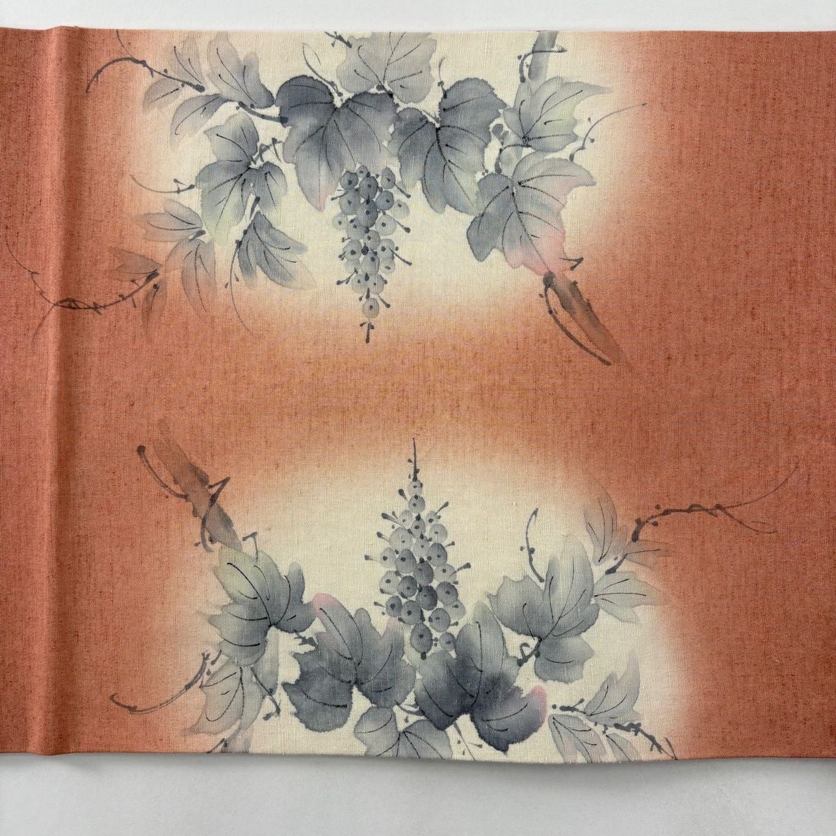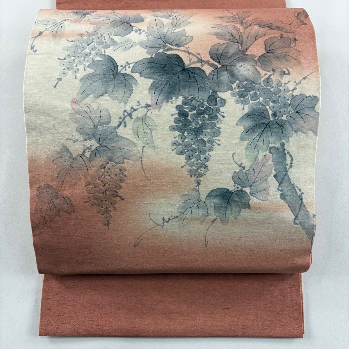 【最終値引き】 77%OFF 【美品】 袋帯 秀品 紬地 陶漆 丸紋 葉と実 薄オレンジ 六通 正絹 K70
