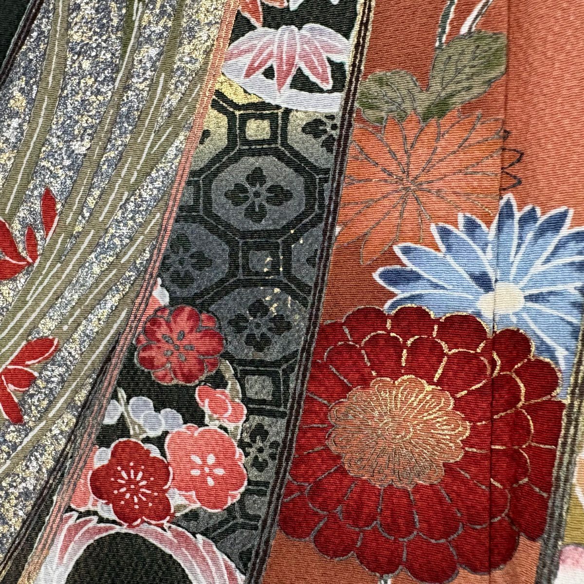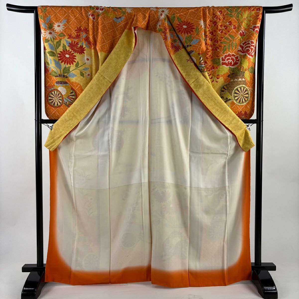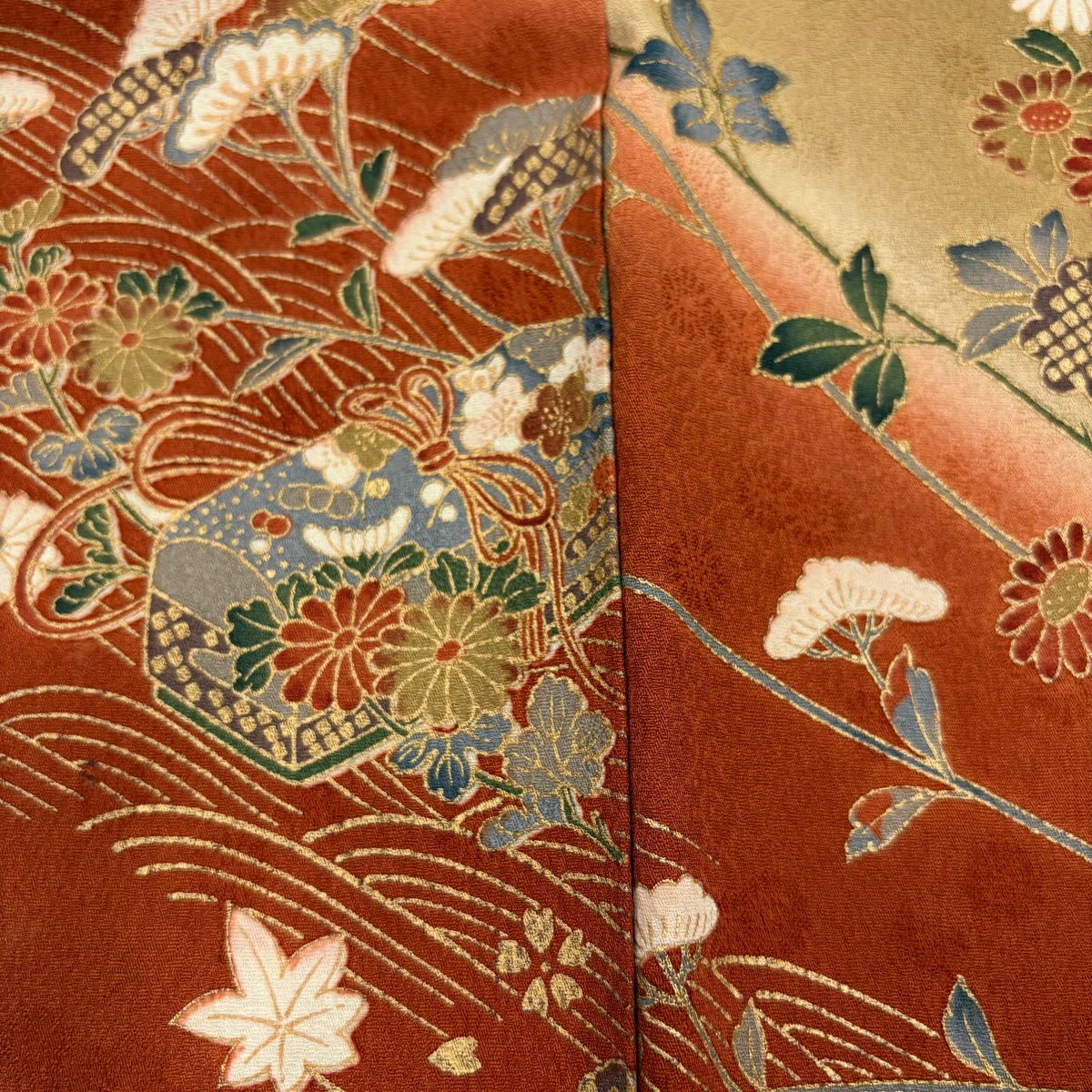 50%OFF 訪問着 身丈162cm 裄丈63cm S 袷 菊 流水 金彩 刺繍 オレンジ 正絹 秀品 K50