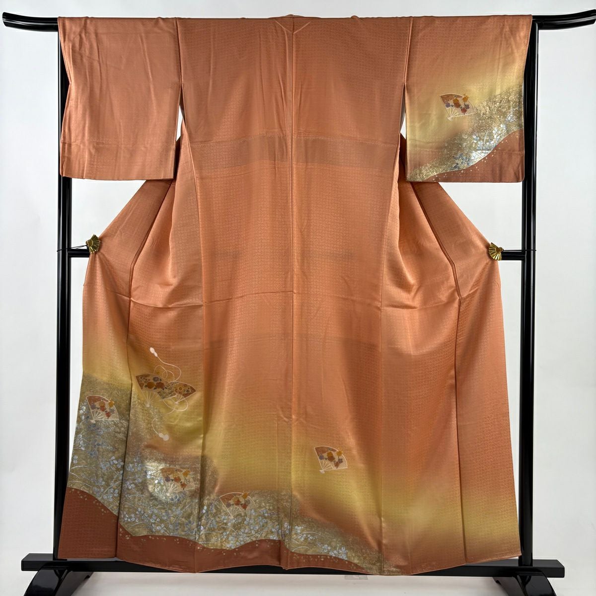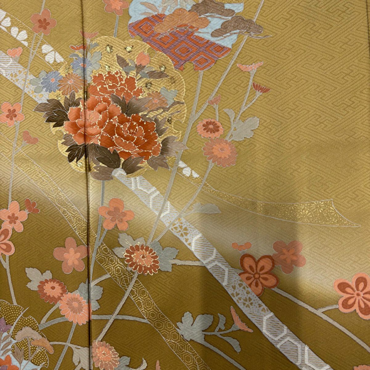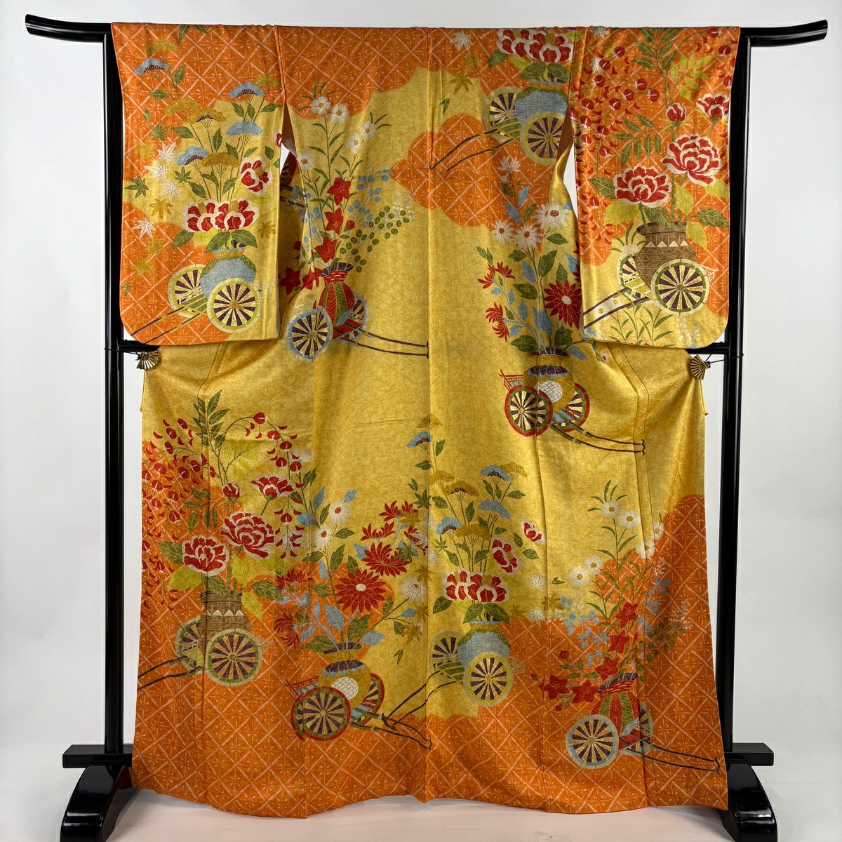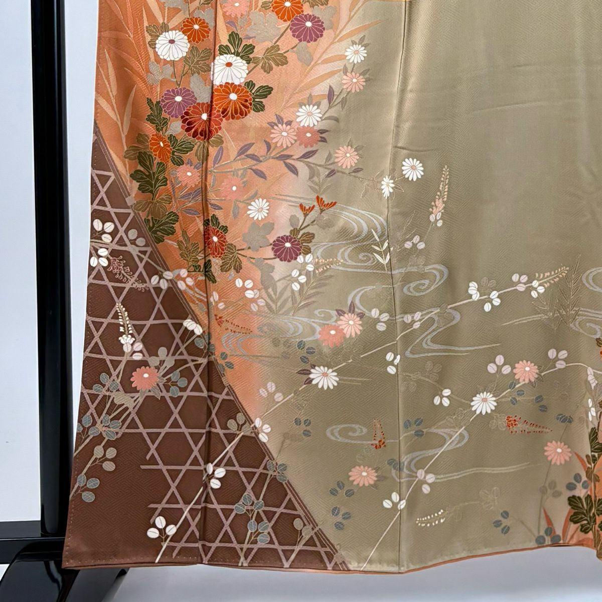 50%OFF 訪問着 身丈162cm 裄丈63cm S 袷 菊 流水 金彩 刺繍 オレンジ 正絹 秀品 K50