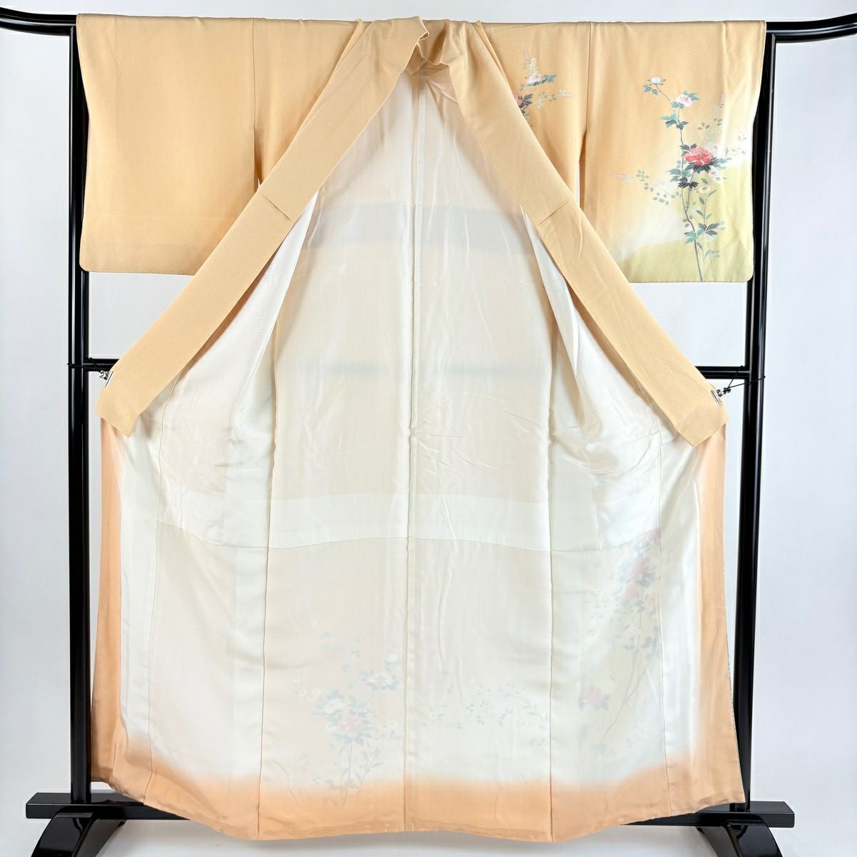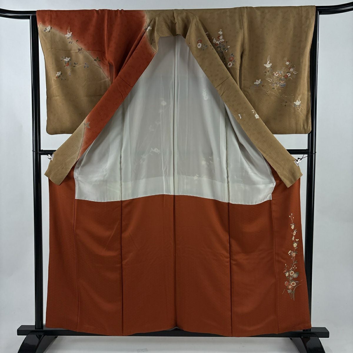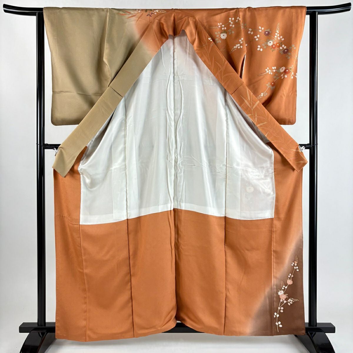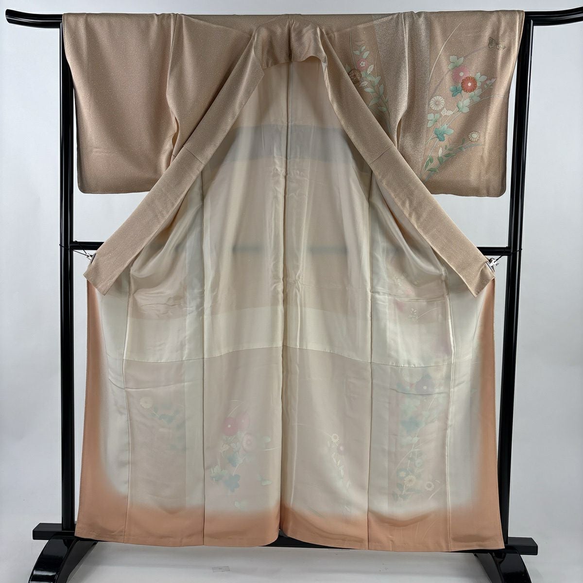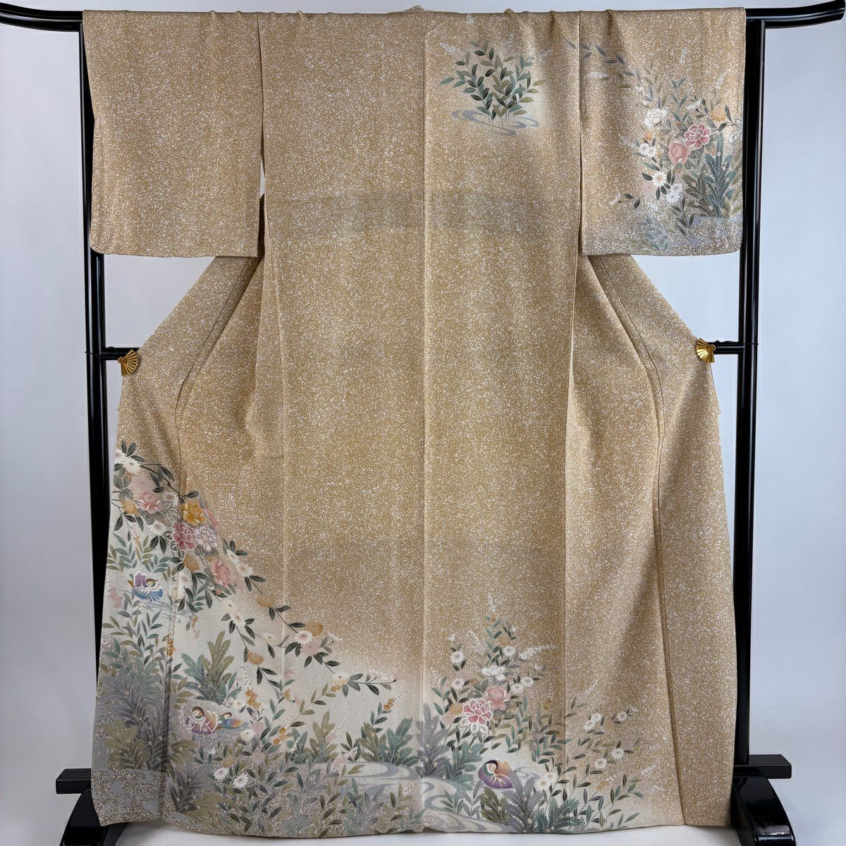 30%OFF 【美品】 訪問着 身丈169cm 裄丈66.5cm M 袷 草花 鴛鴦 薄茶色 正絹 秀品 K30