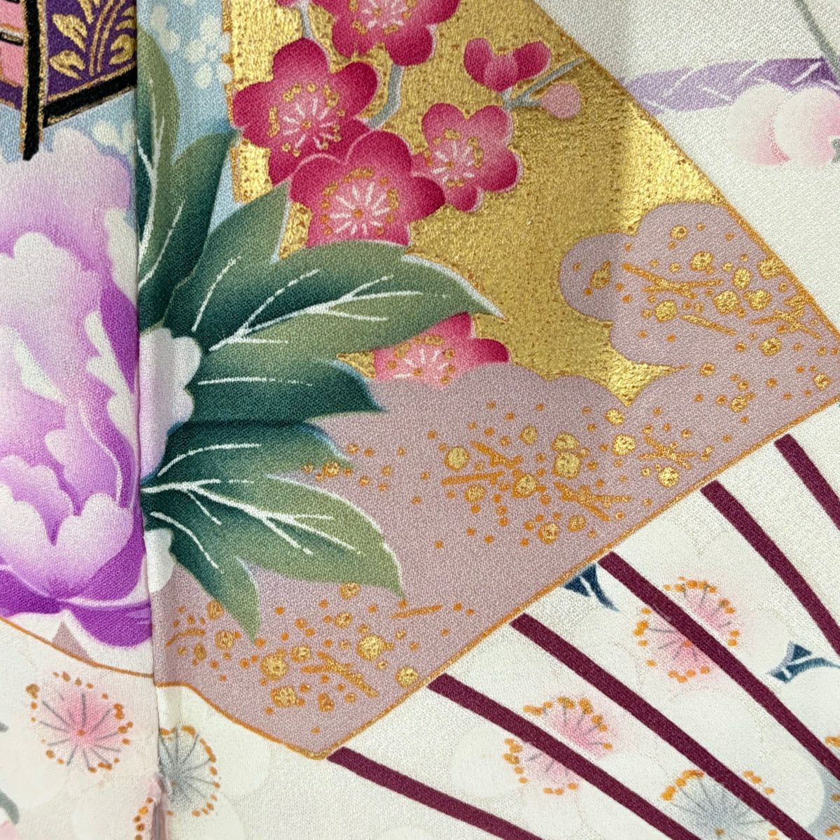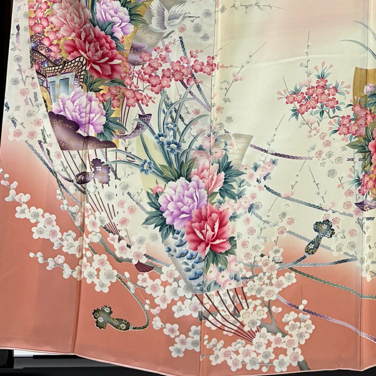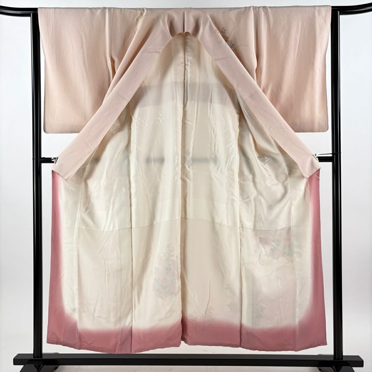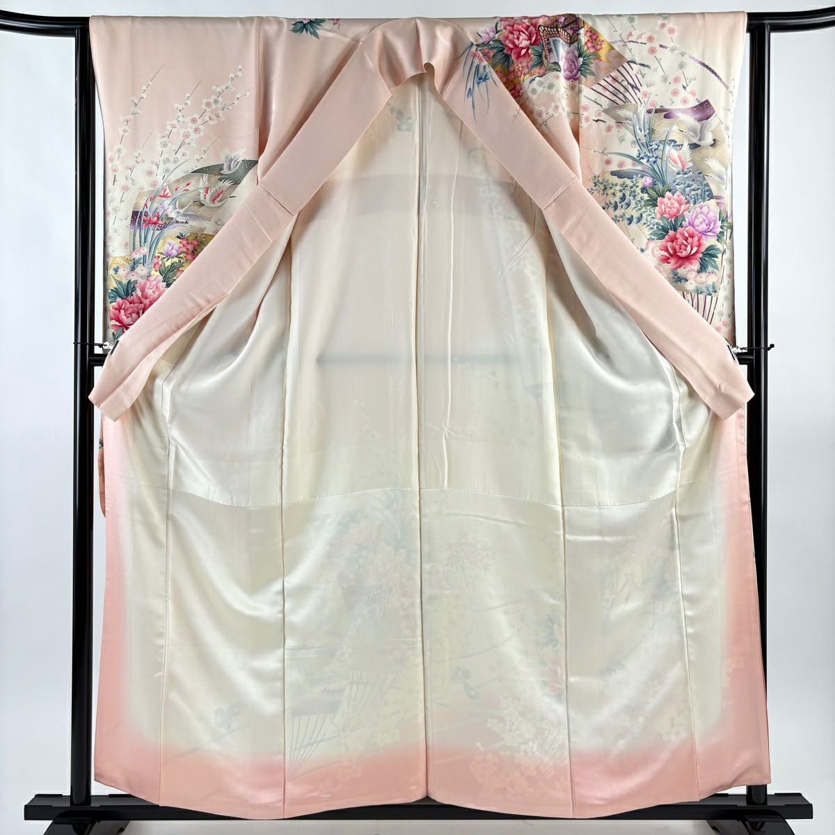 50%OFF 振袖 身丈159cm 裄丈63cm S 袷 扇 花鳥 金彩 ぼかし 薄ピンク 正絹 秀品 K50