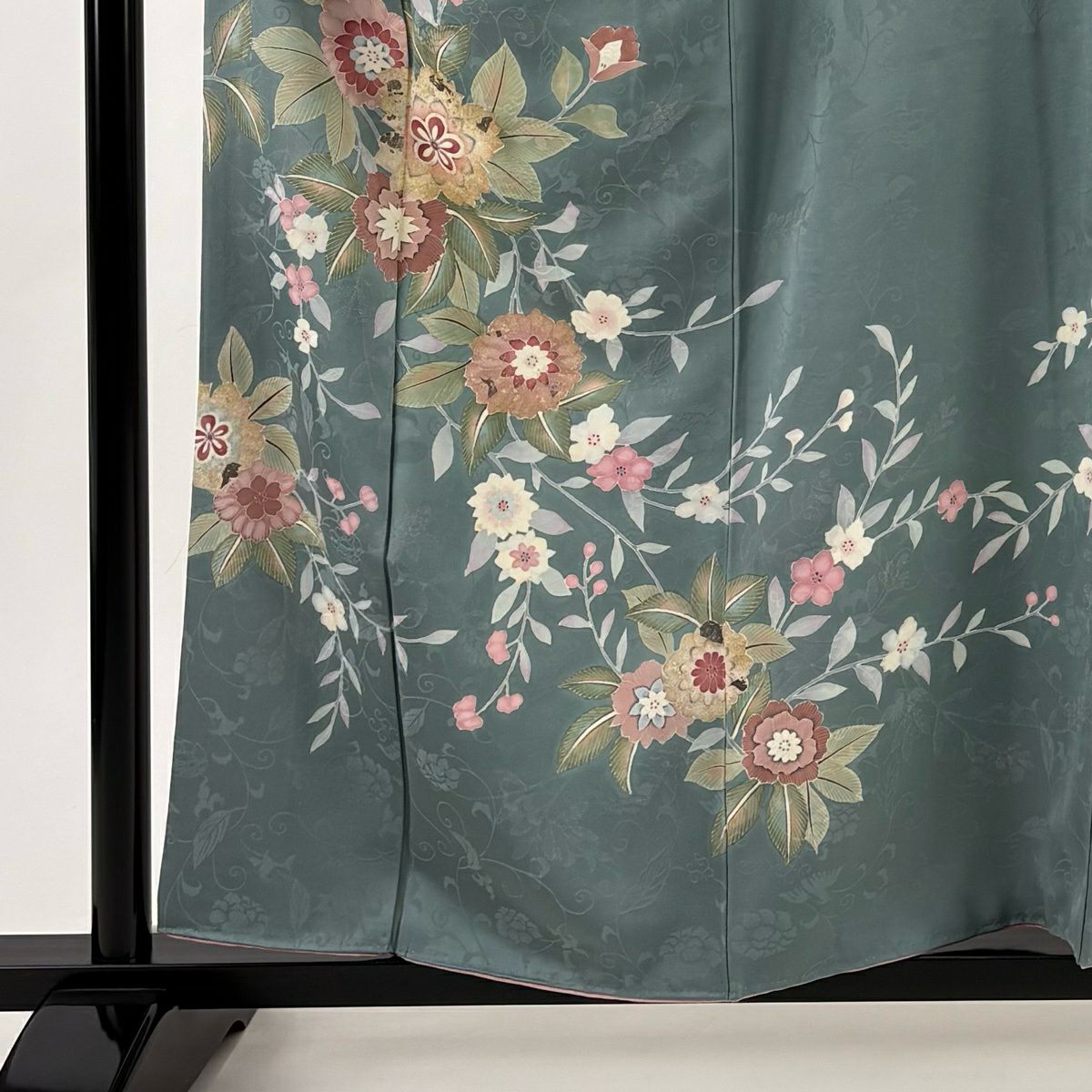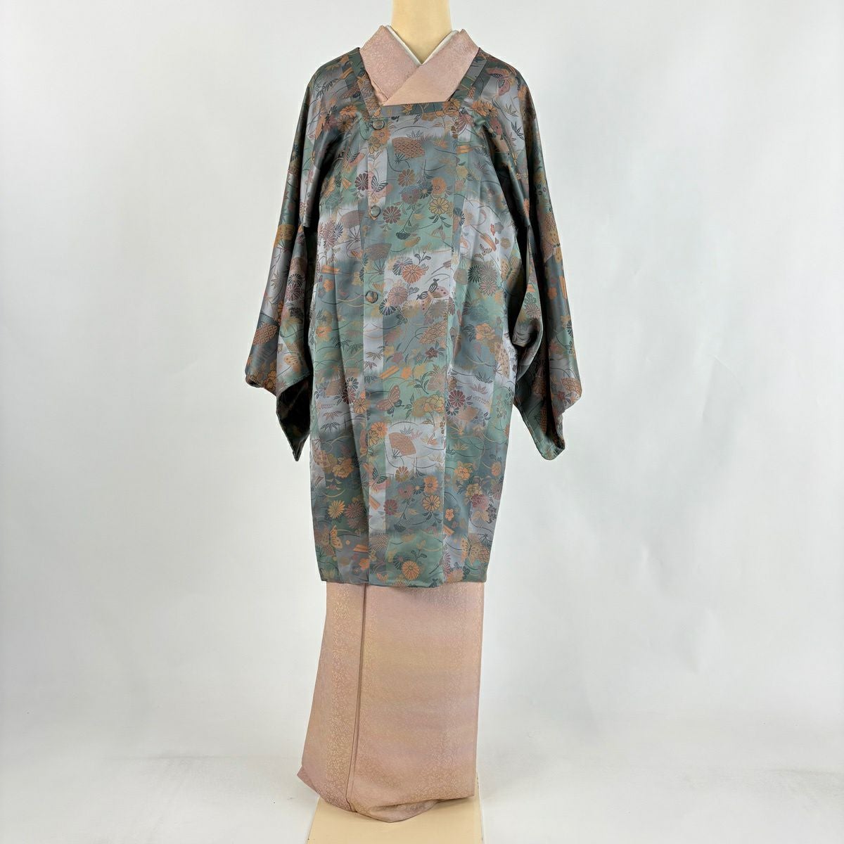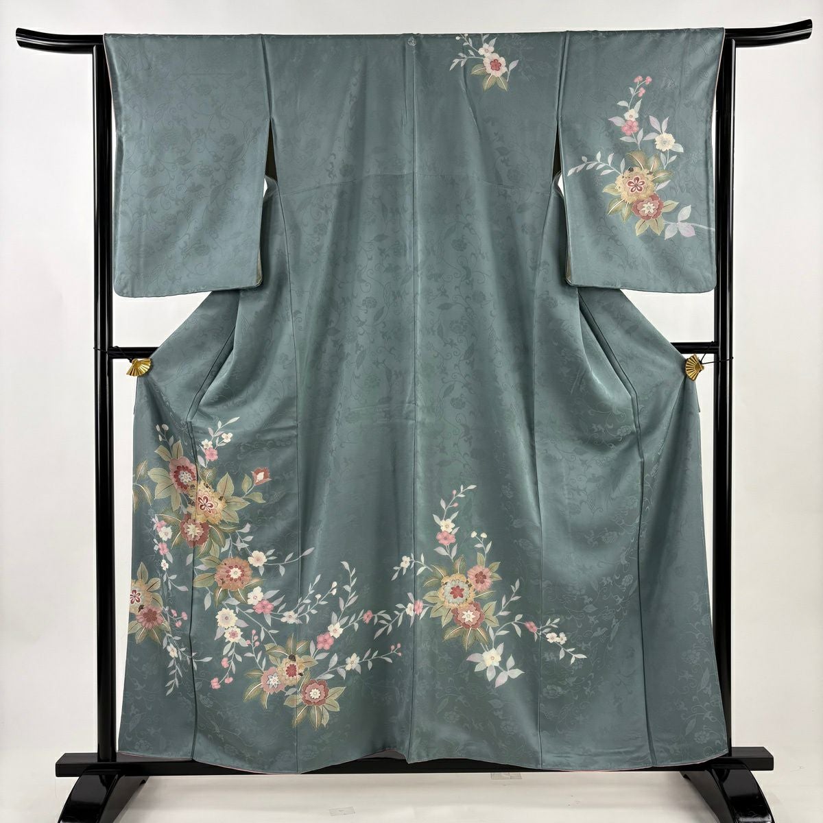 50%OFF 訪問着 身丈158.5cm 裄丈65cm M 袷 草花 地紋 金彩 灰緑 正絹 秀品 一つ紋 K50